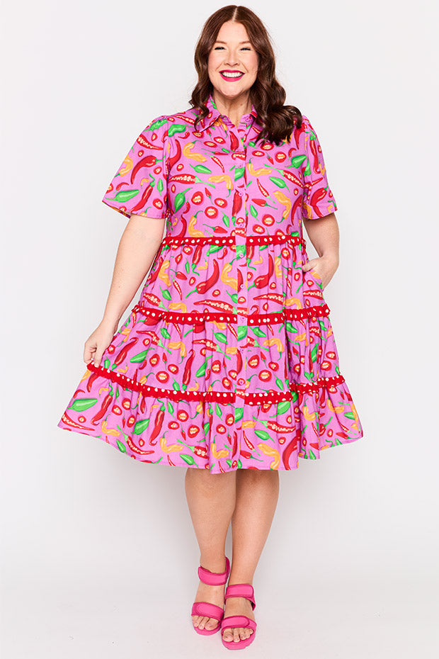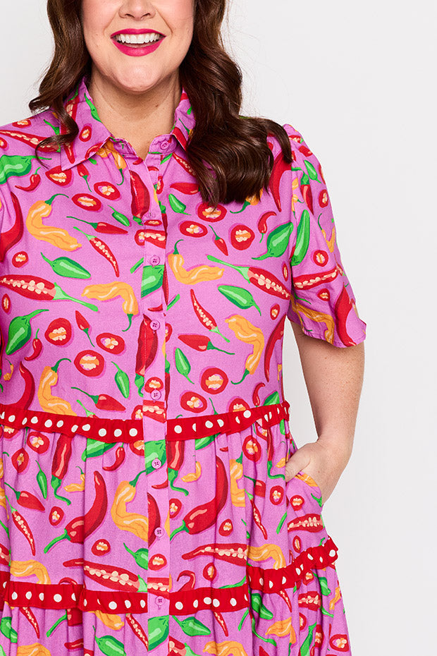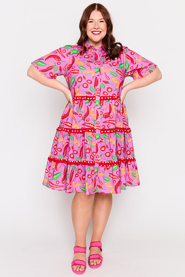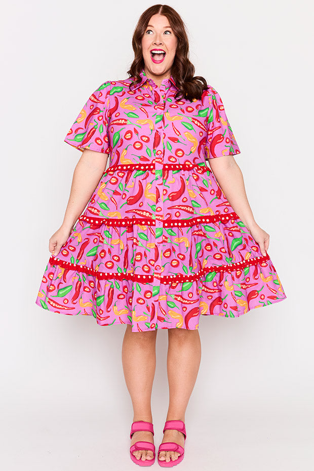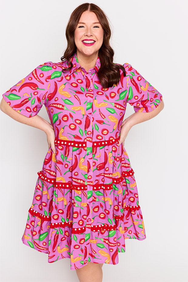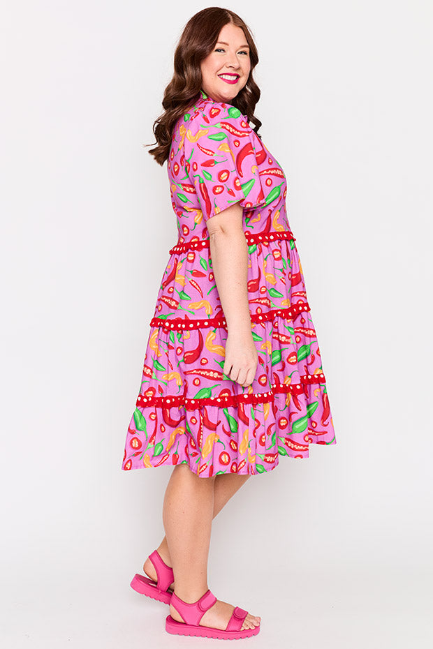 Turn up the heat in our Celebrate Dress featuring our sizzling Pink Hot Chilli print, exclusively designed by the ever talented Bec Woodland Artist. This dress brings a bold pop of spice to your wardrobe. Get ready to ignite your style and spice up your day with this eye-catching, fiery frock!