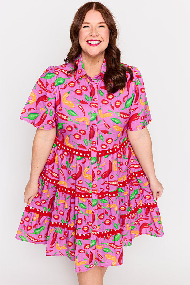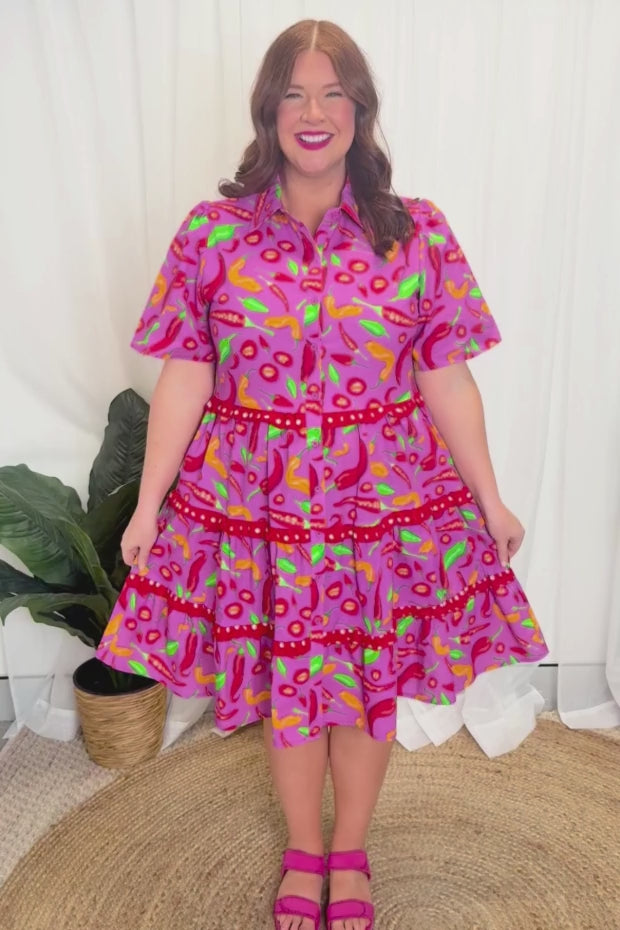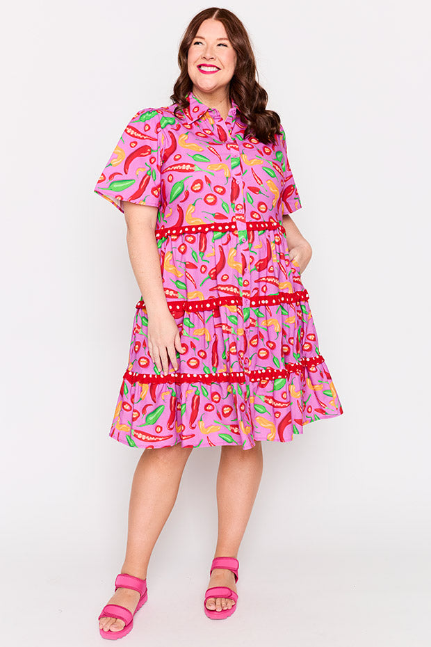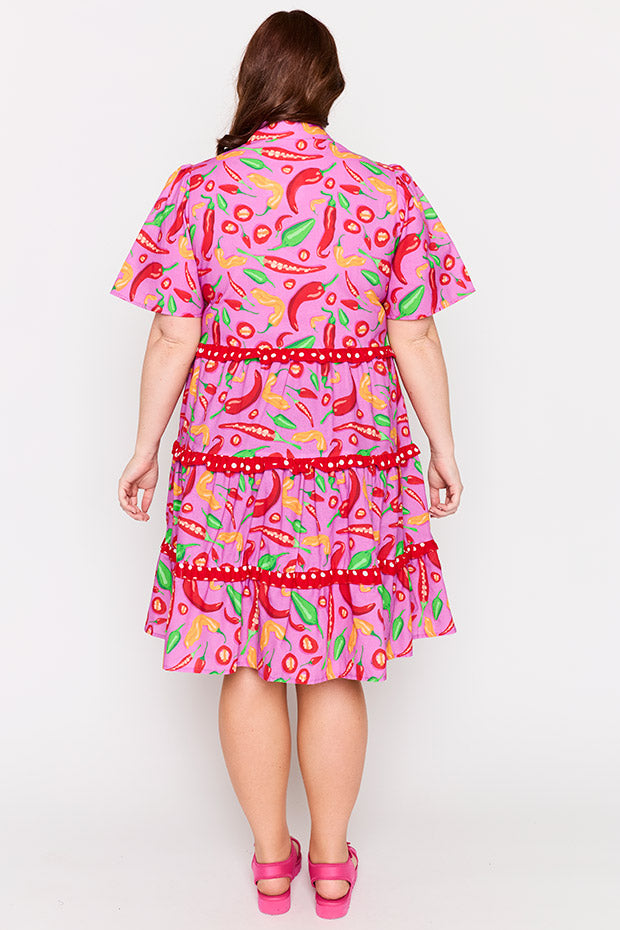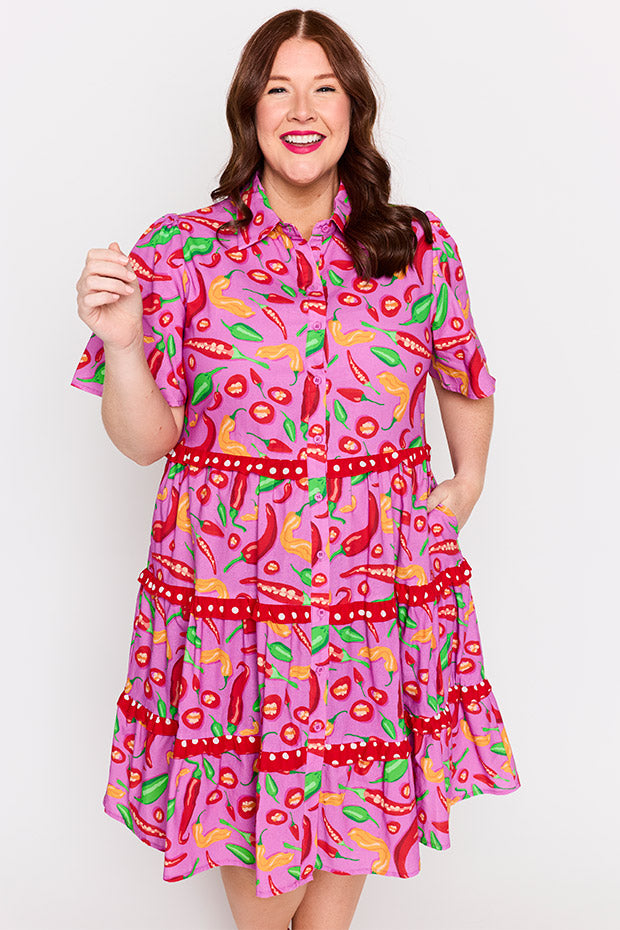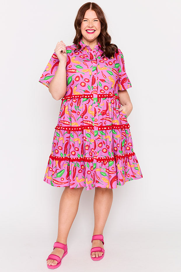 Turn up the heat in our Celebrate Dress featuring our sizzling Pink Hot Chilli print, exclusively designed by the ever talented Bec Woodland Artist. This dress brings a bold pop of spice to your wardrobe. Get ready to ignite your style and spice up your day with this eye-catching, fiery frock!