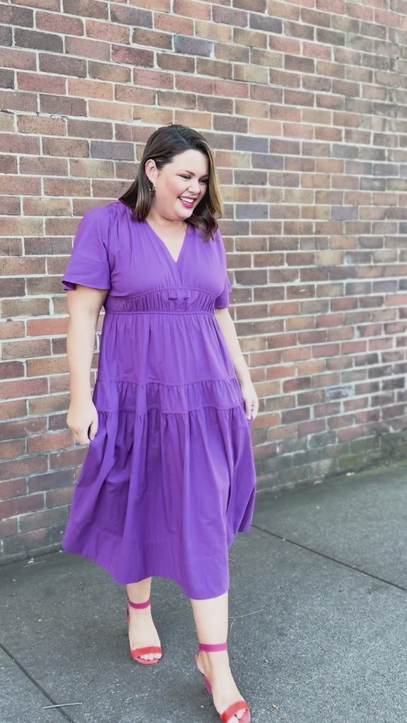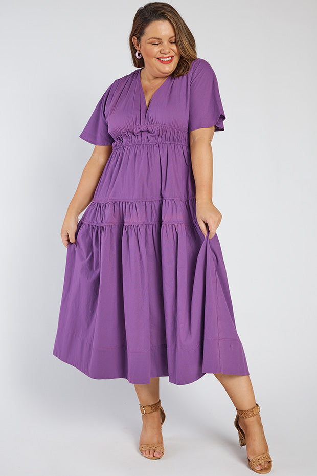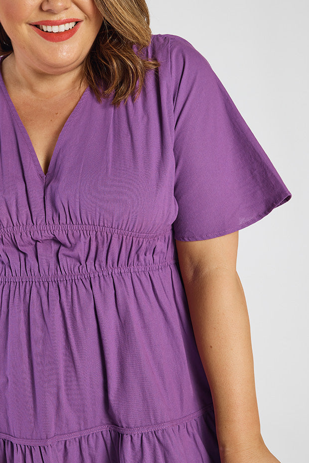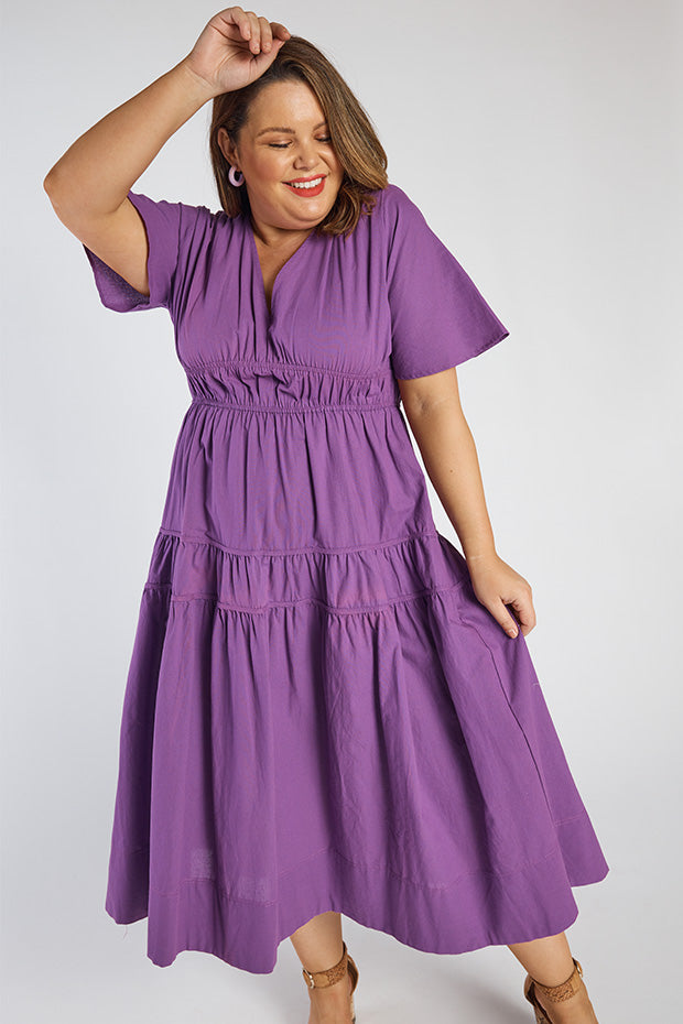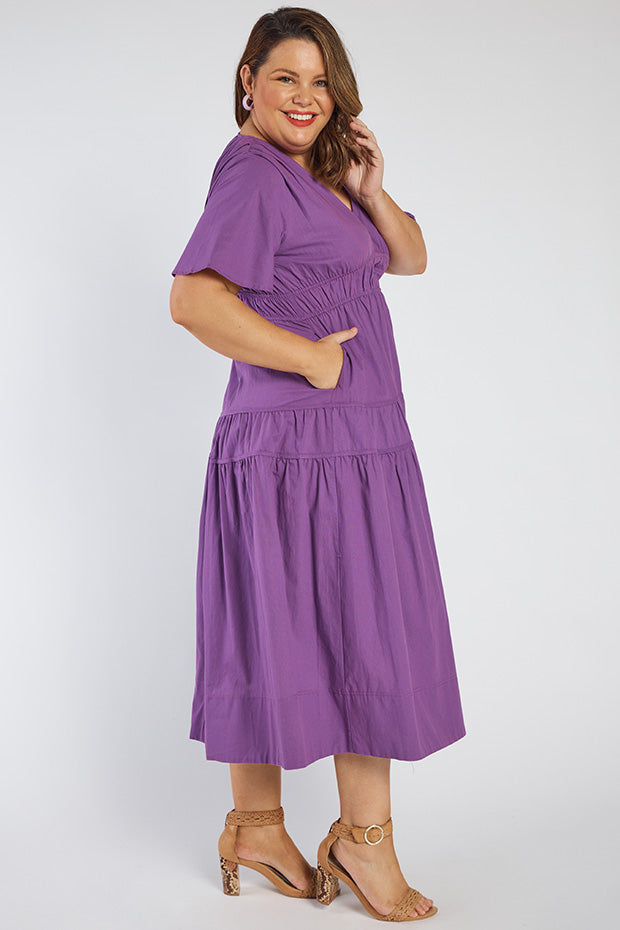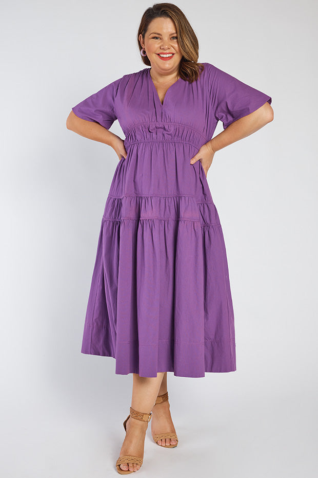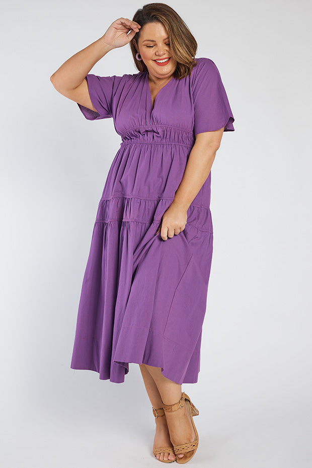This light weight cotton dress features a fitted v neck bodice, with short wide sleeves & elastic feature under bust and waist. We love the full tiered mid length skirt and of course.. the pockets!