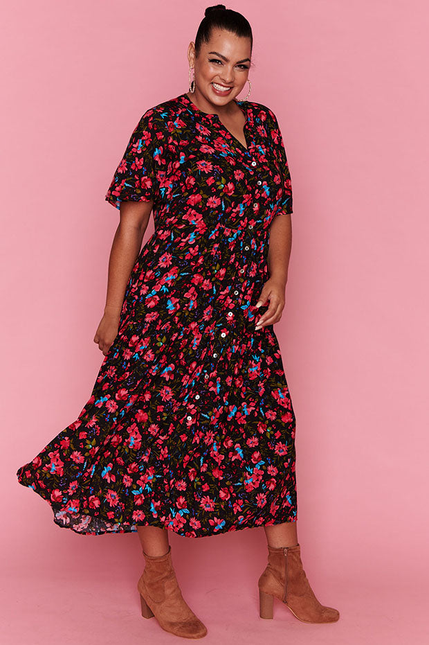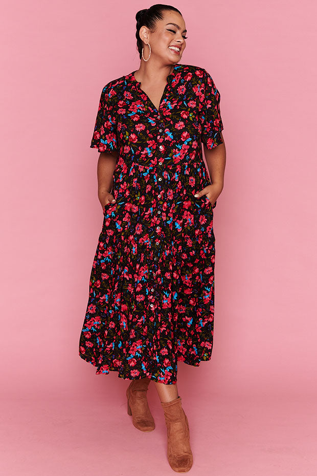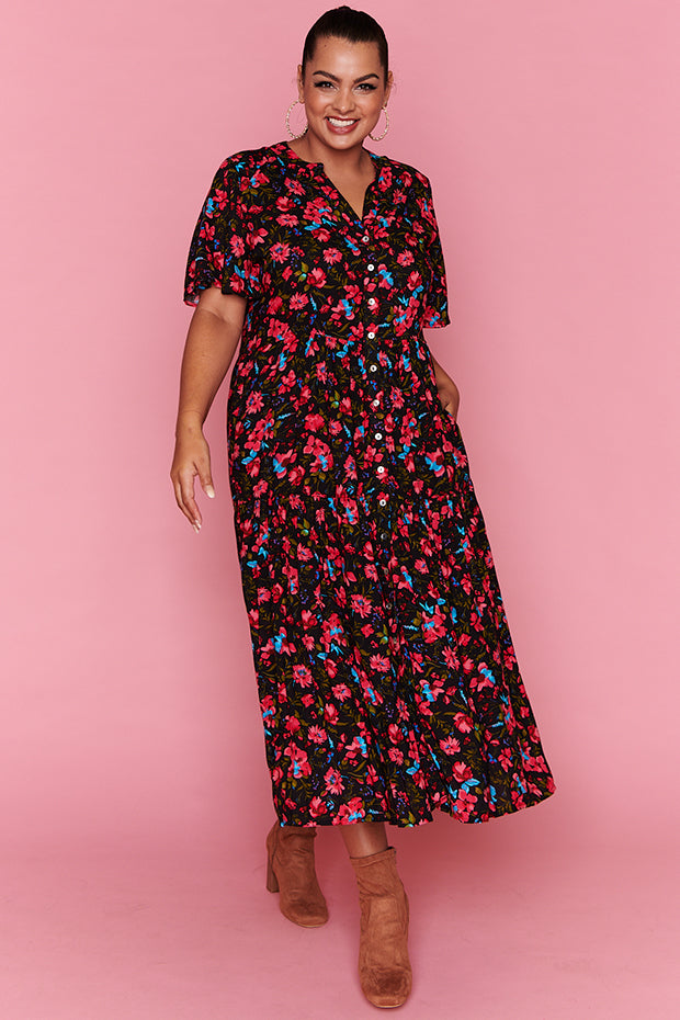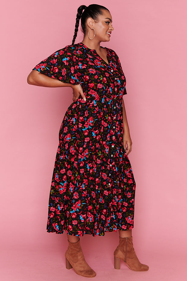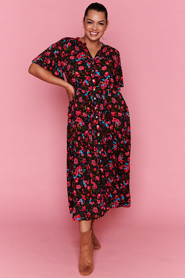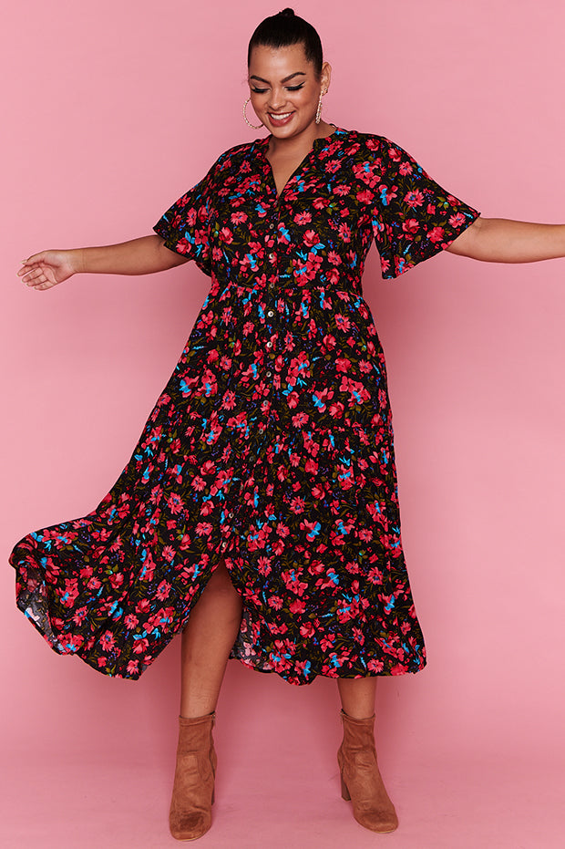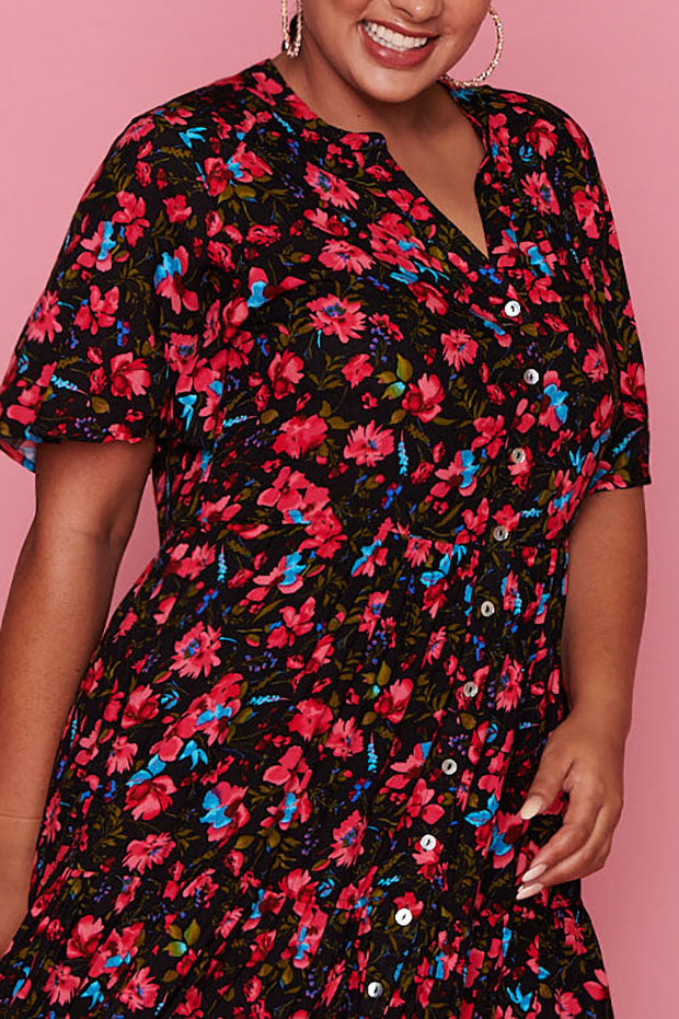 It features a full button up front & a V-neckline. We love the flared wide sleeves & the tiered skirt that created a twirly silhouette!