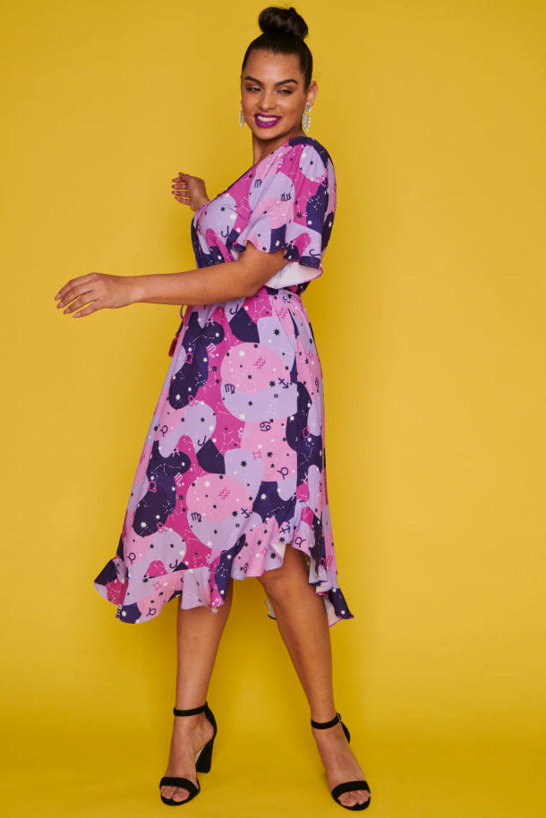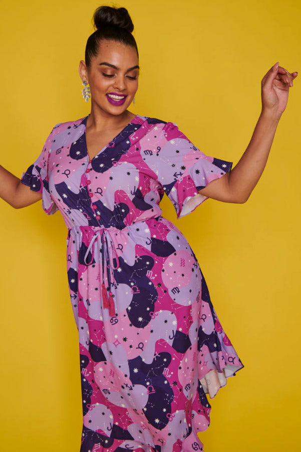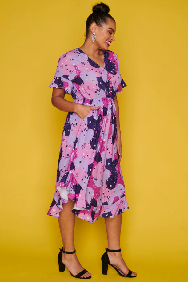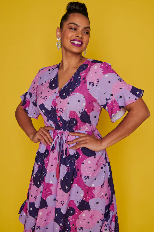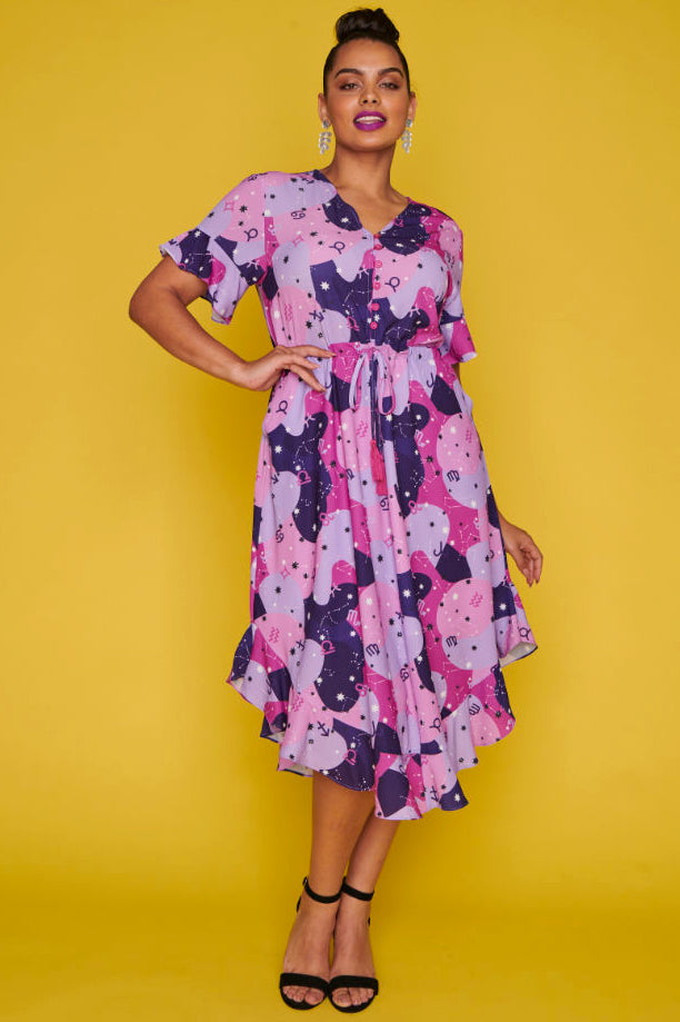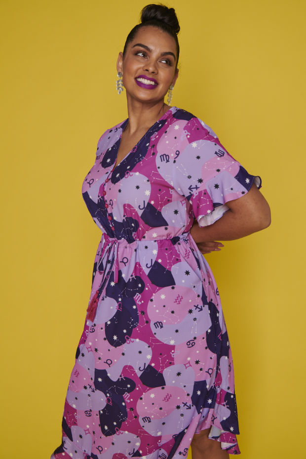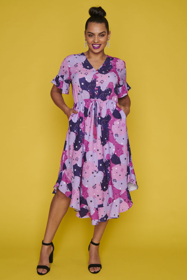 It fits perfectly and I love anything in purple and this dress delivers! Very light and easy to wear.