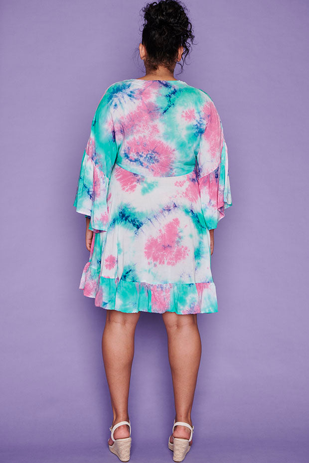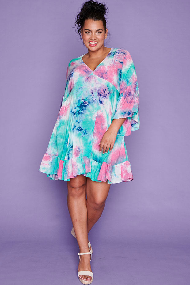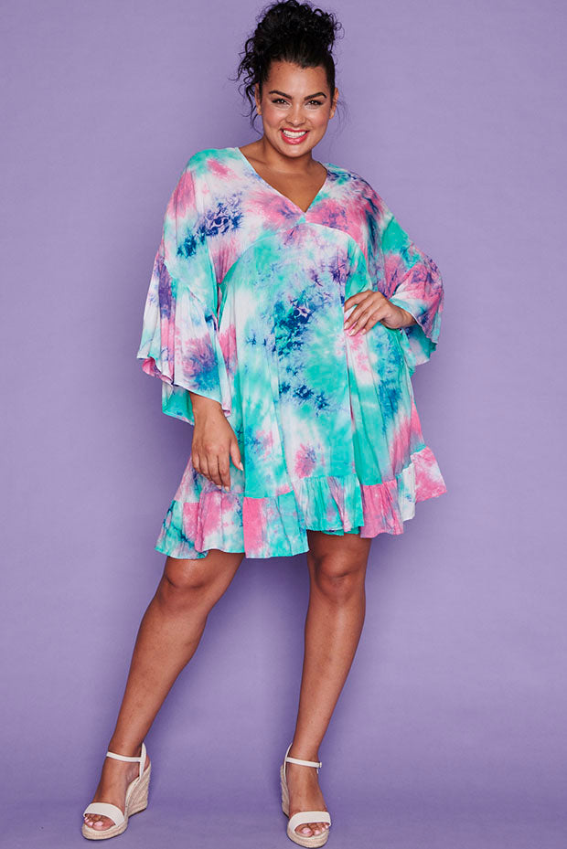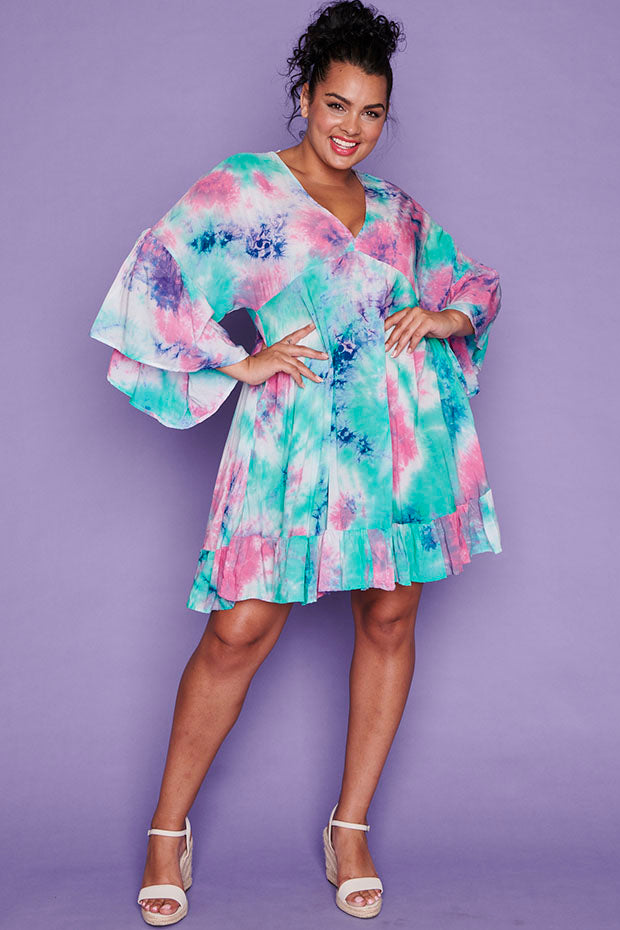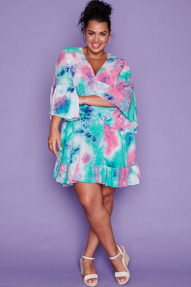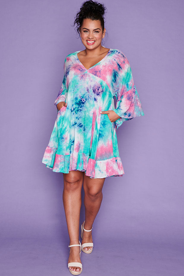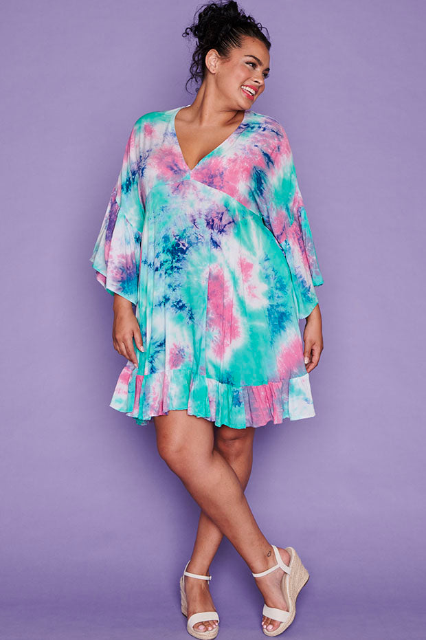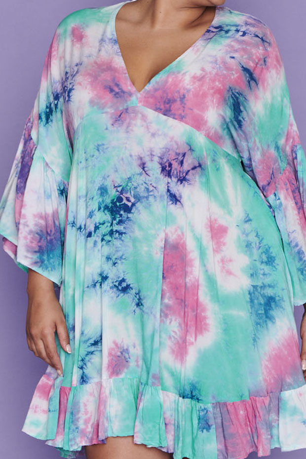 Designed with a deep V neckline, empire waistline which sits on, or under the bust, and wide-fit bell sleeves. The silhouette is an oversized swing dress style ending in a feminine & flirty frilled hemline! 💃
