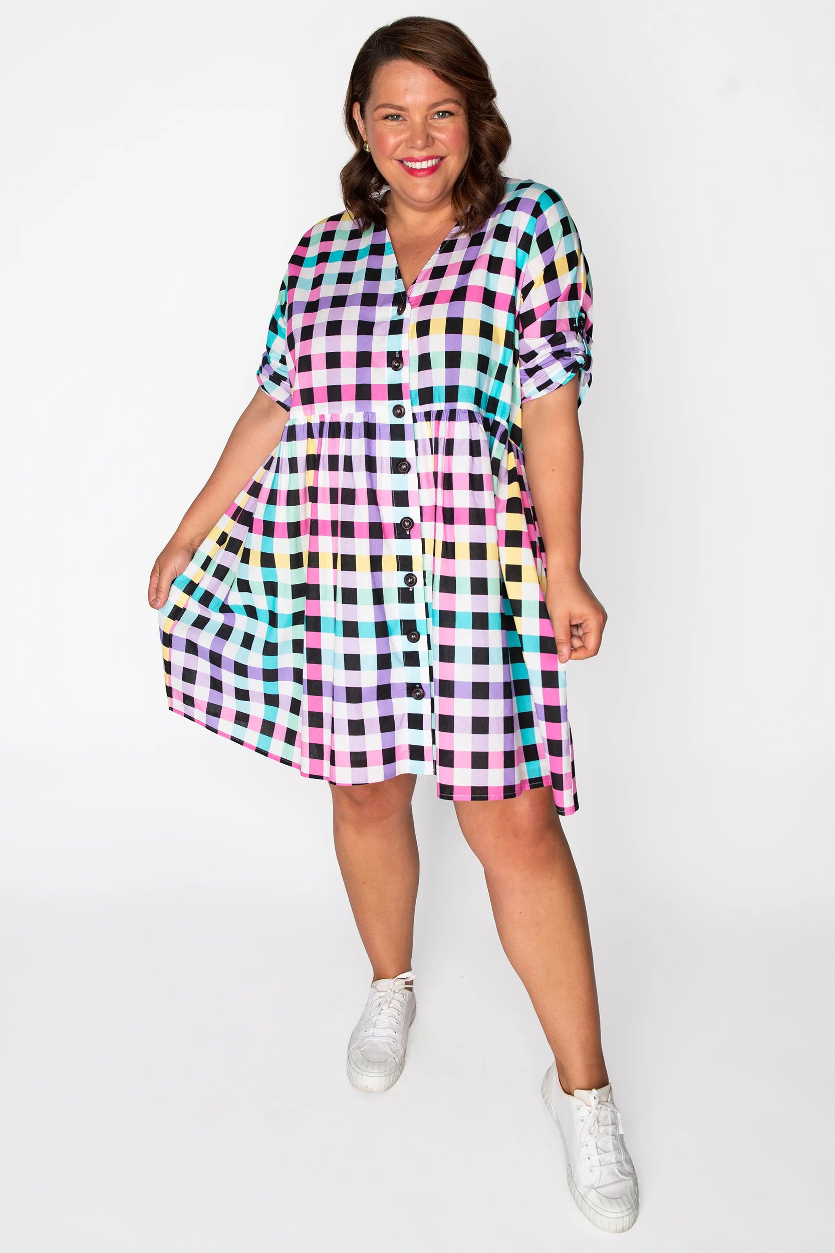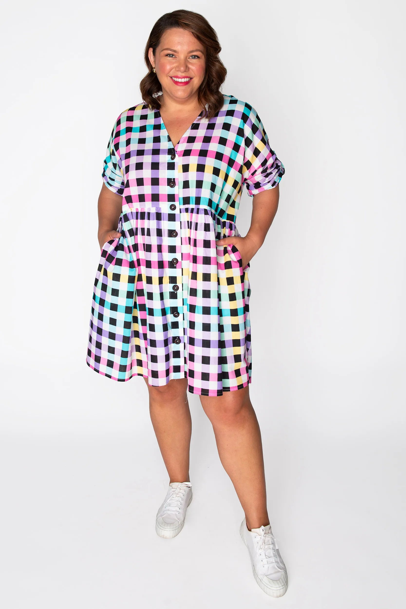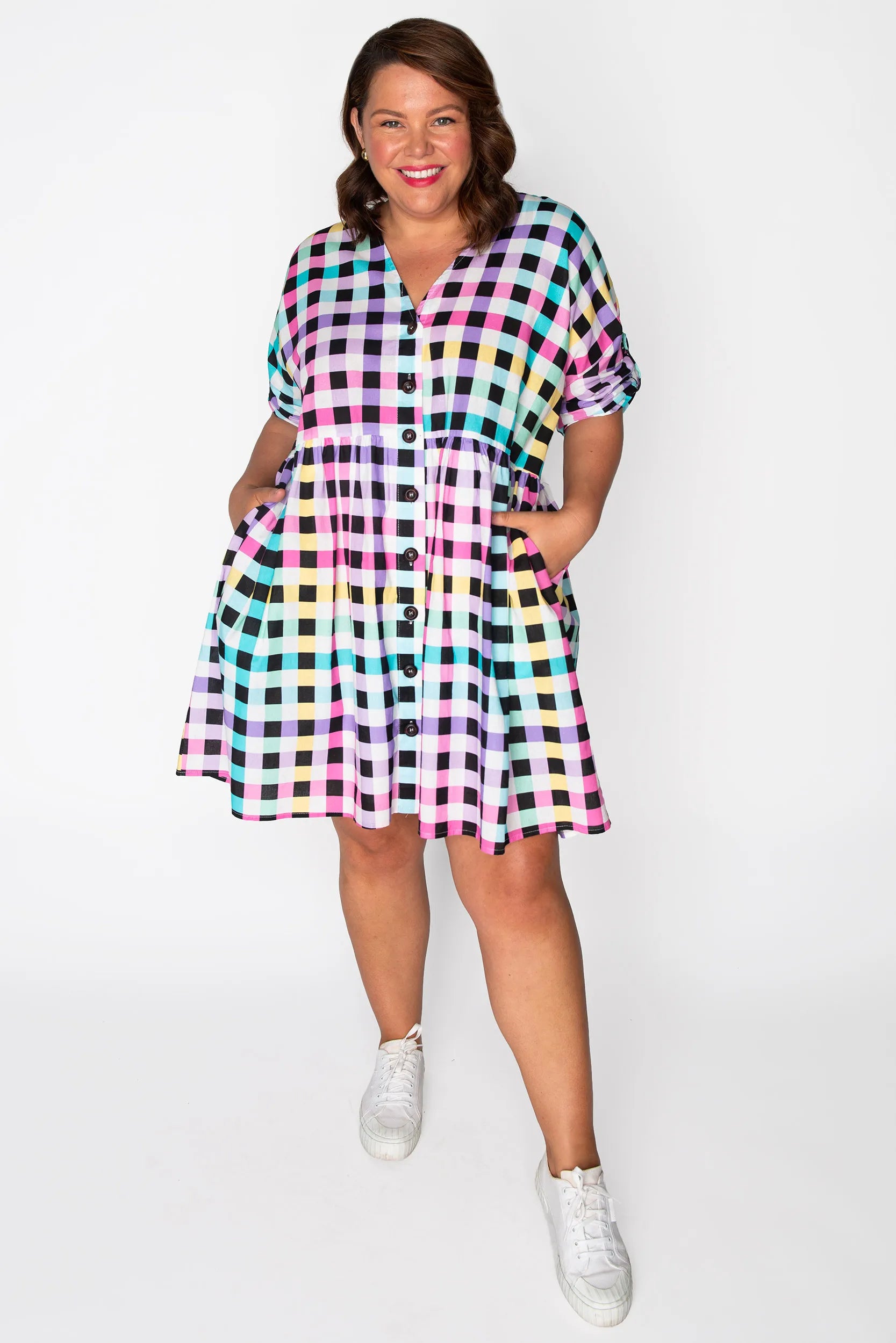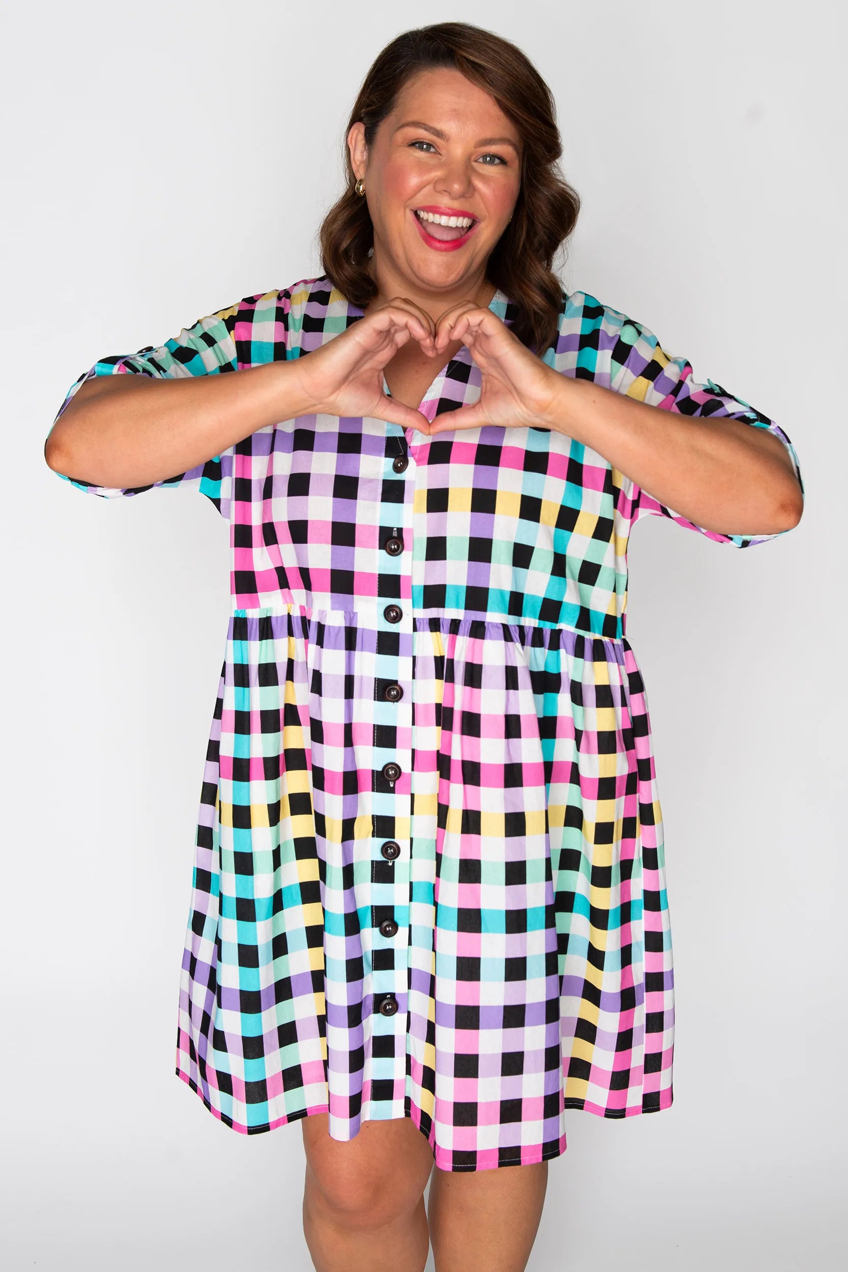 Our most eye catching Siena Cotton Dress dress yet, in our exclusively designed Black Rainbow Gingham by our very own Kim from Zonkt® . Bring a retro vibe to school for the perfect Teachers dress, or for a light weight Summer Dress addition!