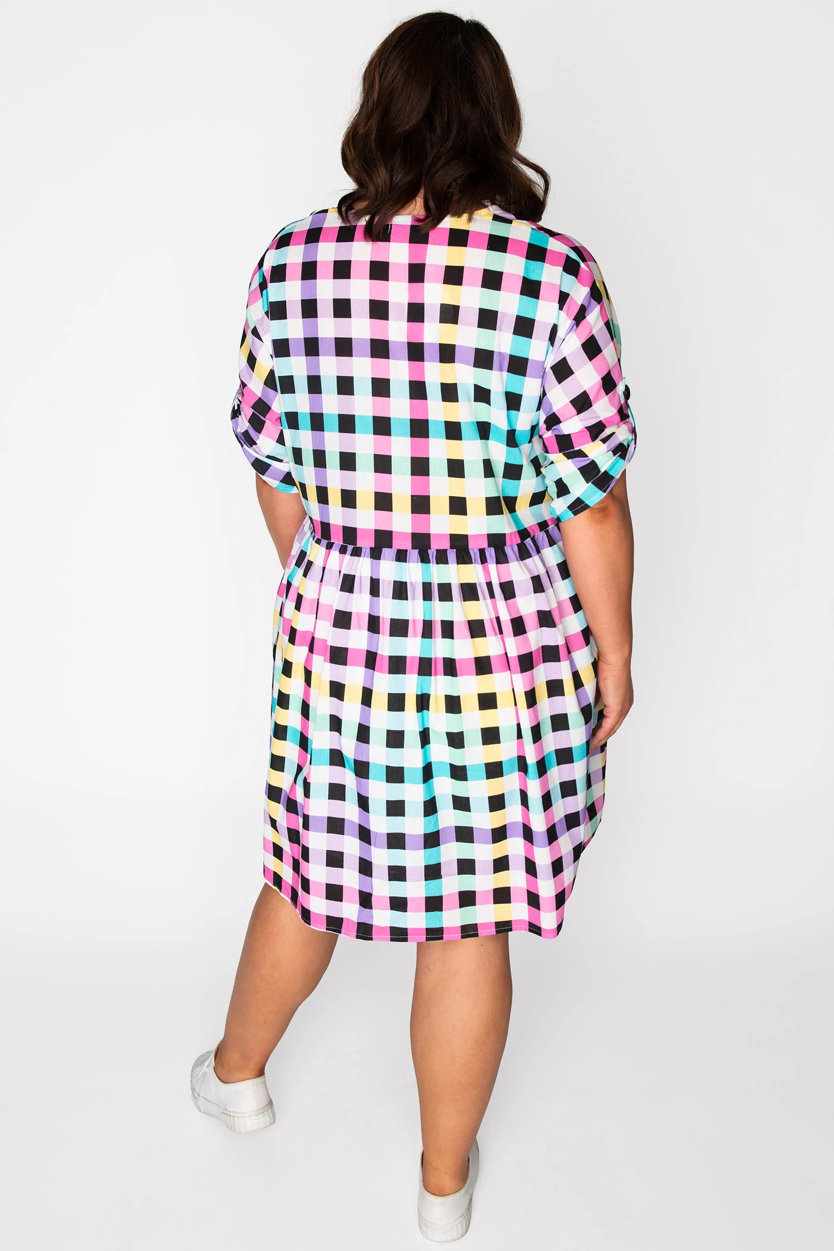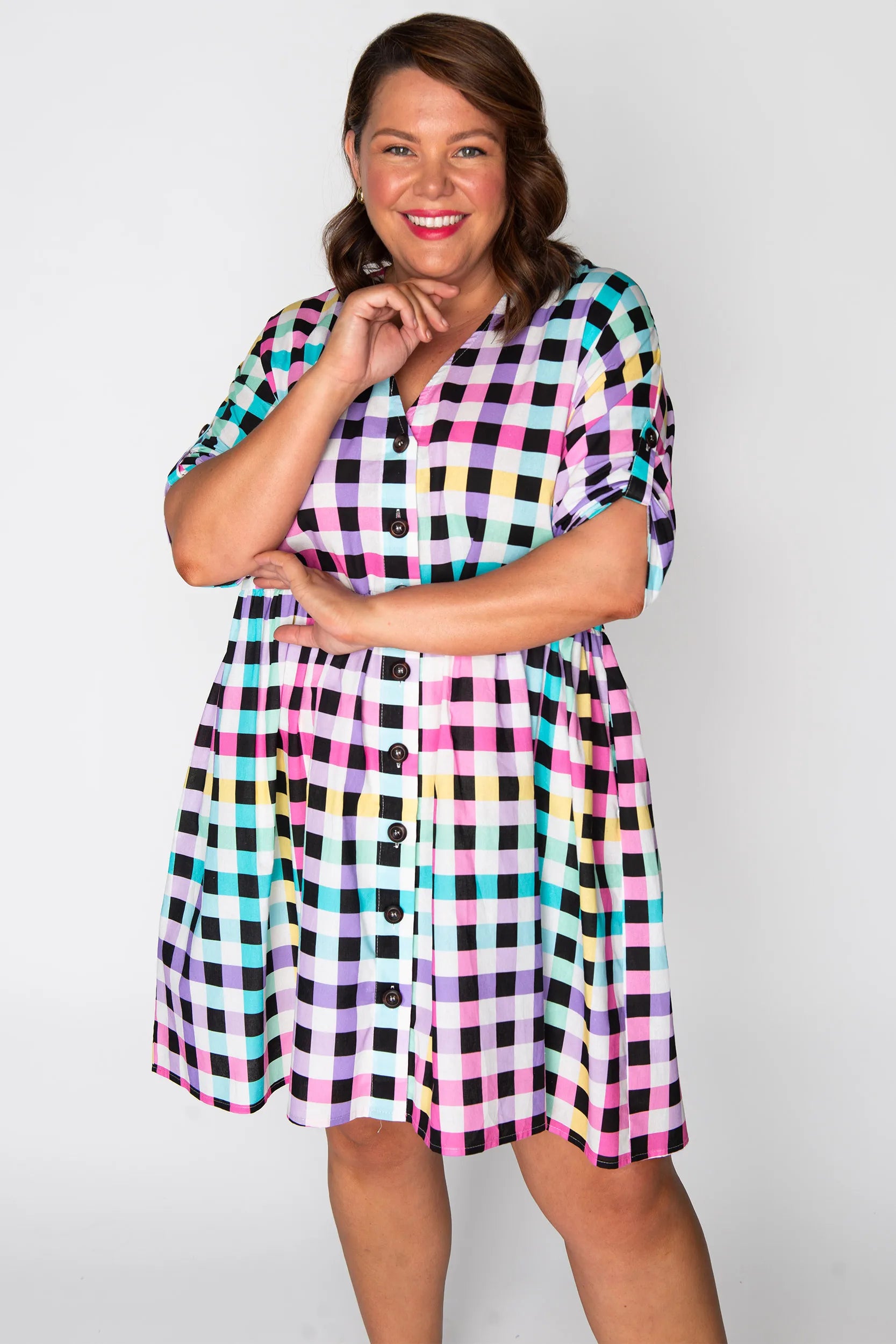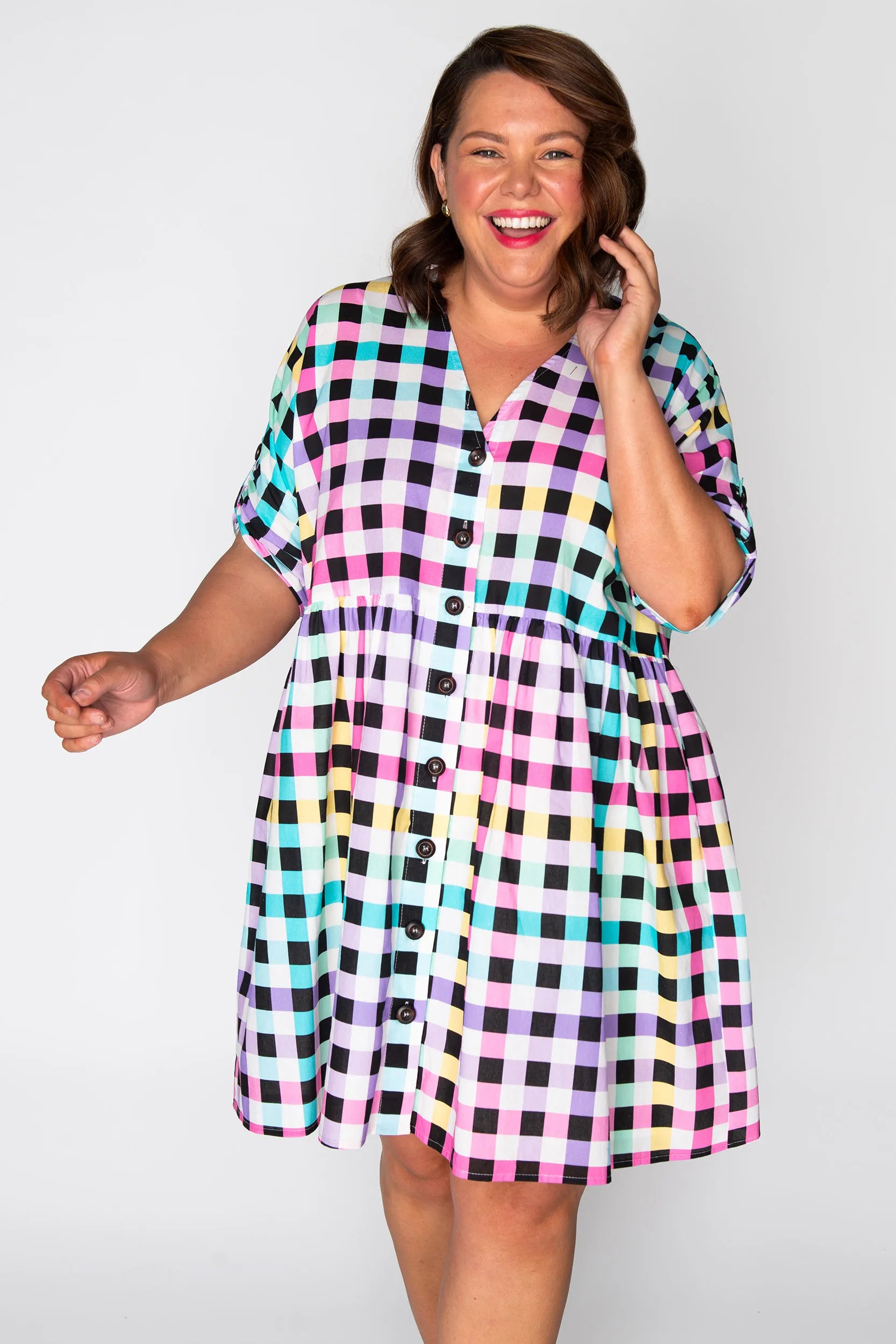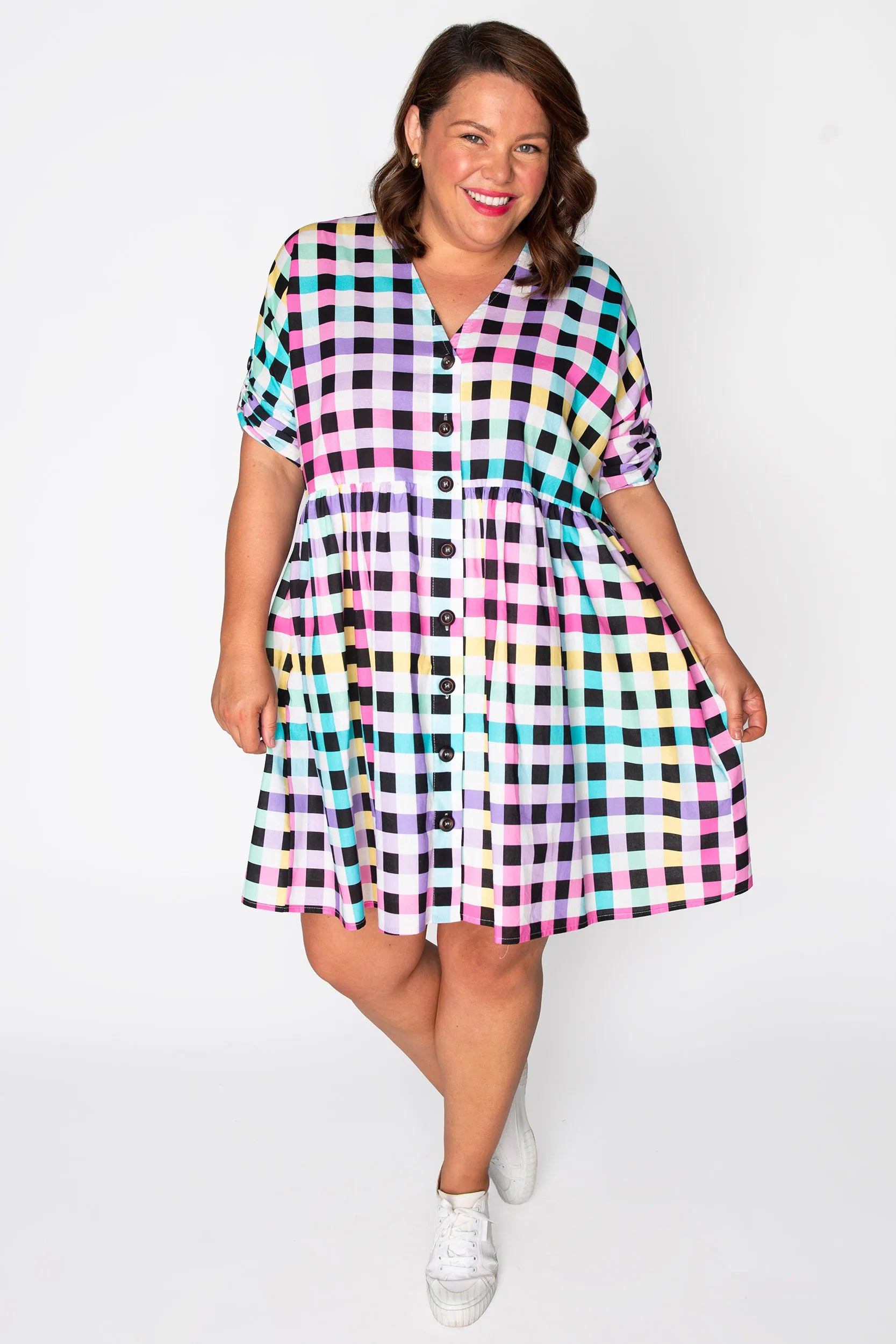Our most eye catching Siena Cotton Dress dress yet, in our exclusively designed Black Rainbow Gingham by our very own Kim from Zonkt® . Bring a retro vibe to school for the perfect Teachers dress, or for a light weight Summer Dress addition!
