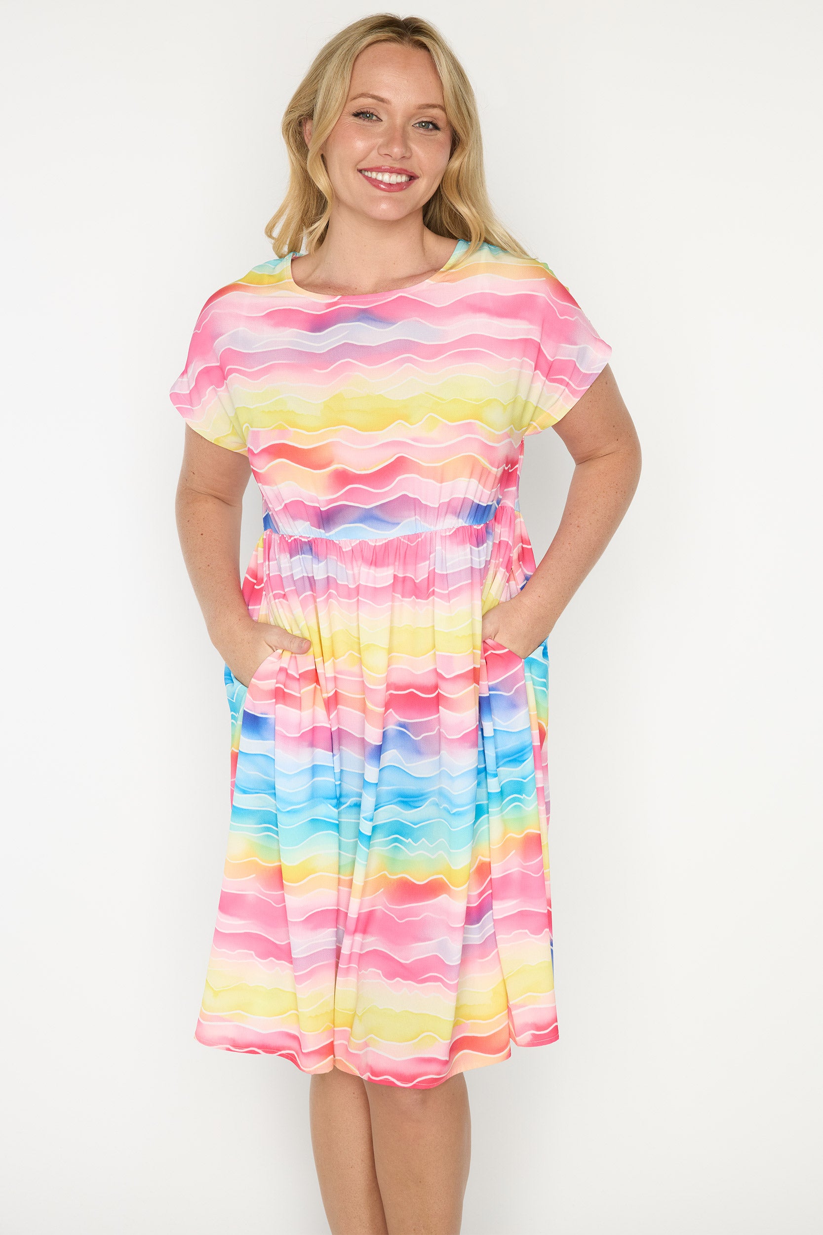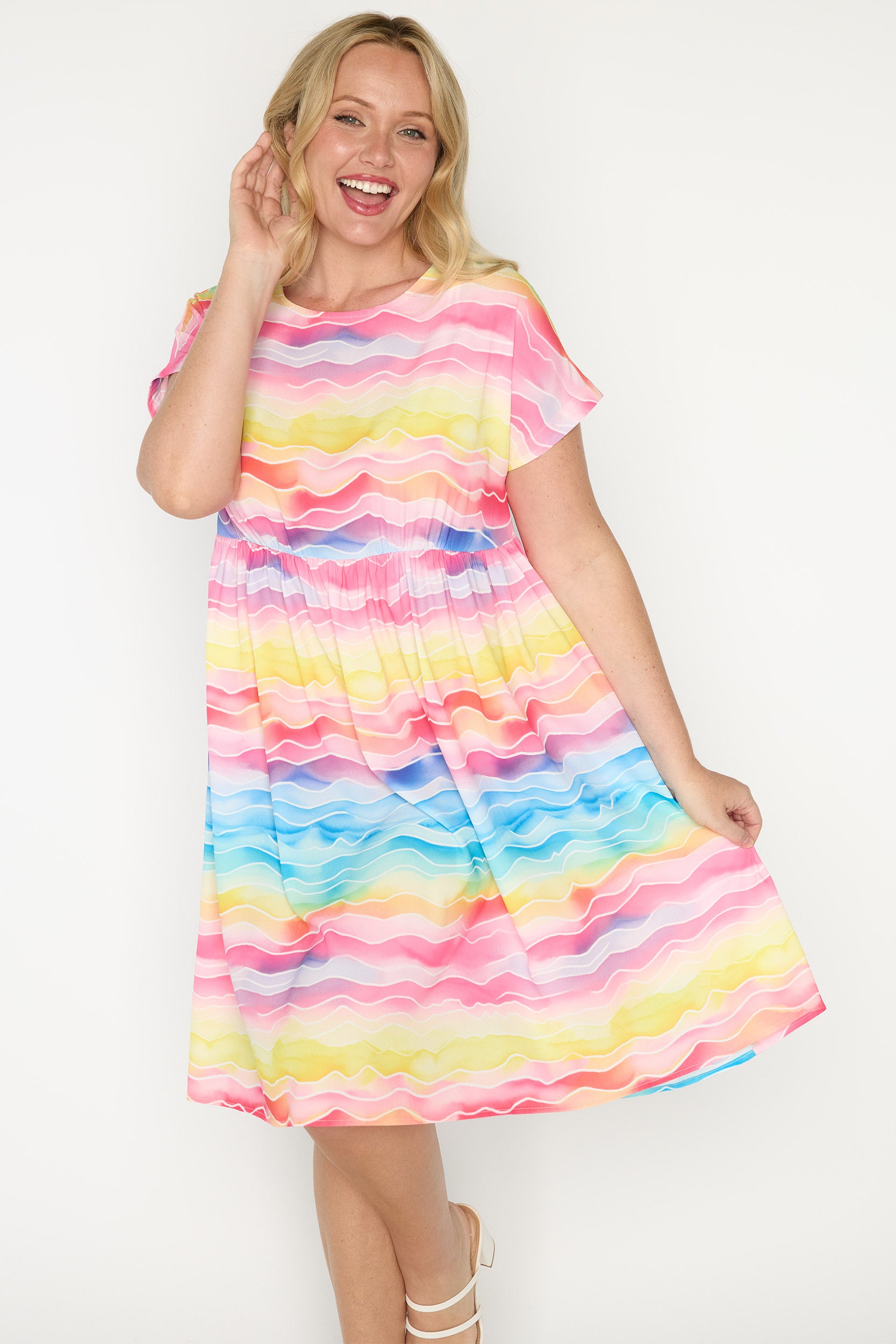 Our Bam Dress featuring our Rainbow River print is bright, playful, and full of movement. The vibrant, flowing Fun Print adds cheerful energy to this lightweight Summer Dress perfect for warm days. Also making it a fun yet polished Teacher Dress. Professional, comfortable, and full of personality.