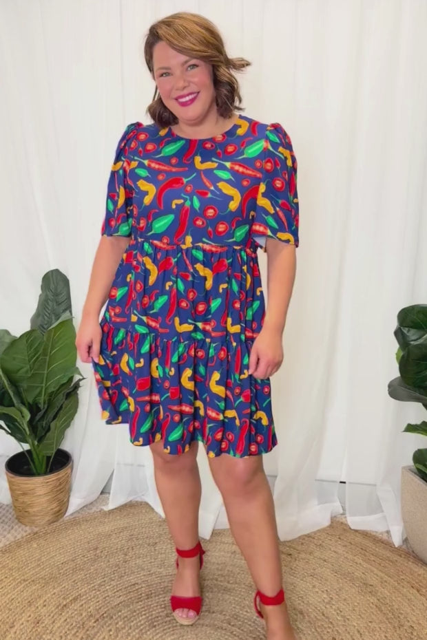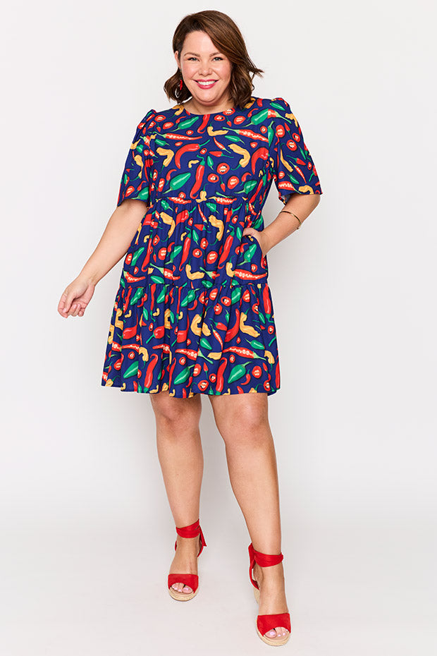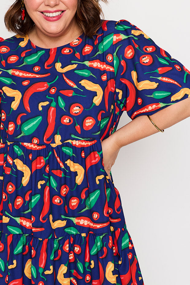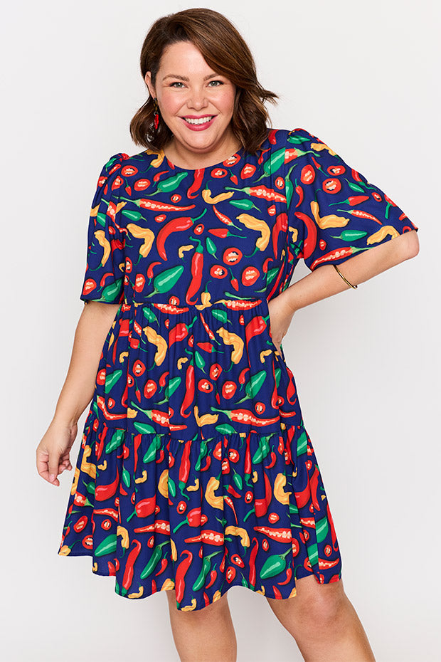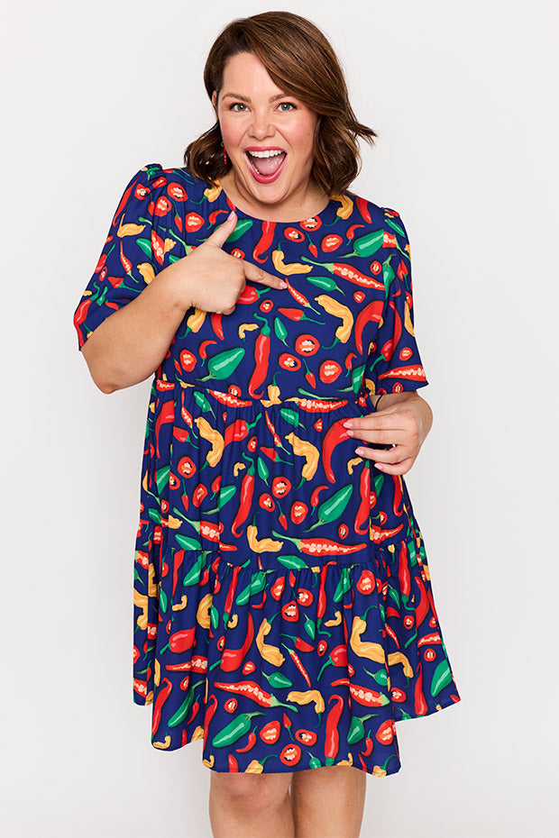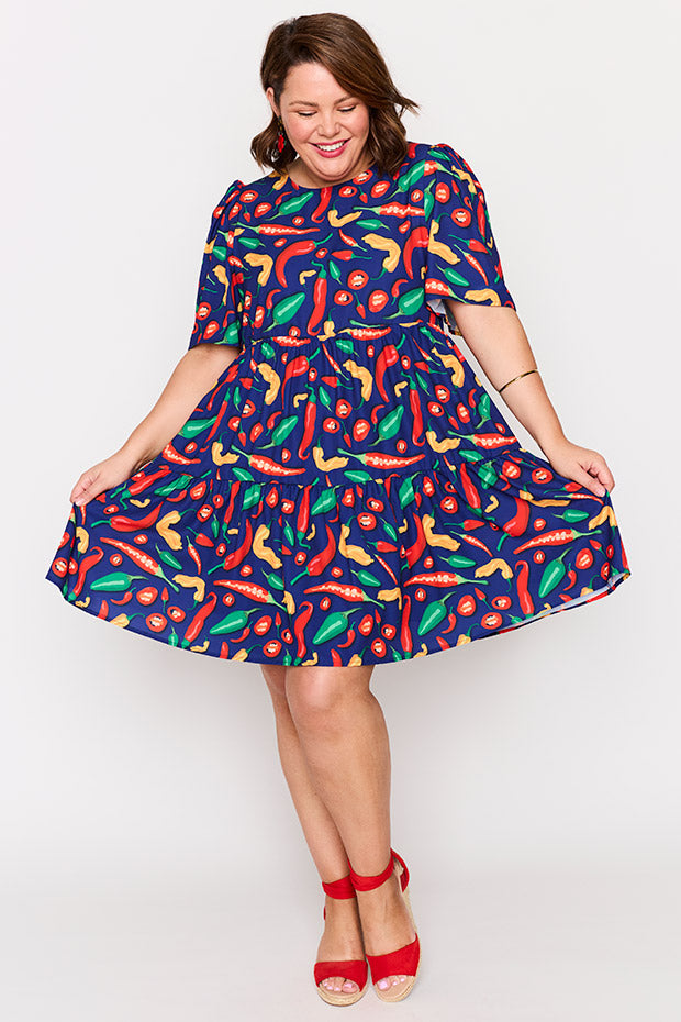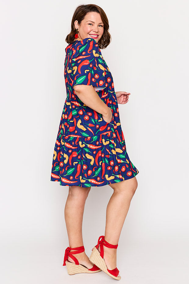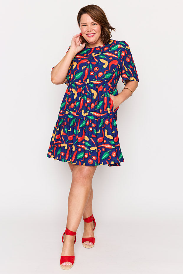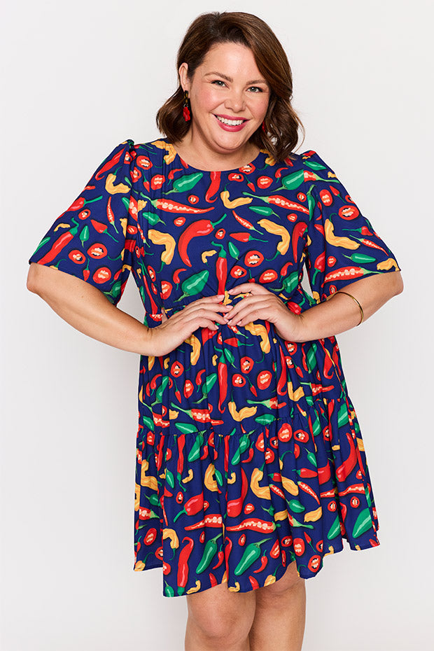 Turn up the heat in our Jackson Dress featuring our sizzling Navy Hot Chilli print, exclusively designed by the ever talented Bec Woodland Artist. This fiery frock brings a bold pop of spice and fun prints to your wardrobe. Get ready to ignite your summer dress style and spice up your day with this eye-catching statement piece!