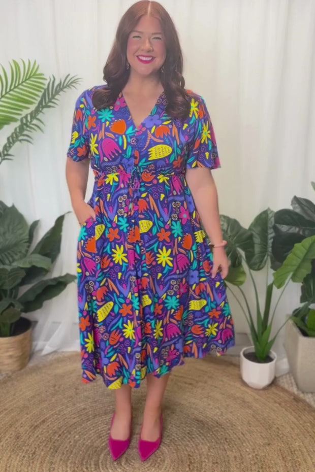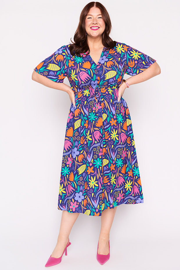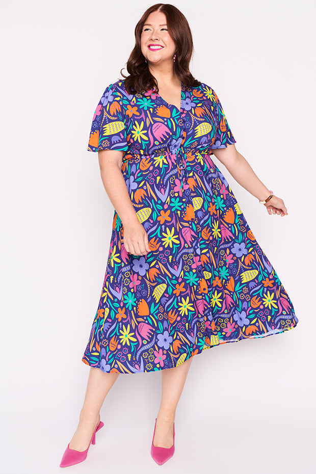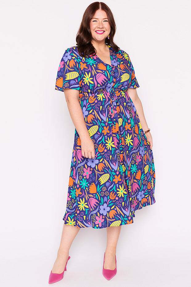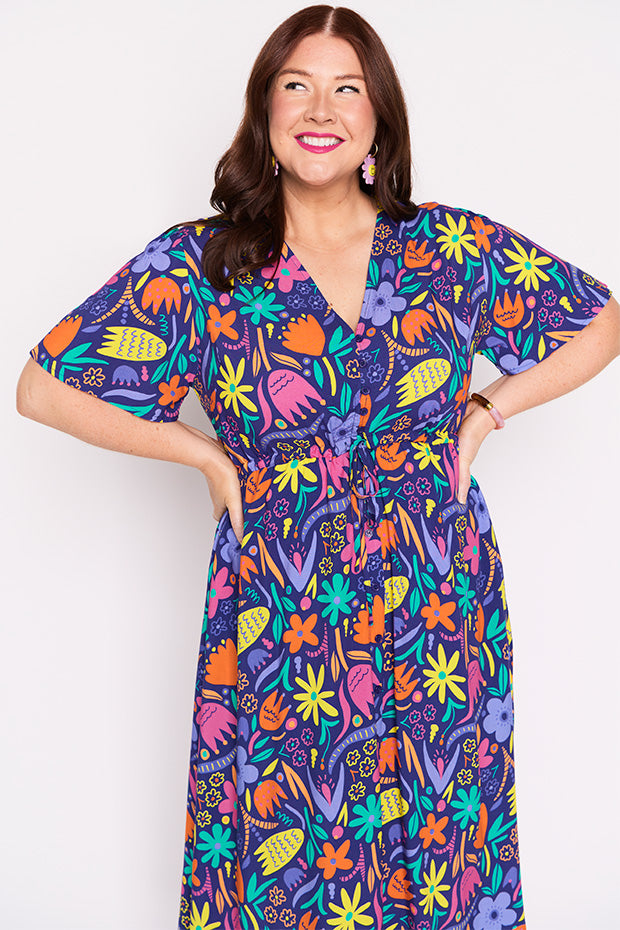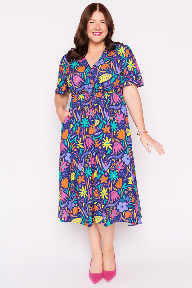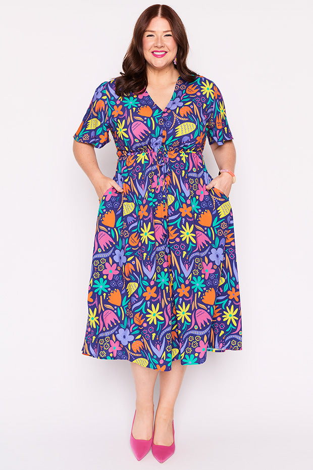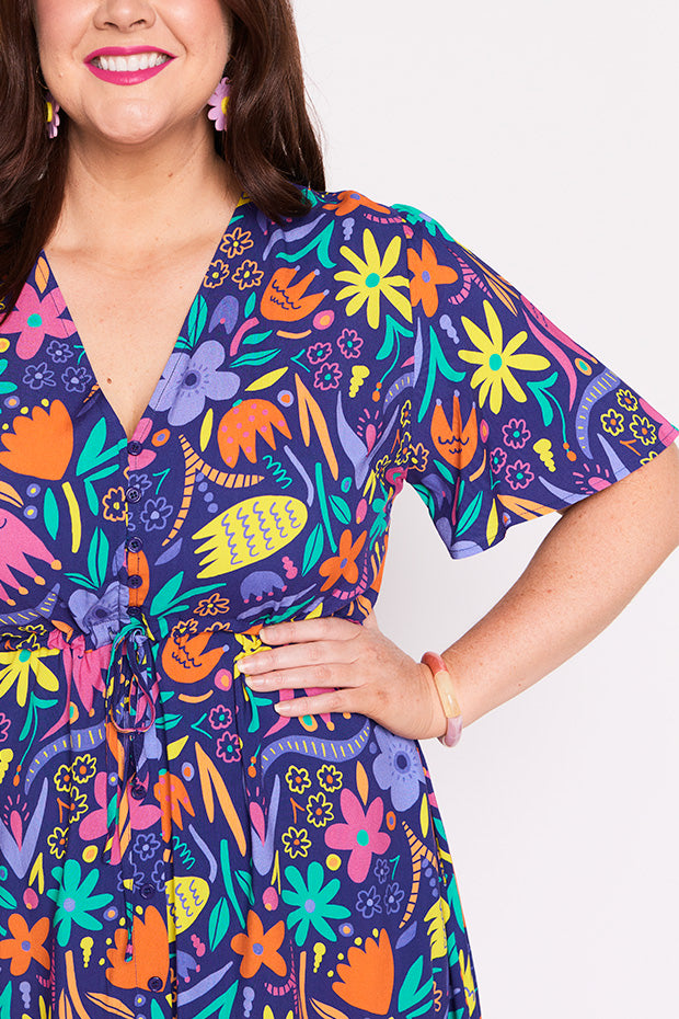 Designed in a lightweight rayon fabric, Michelle features a loose bodice, with short wide sleeves & a button up V-neckline. We love the comfy drawstring waist, with a loose flared skirt (with pockets!) creating a feminine vintage silhouette and that perfect twirl moment!