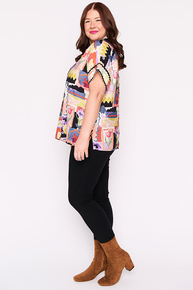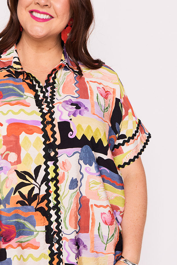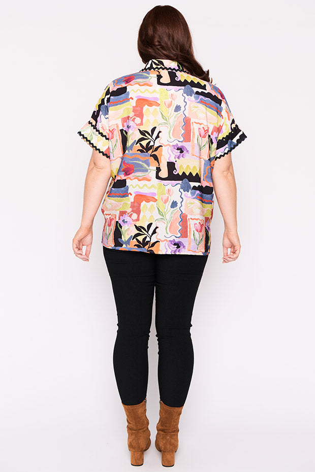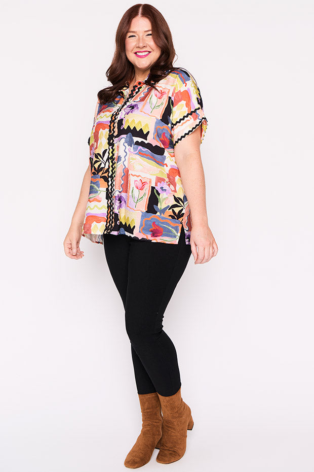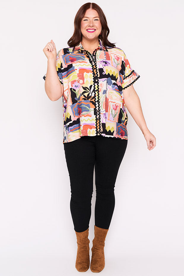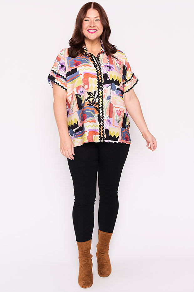 This light weight viscose blend shirt features features a fully button down front, with a loose, boxy fit in the body & short relaxed sleeves. We love the adorable hemline detailing!