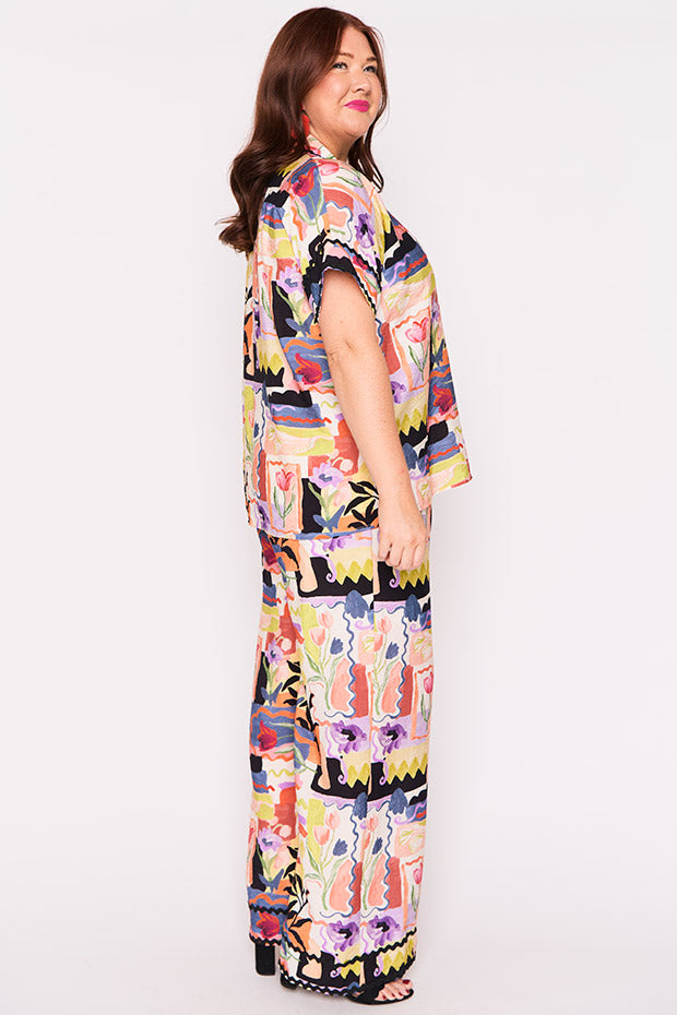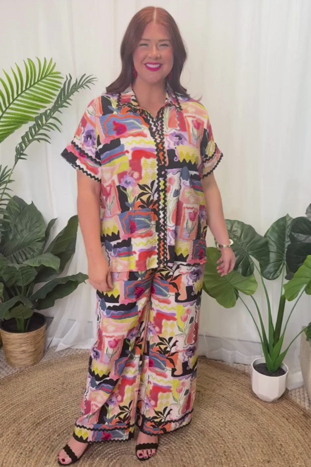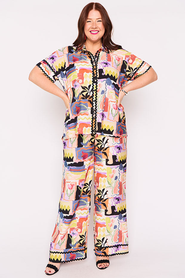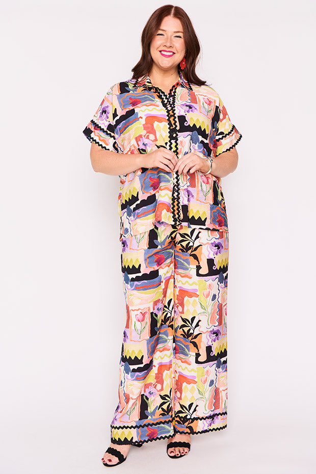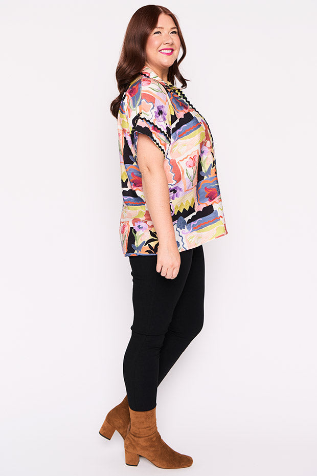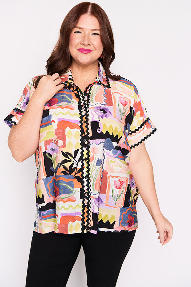 This light weight viscose blend shirt features features a fully button down front, with a loose, boxy fit in the body & short relaxed sleeves. We love the adorable hemline detailing!
