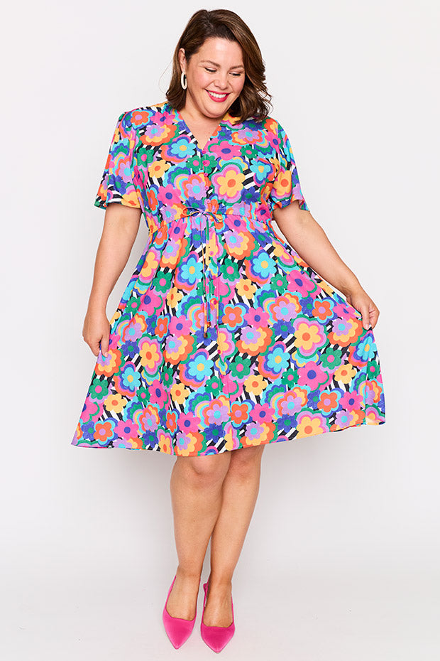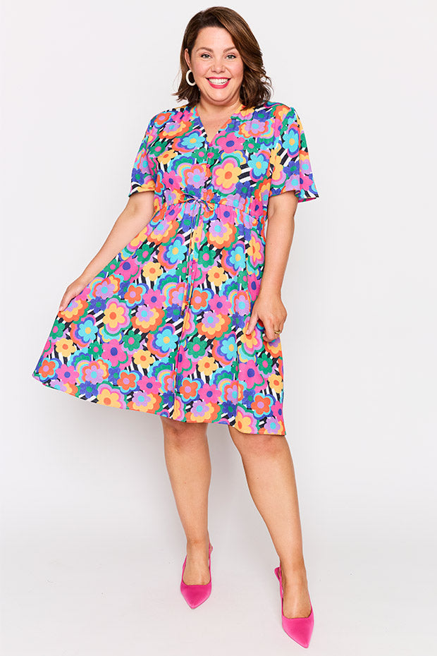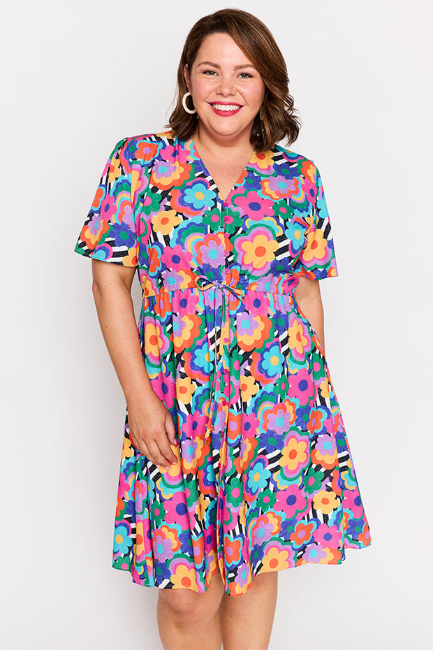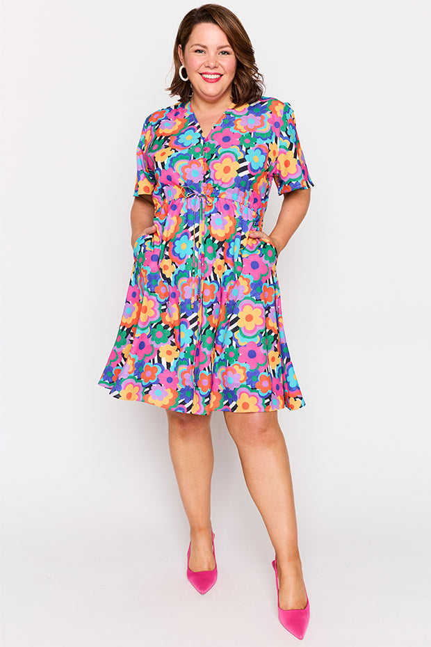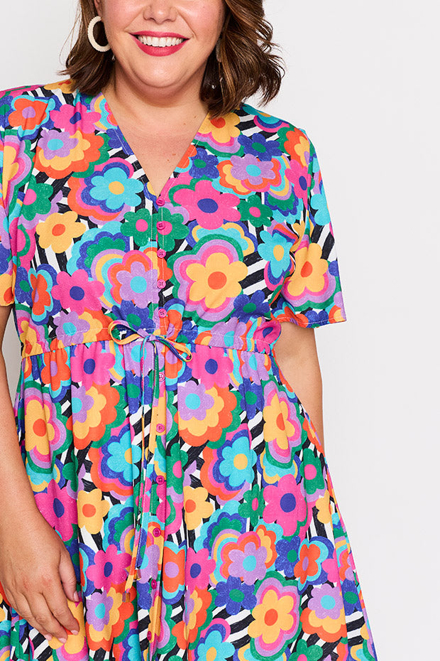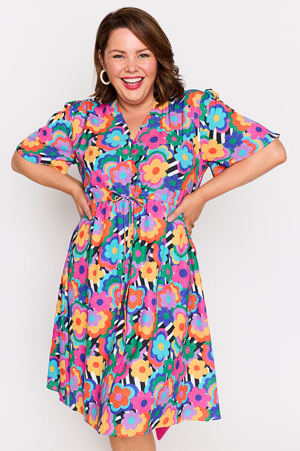 Bloom in style in this Siena Dress! Adorned in our Electric Blooms print, exclusively designed by the oh so talented Teggun Ashleigh. It's the perfect piece to add a cheerful touch to any day. Light, lively, and effortlessly eye-catching—this dress is pure sunshine in fabric form.