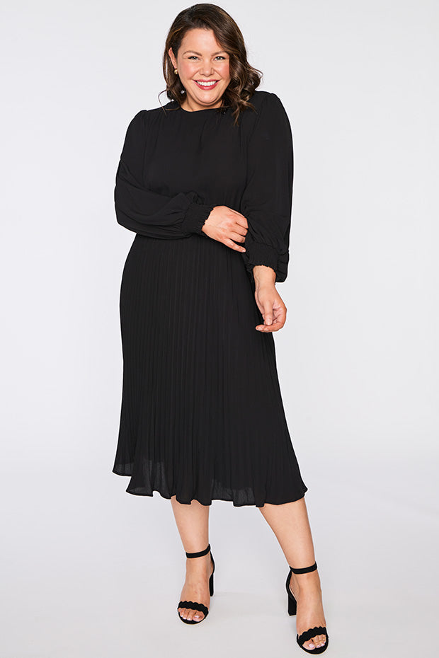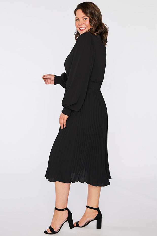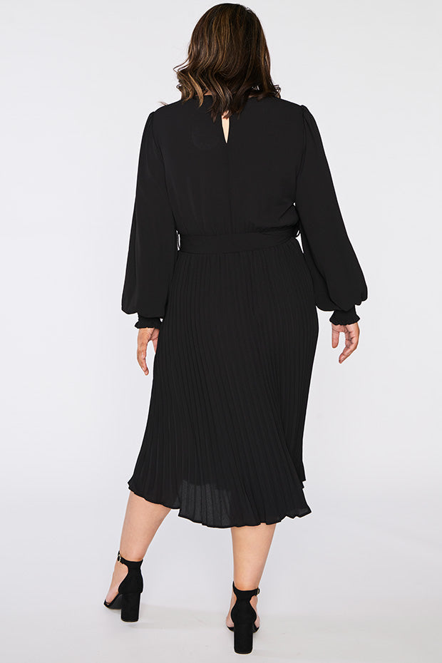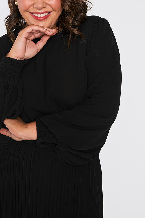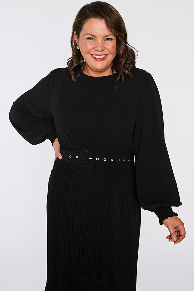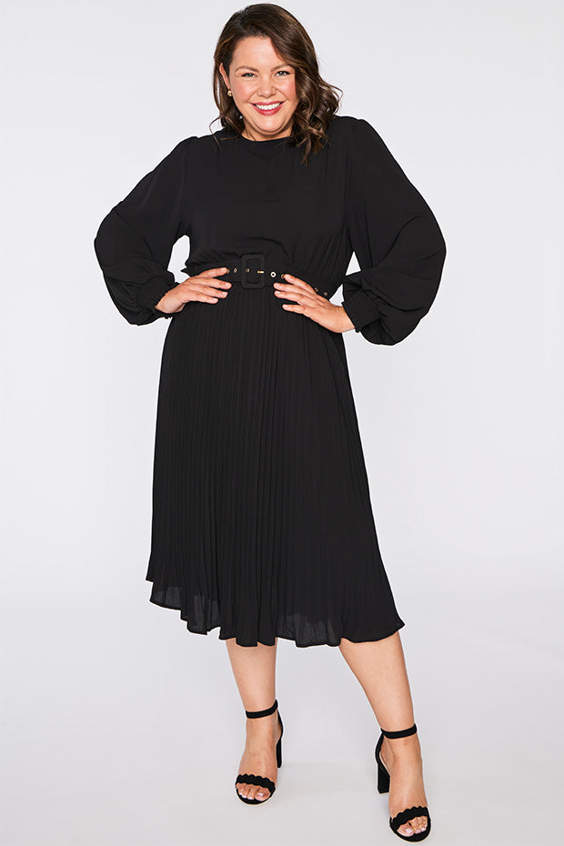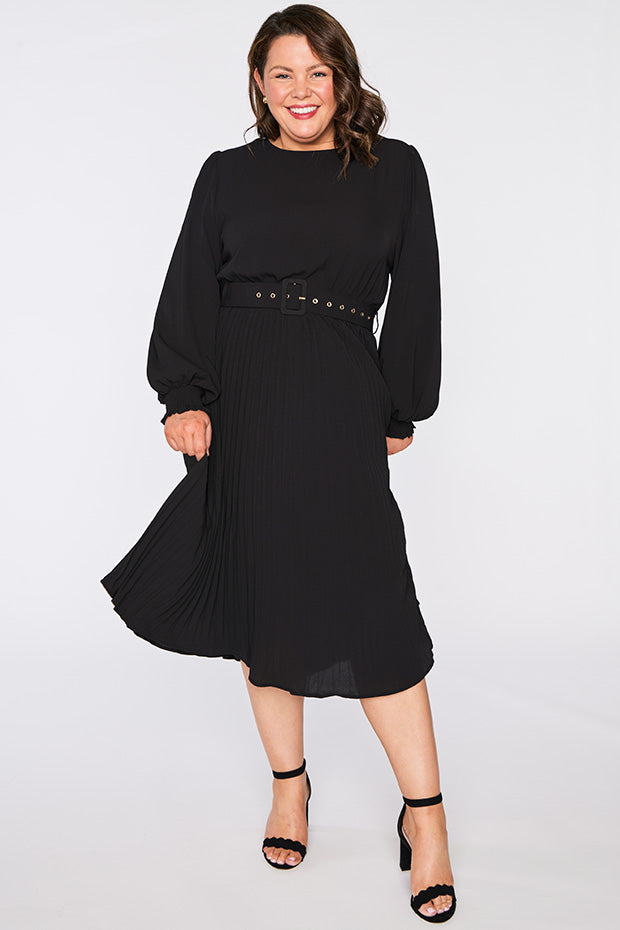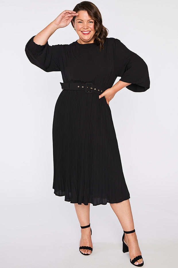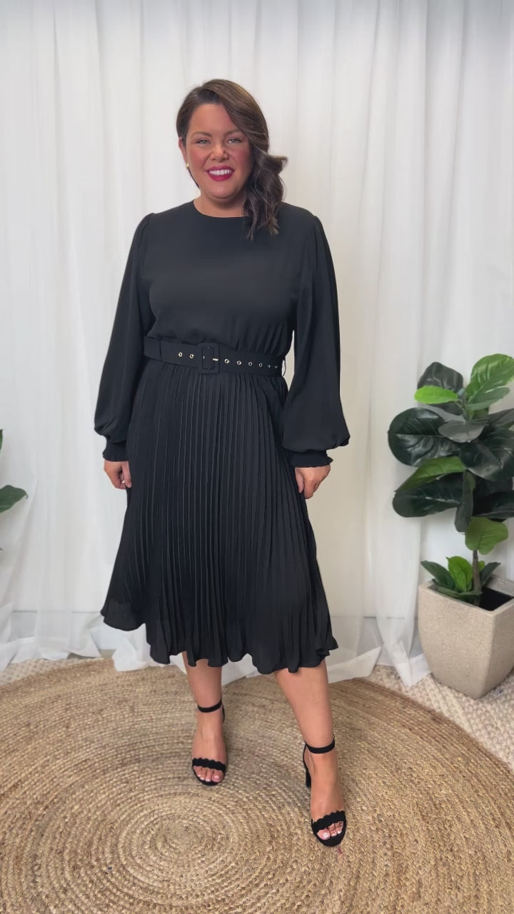 Featuring a round neckline, with full length sleeves and an shirred elastic cuff. It has an elastic waistline with a removable fashion belt, and mid length skirt that falls loosely down your hips & stomach with delicate soft pleating that is dying to be taken out for a spin!