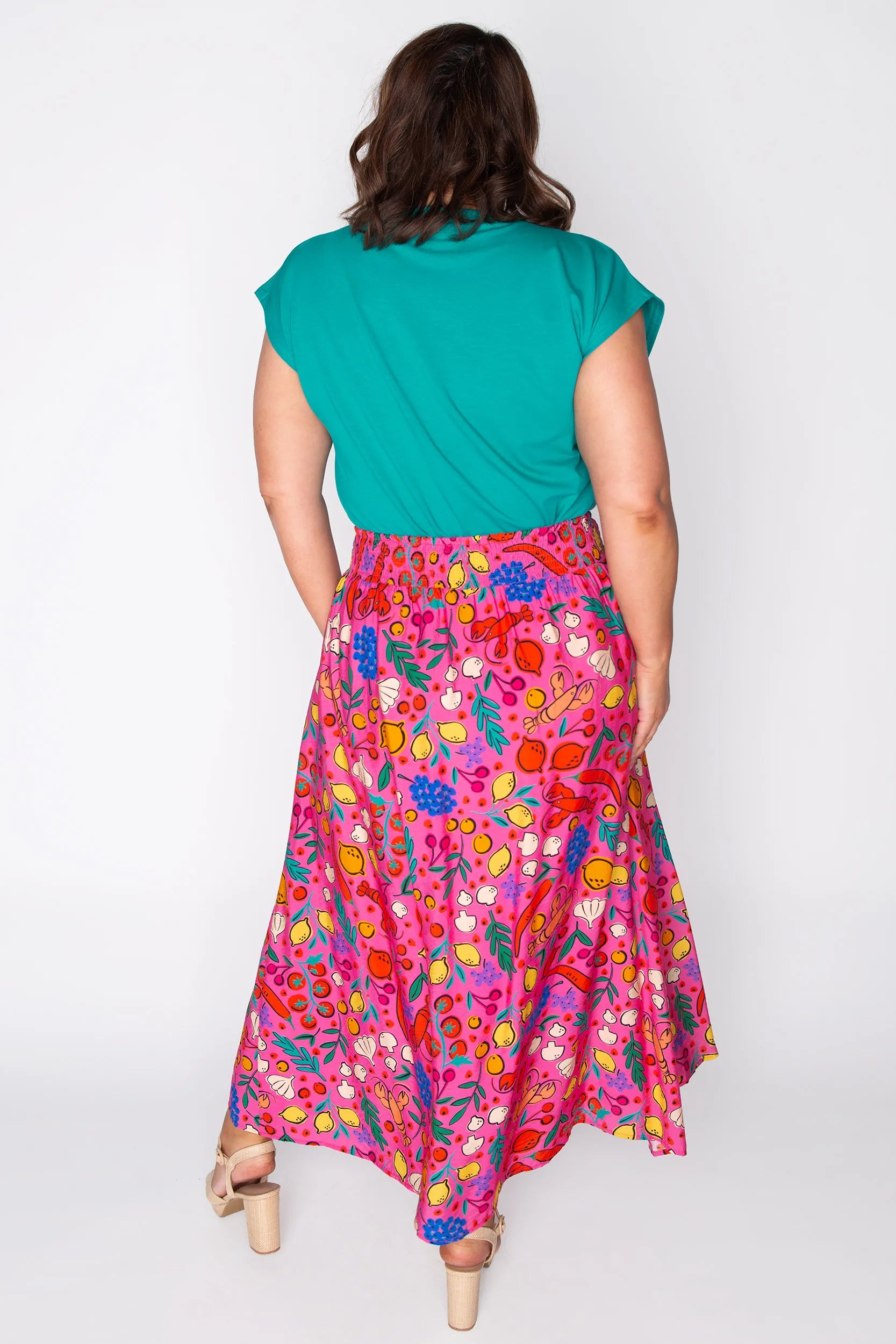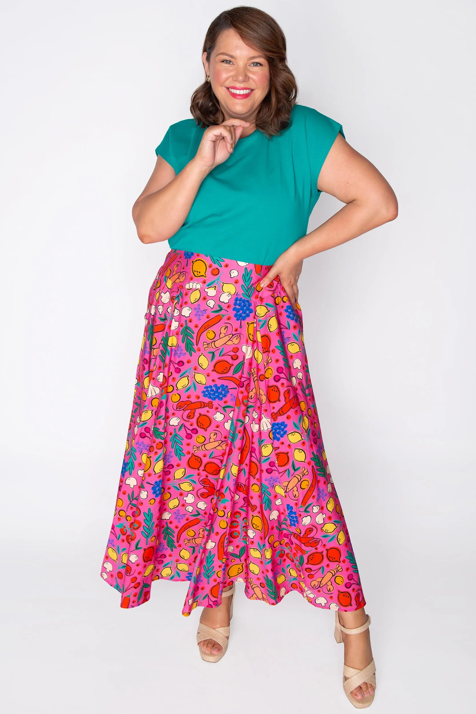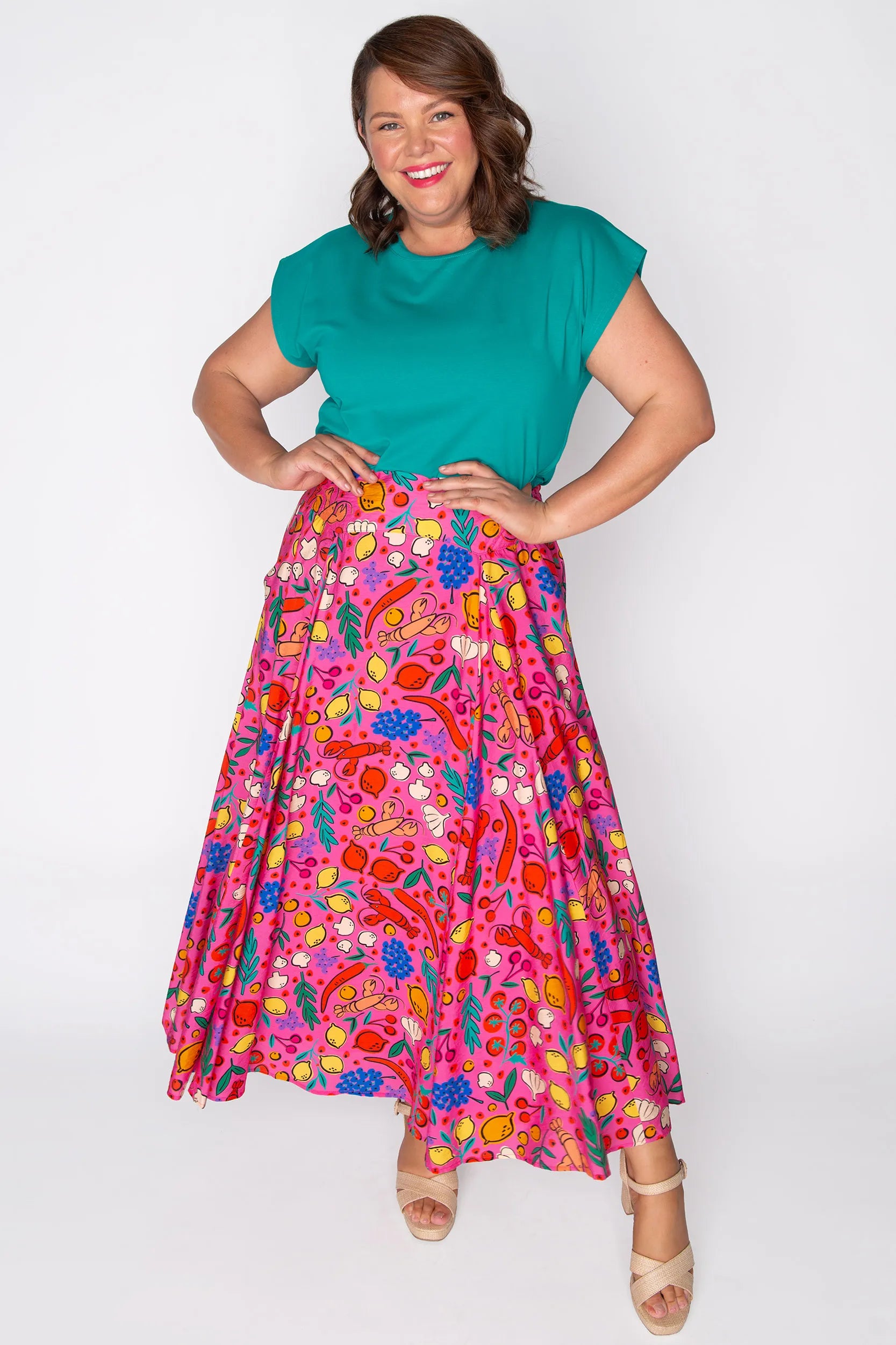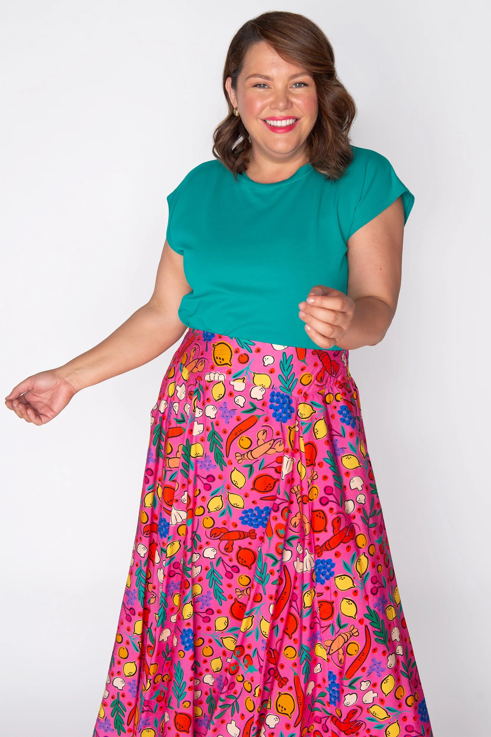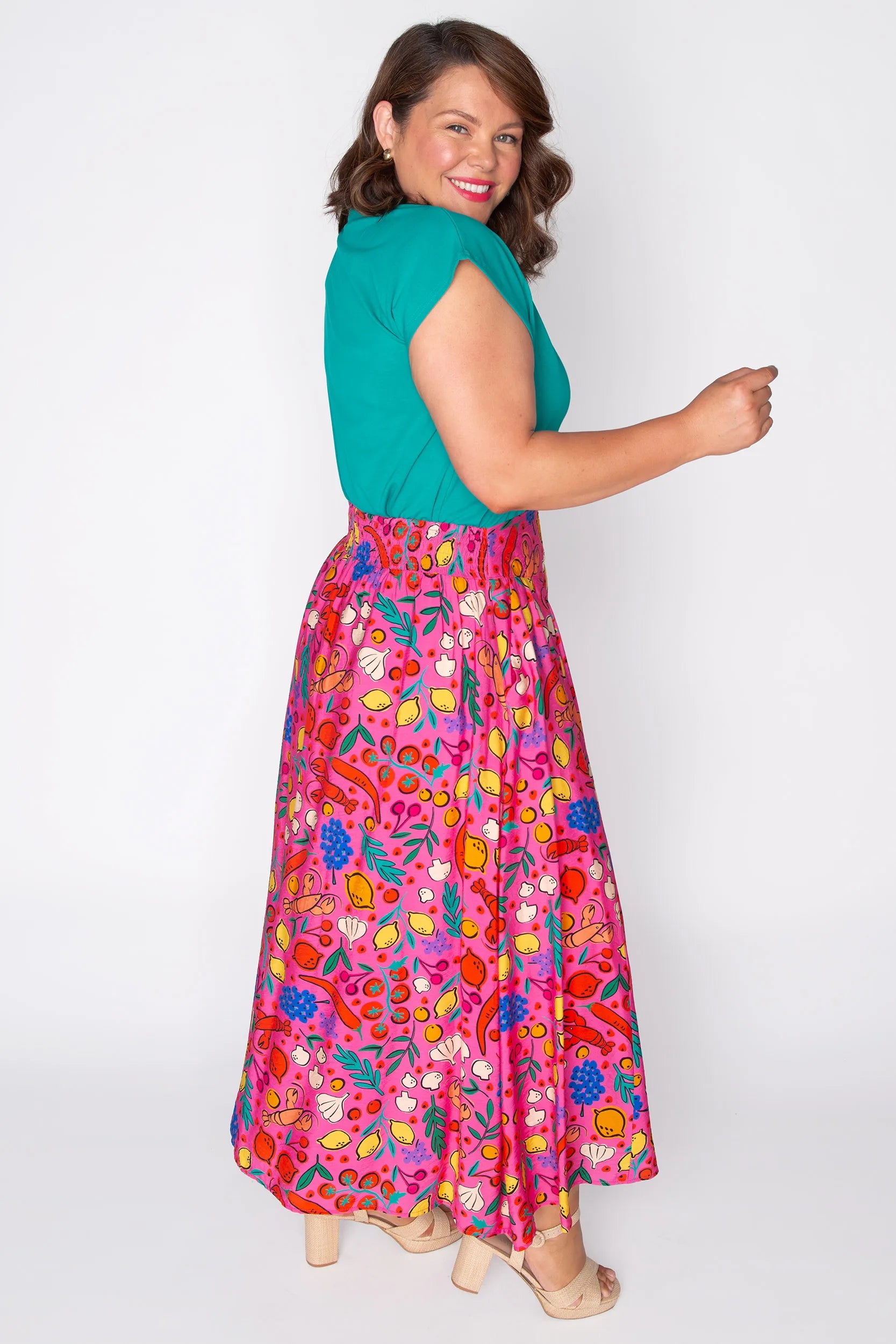 Turn heads and start parties in our La Festa print, where fashion meets flavor. Exclusively designed by the oh so talented Annie Coti of Banana Pop Designs. This Zara Skirt captures the joyful energy of a lively street festival, making it the ideal Summer Skirt. Your go-to Fun Print for any occasion that calls for a pop of personality, this dress serves bold style with a delicious twist.