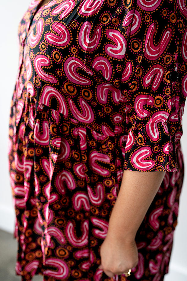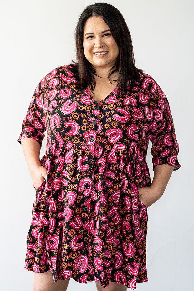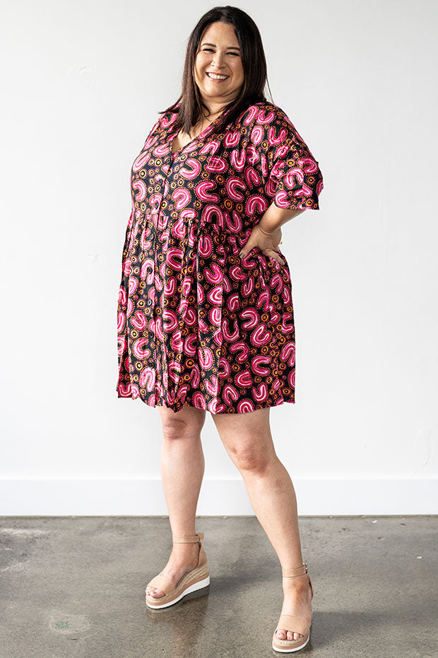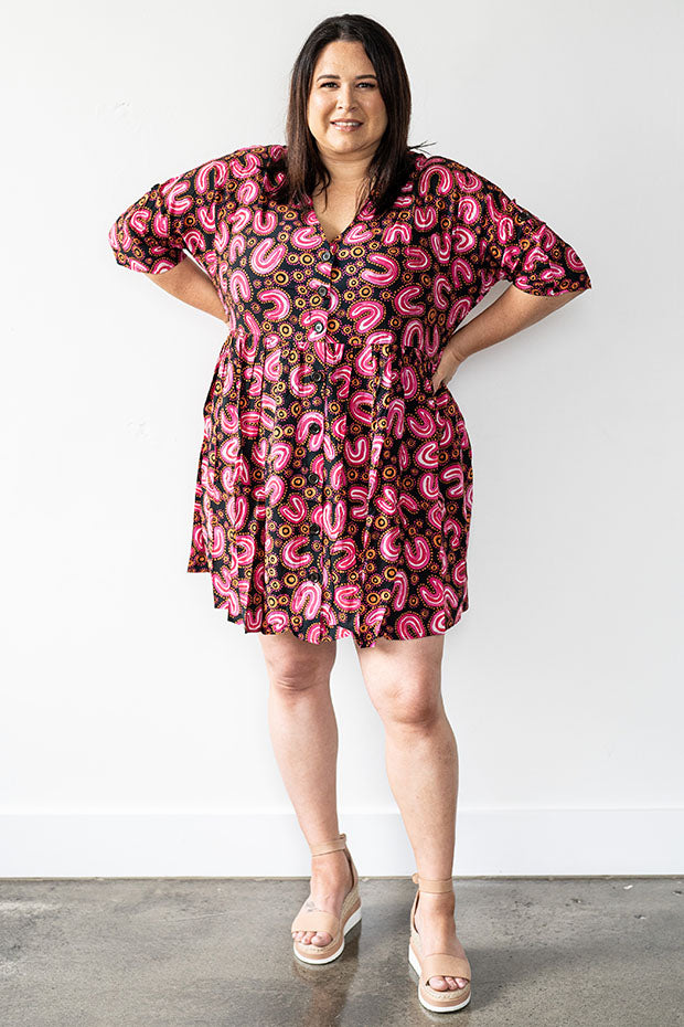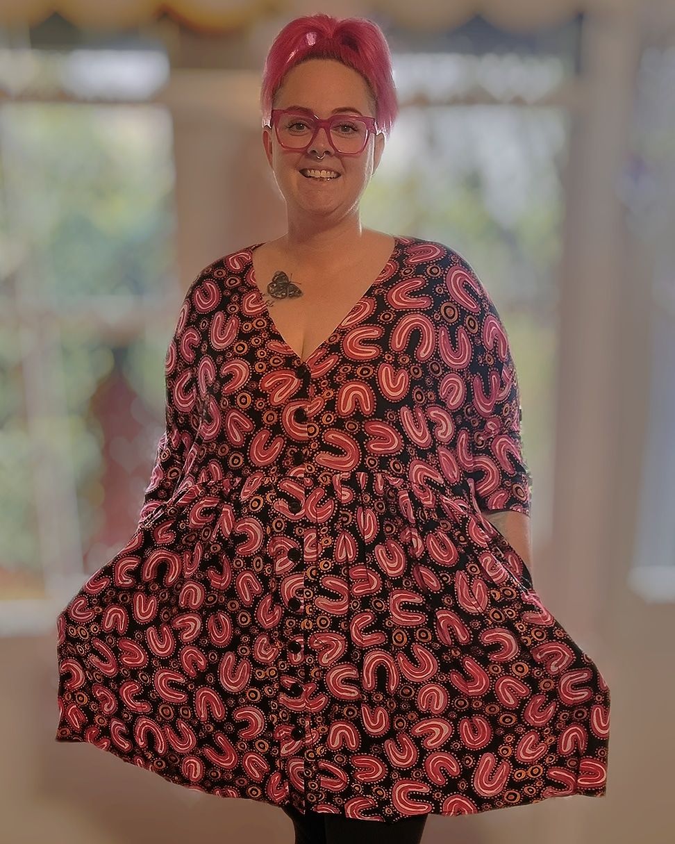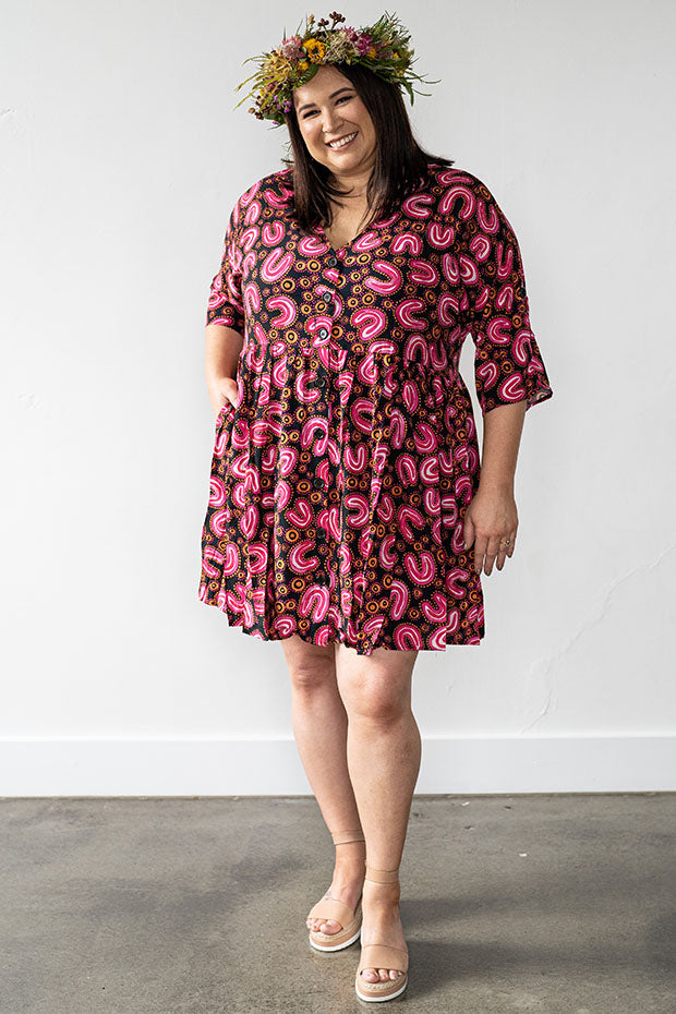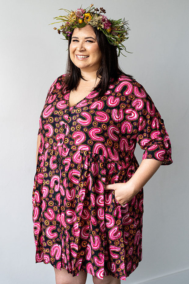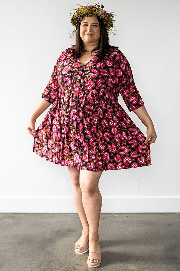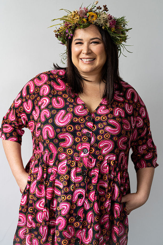 Introducing our super special collab with @yarli_creative, and the incredible First Nations artist behind Yarli, Madison Connors. We are beyond excited to bring this gorgeous print to life in our beloved Adina Dress - as modelled by Madison the artist!