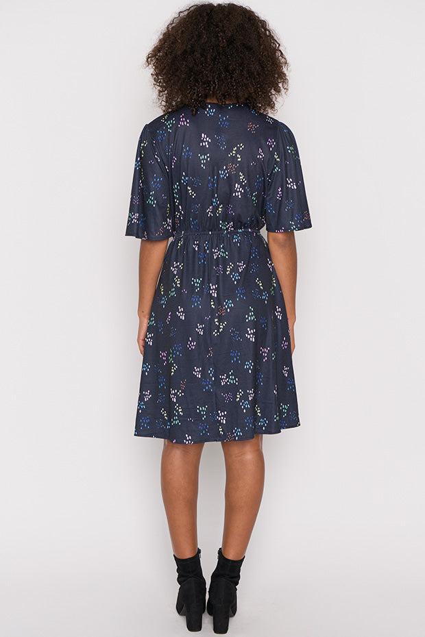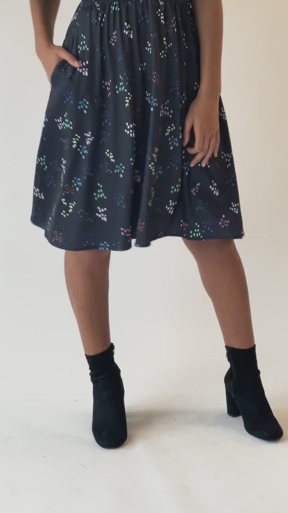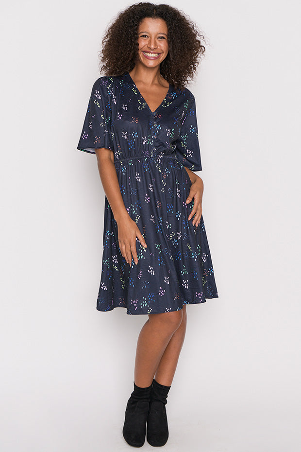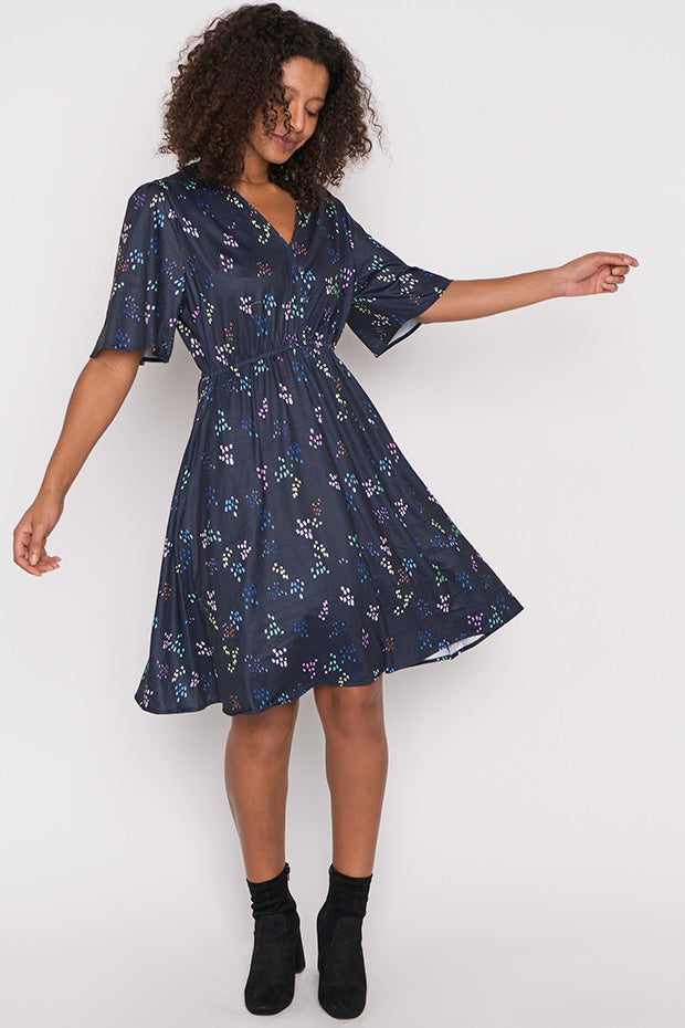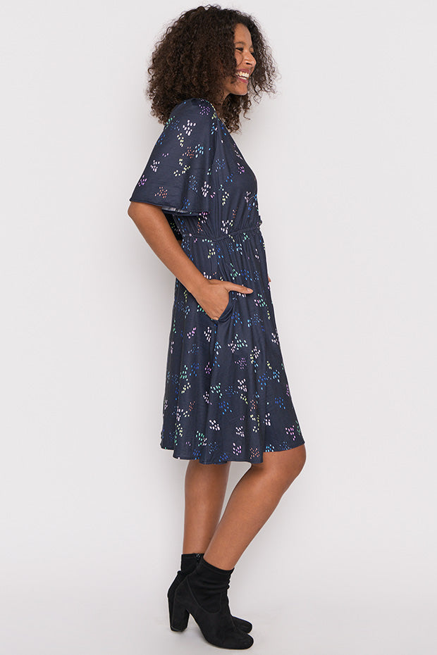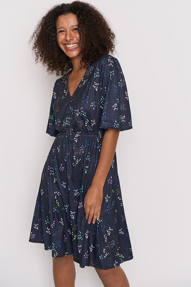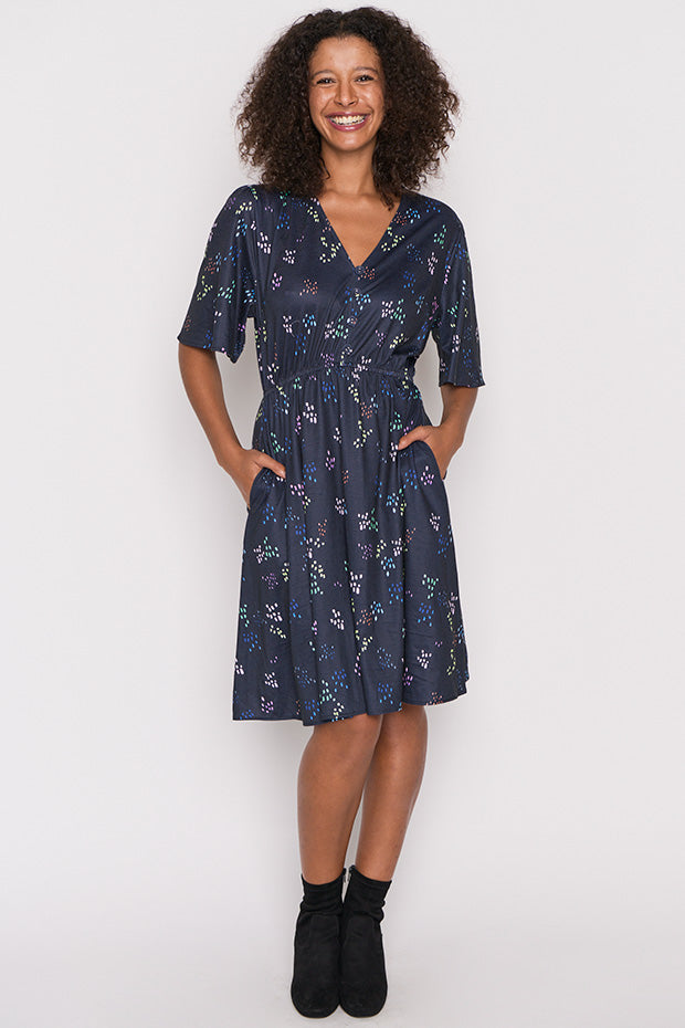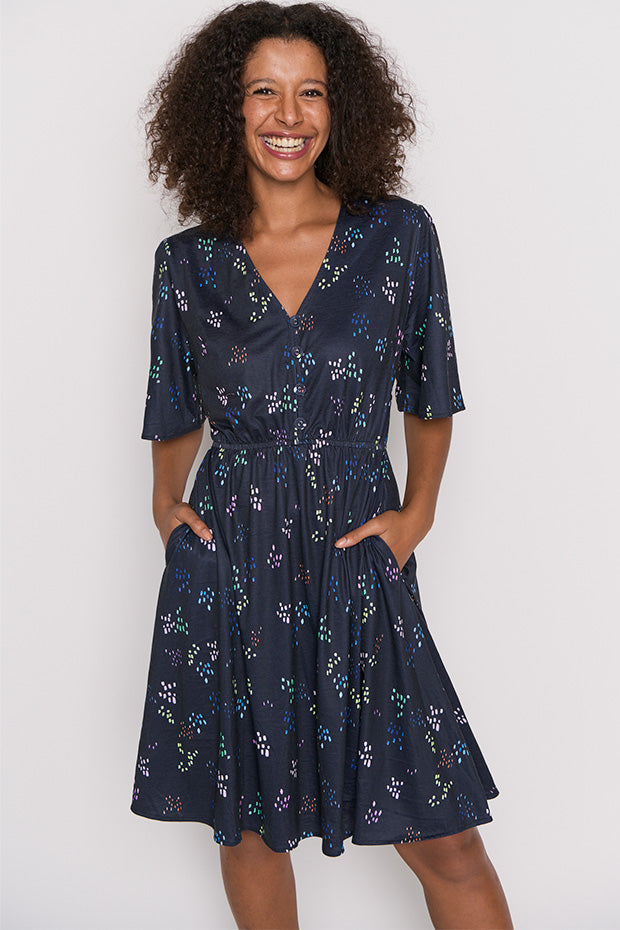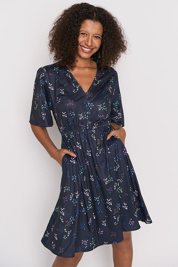 Constructed in a super soft cotton poly blend jersey knit fabrication, loose bodice, and functional button up V-neckline. The short wide bell sleeves, comfy elastic waist, and loose flowing skirt gives you that perfect silhouette 😍 And of course she's got pockets!