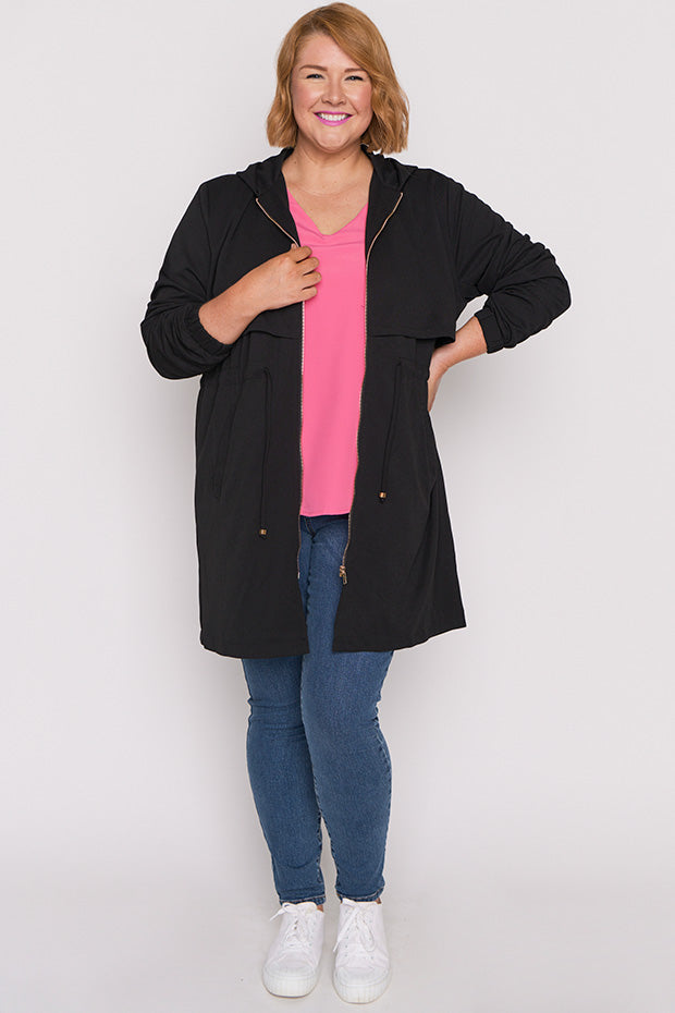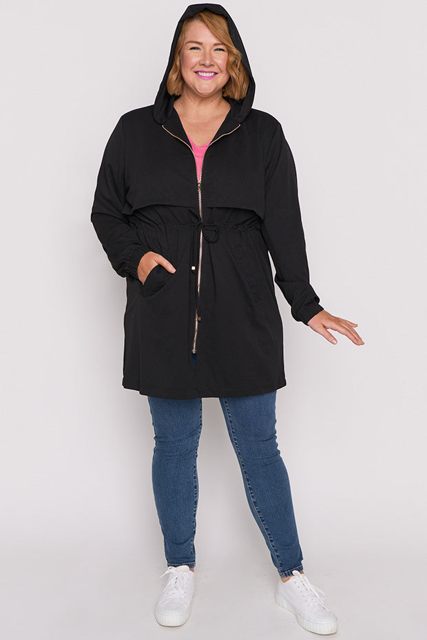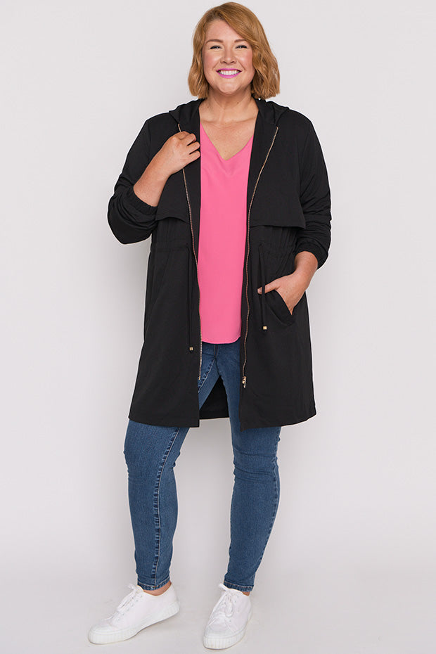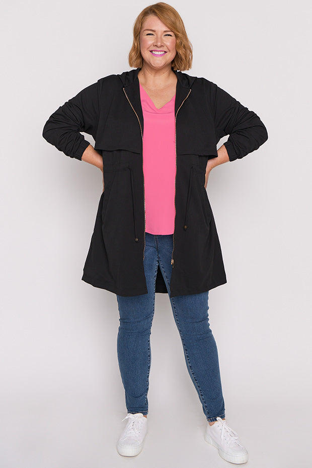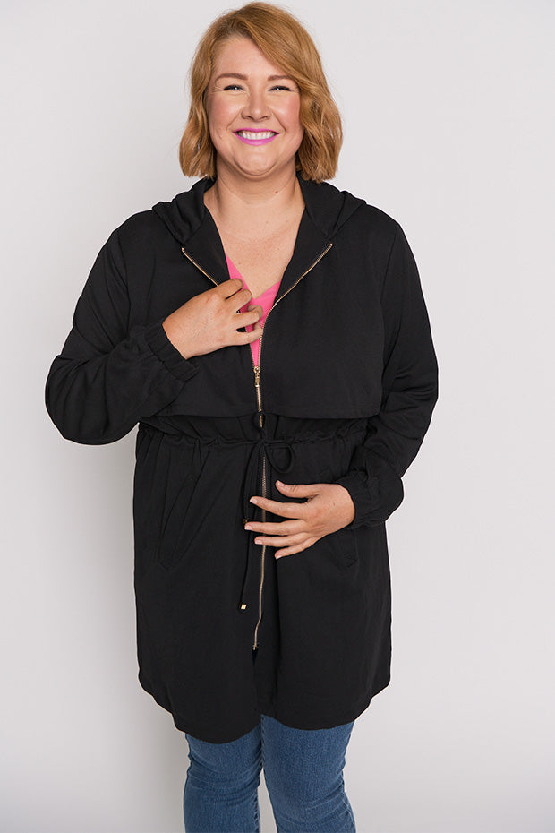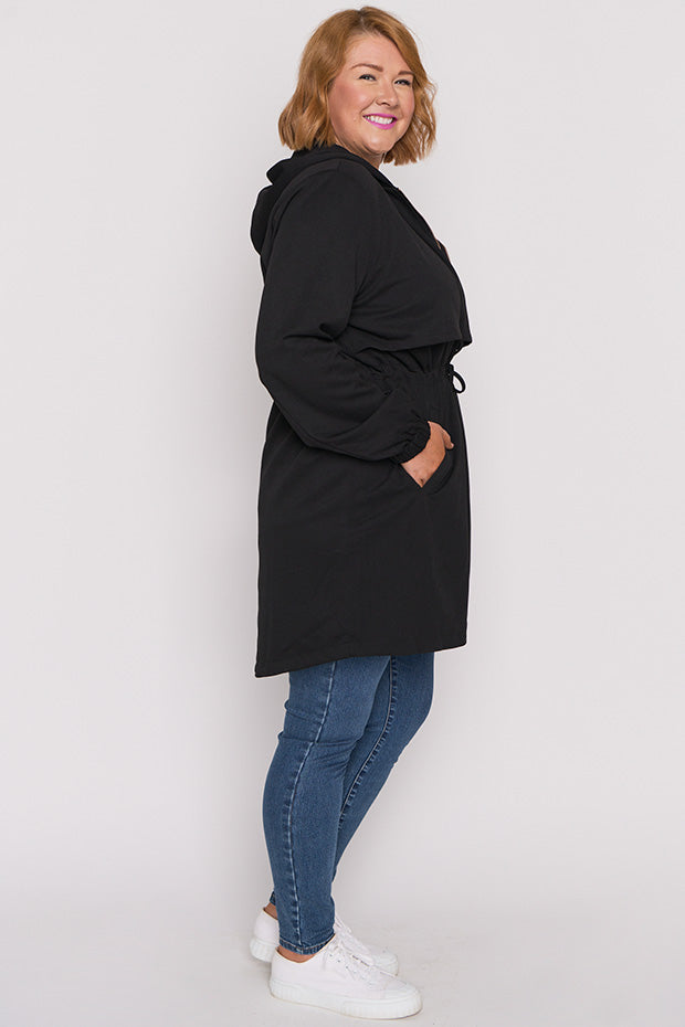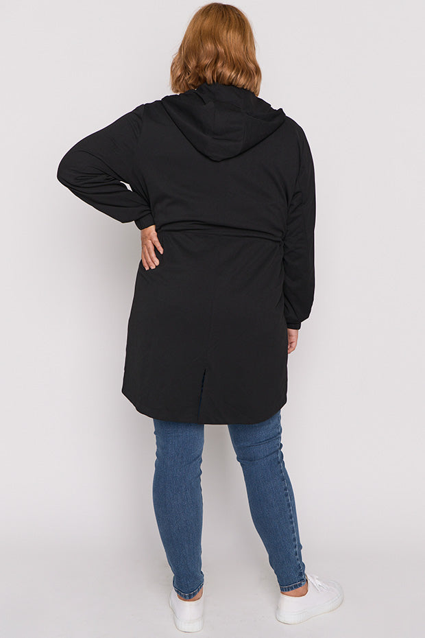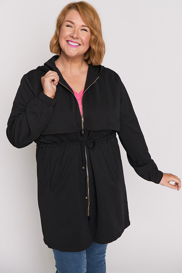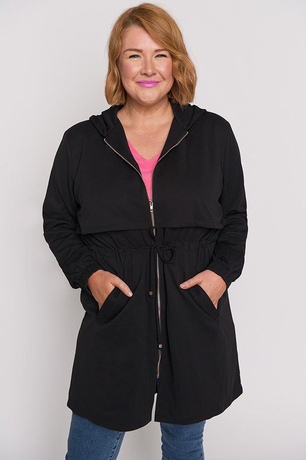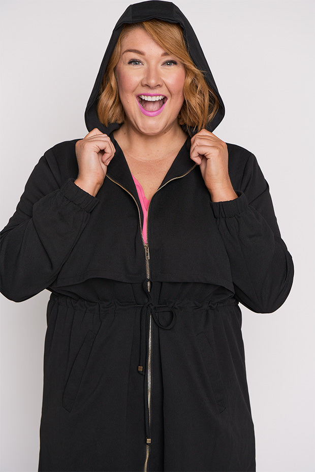 Oh my! I am in love with this! It’s actually rather stylish. Good with leggings and jeans or over a dress when heading out. The drawstring pulls around your waist removing the frumpy look. It’s very flattering. The hood is an added bonus on a cold day or drizzly and the hair has been styled so needs a bit of protection.