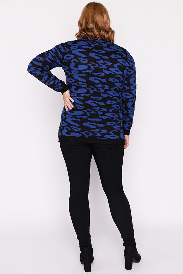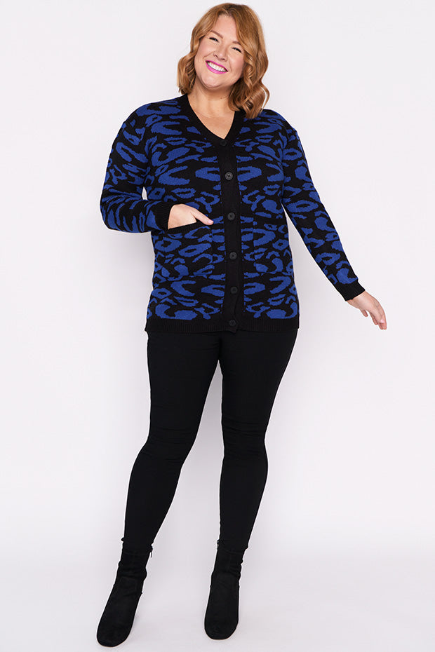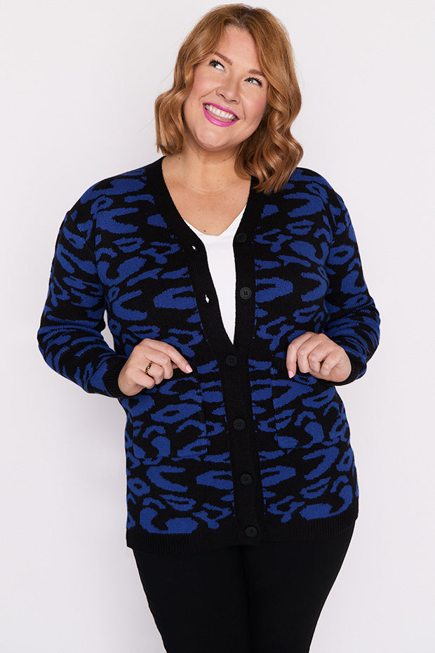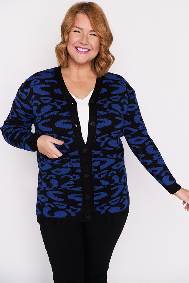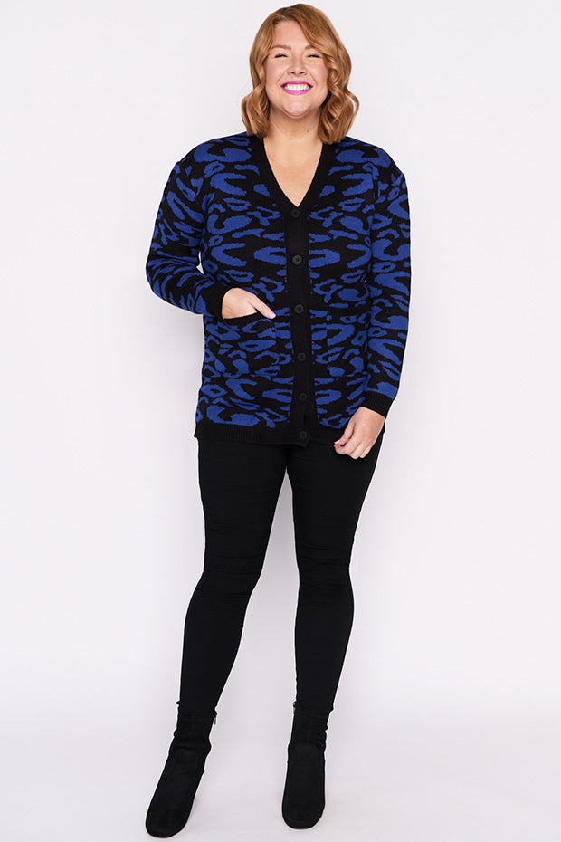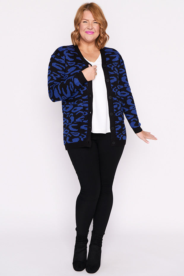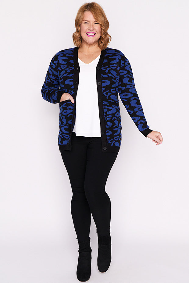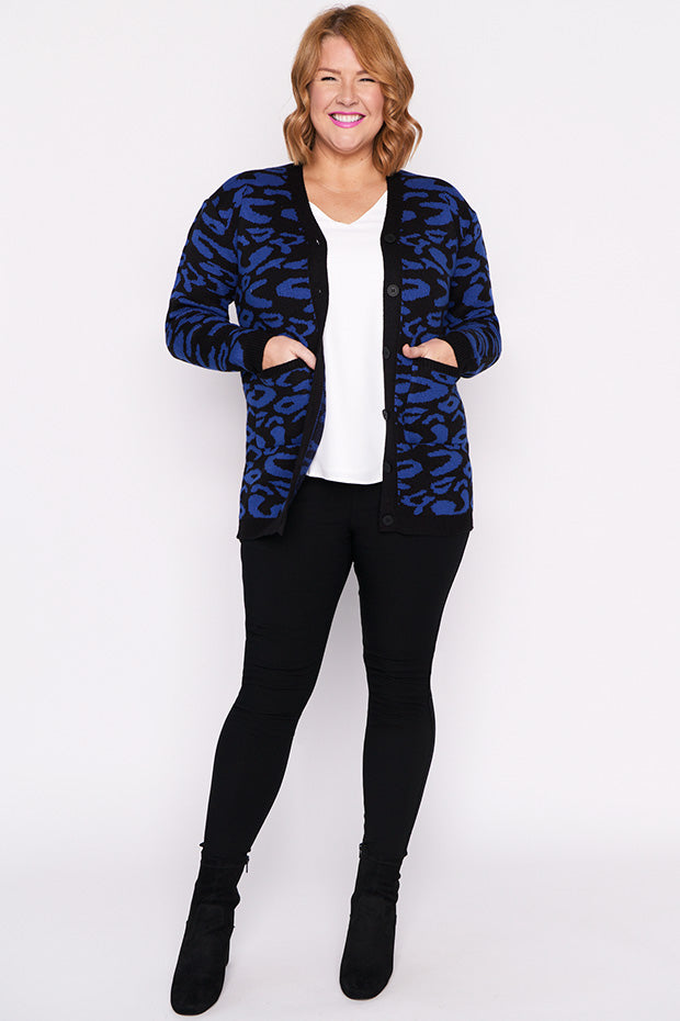 It features a loose fit body, an open button down front, very stretchy sleeves with front patch pockets. This mid length super soft jacquard cardi slides right over dresses + jeans and a tee and is the perfect pick me up for any outfit!