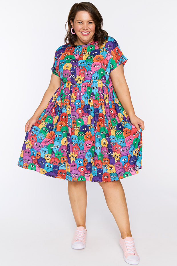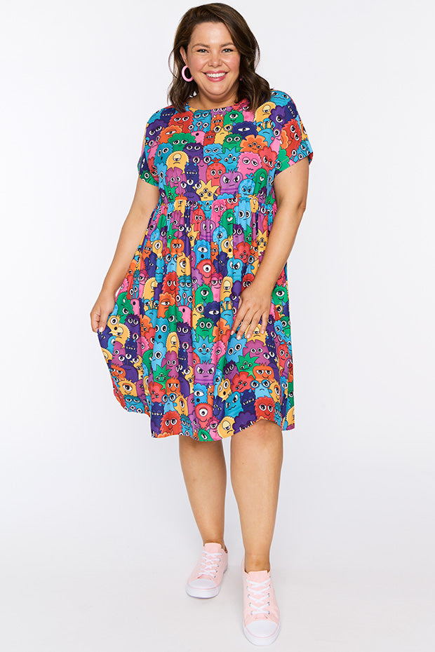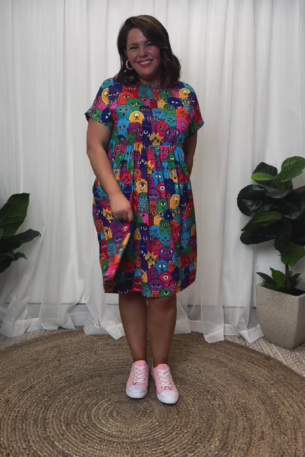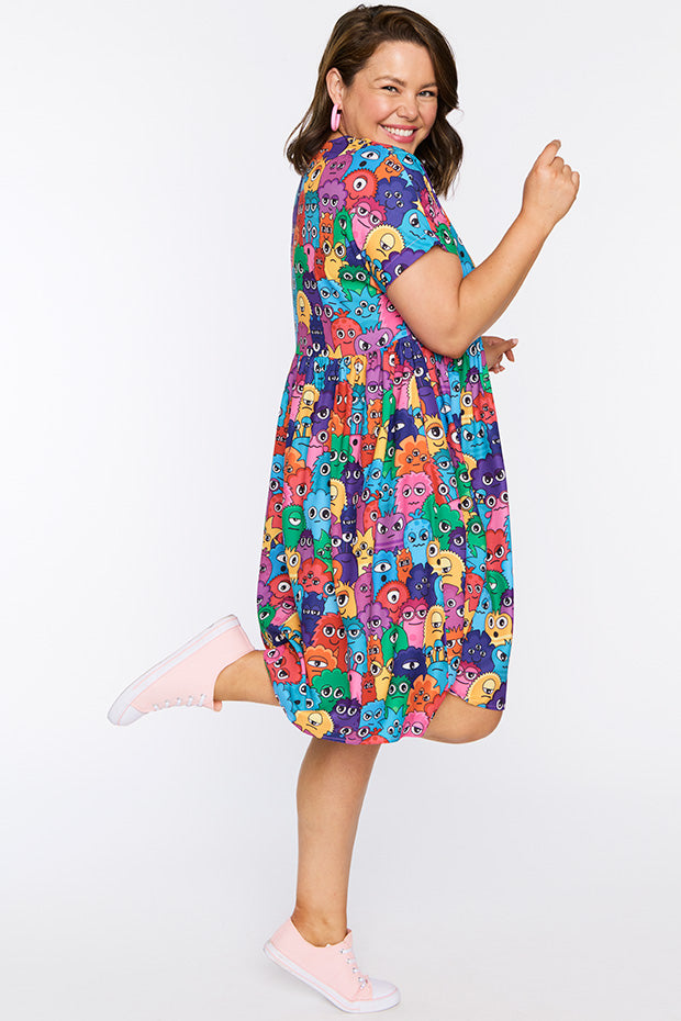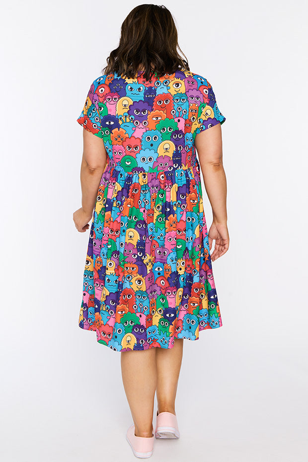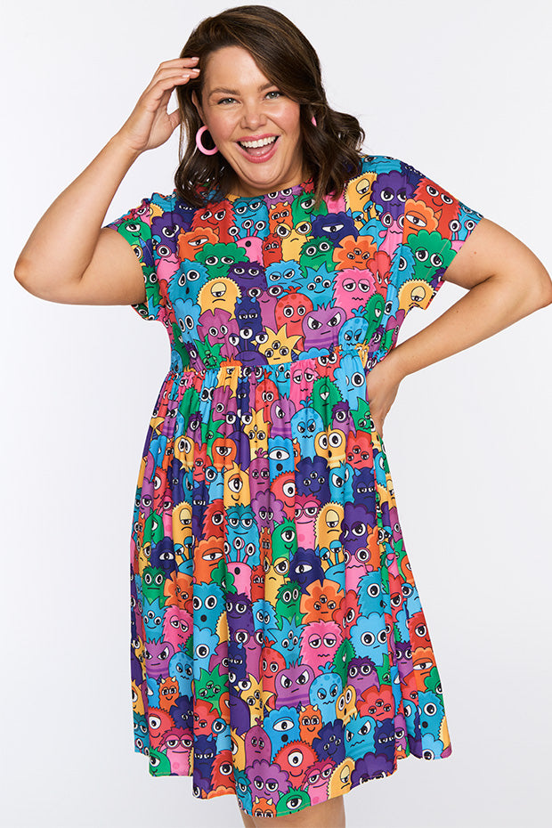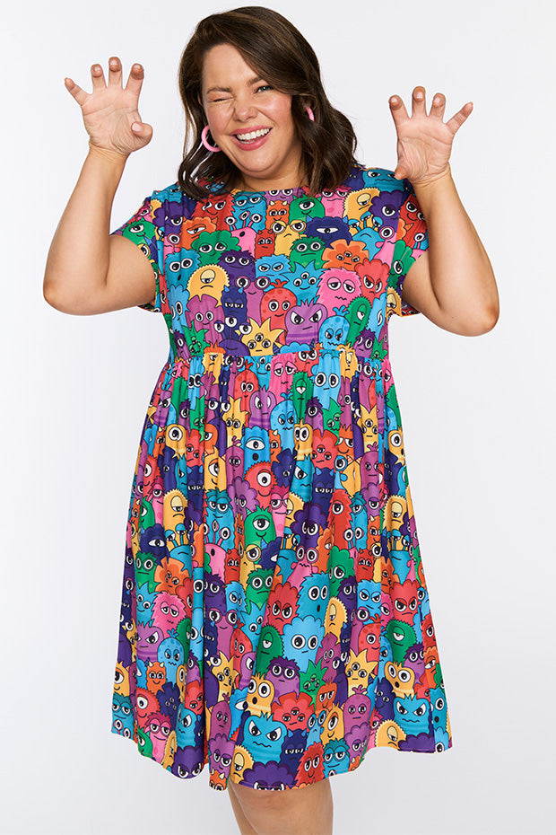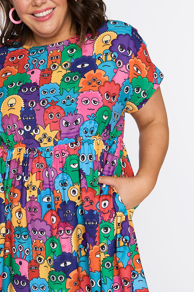 The real showstopper, though, is the print—tiny, adorable monsters scattered across the fabric in bright, cheerful colors. It strikes the perfect balance between quirky and stylish, making it a great conversation starter. Whether you’re running errands, hanging out with friends, or just want to add a little fun to your wardrobe, this dress delivers.