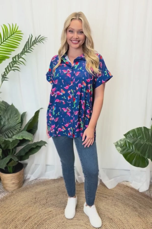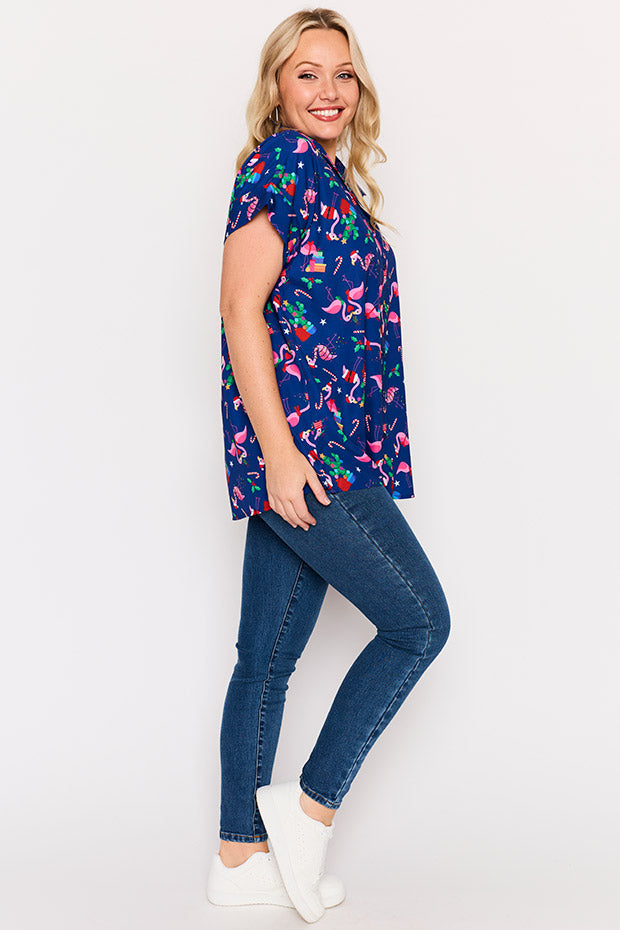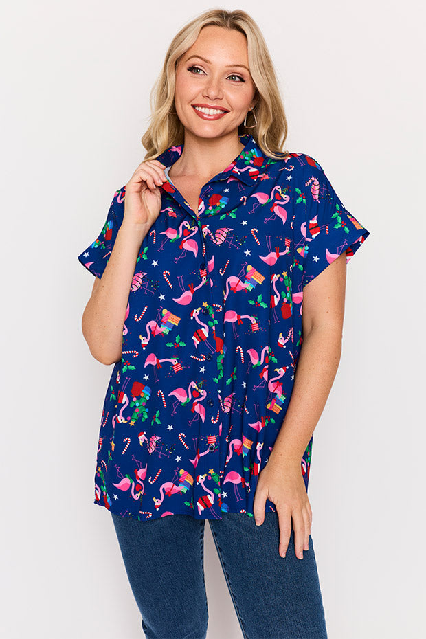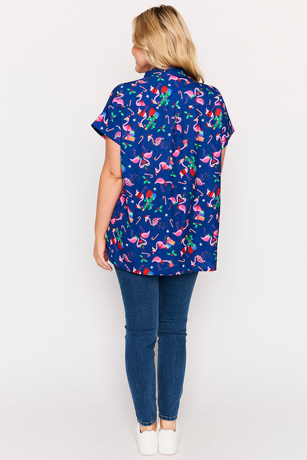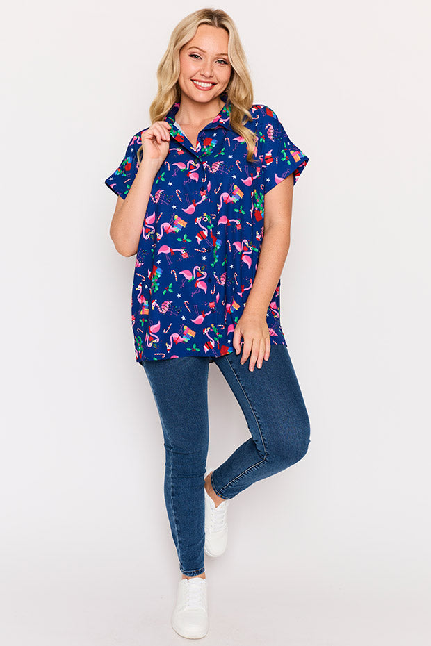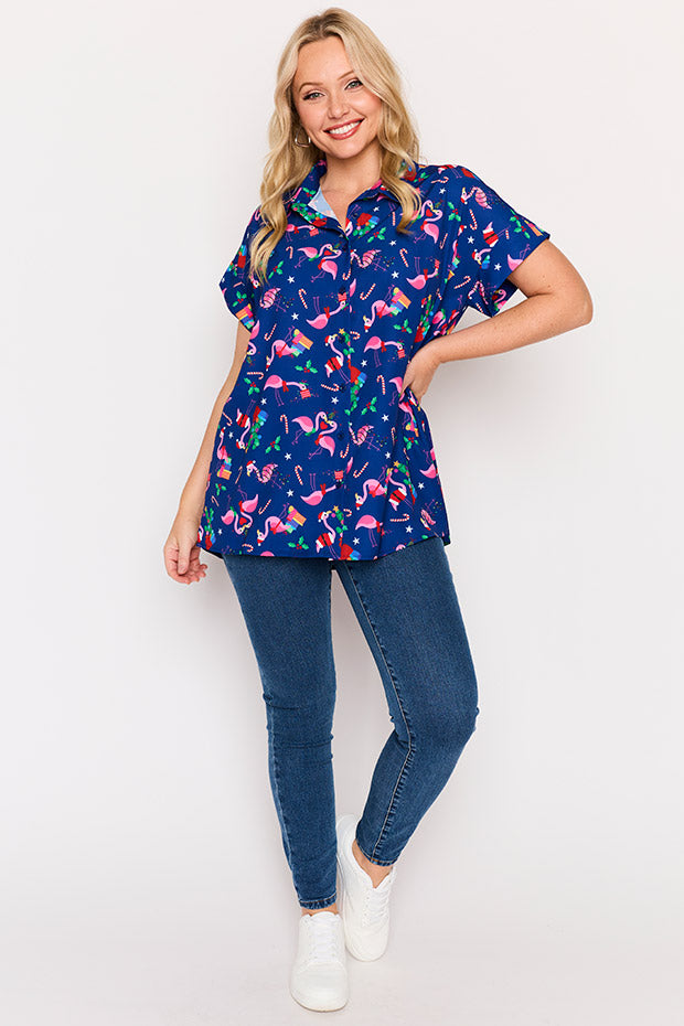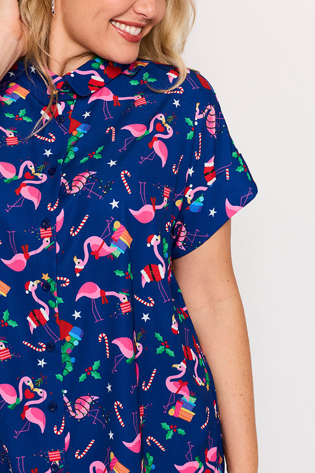 Feel fabulous this Christmas in our exclusive Flamingo Christmas print designed by our very own Kim from Zonkt®. With playful flamingos dressed in holiday cheer, this festive Belle Shirt brings a tropical twist to the season—perfect for standing out at every celebration!