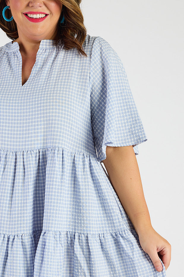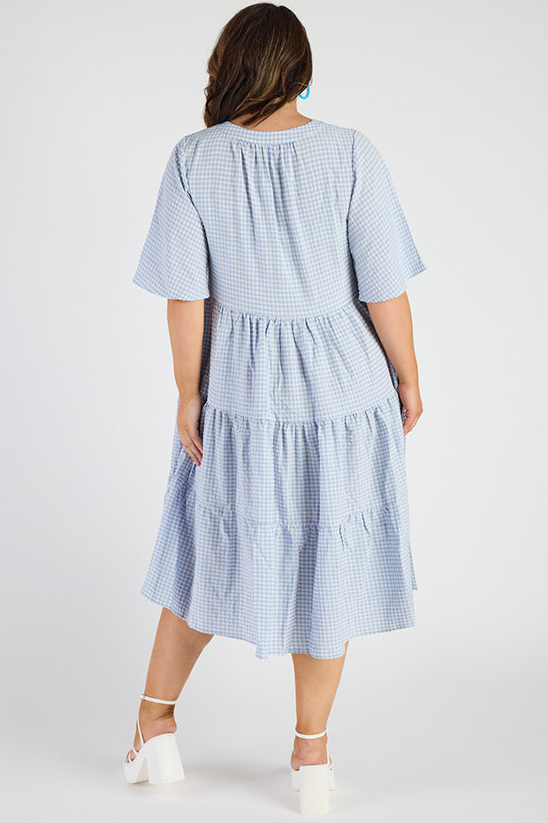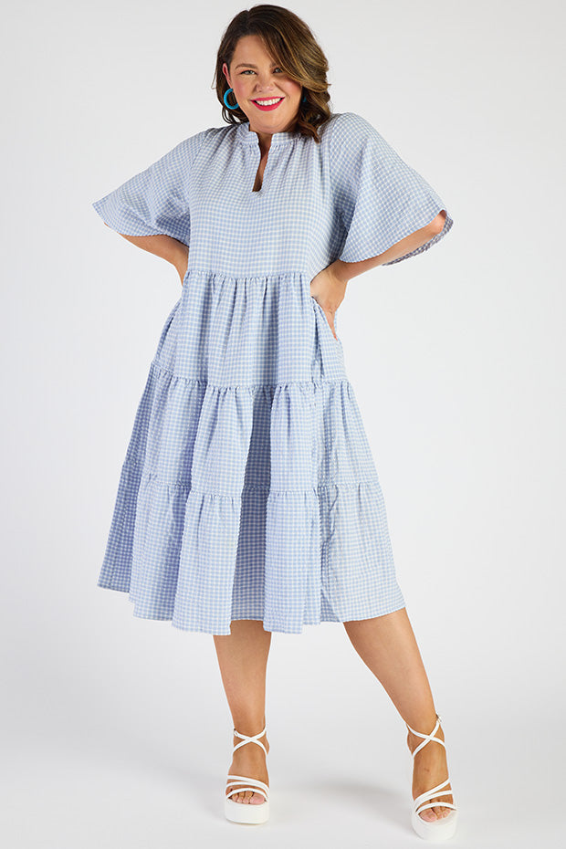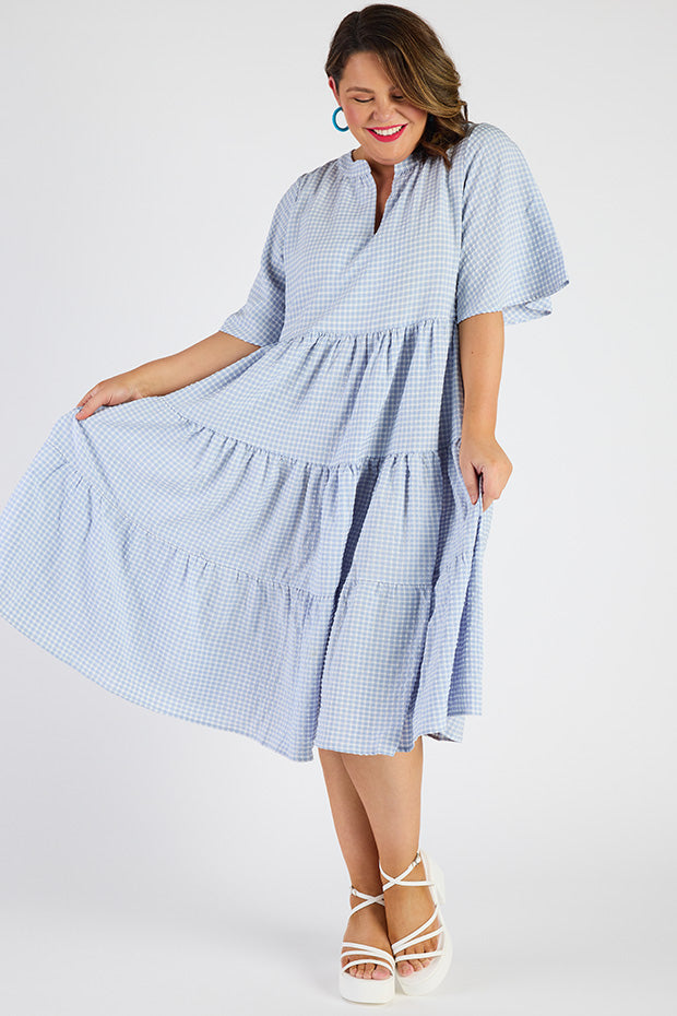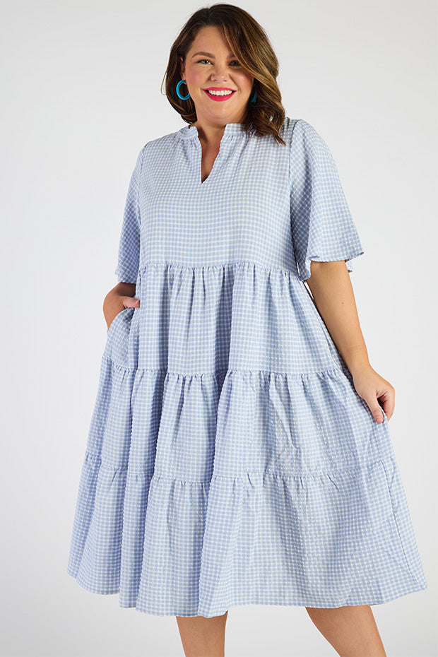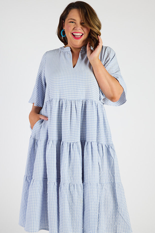 This dress is so pretty and I get compliments when I wear it. It feel very Dorothy like. The dress has a lining and I love the tiers and sleeves. Highly recommend, it can be dressed up or down.