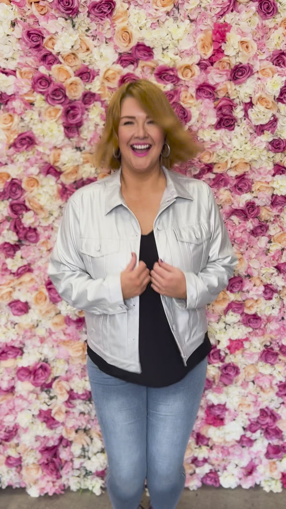 Sporting a metallic pleather fabrication, this classic jacket fit is embossed with a stud front opening, as well as on the flap chest pockets and open cuffs. We love the denim-style stitch detailing AND additional side pockets 💗