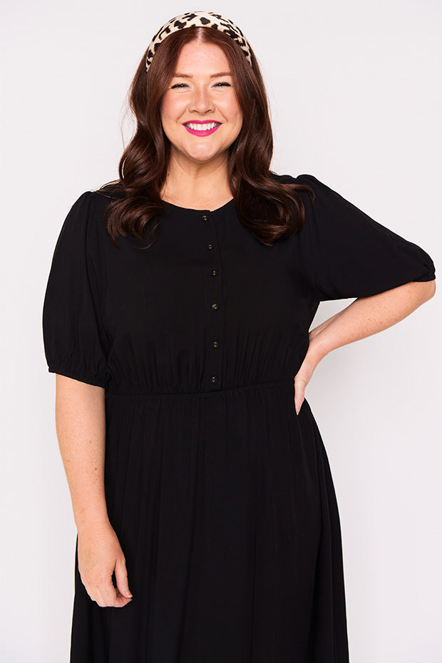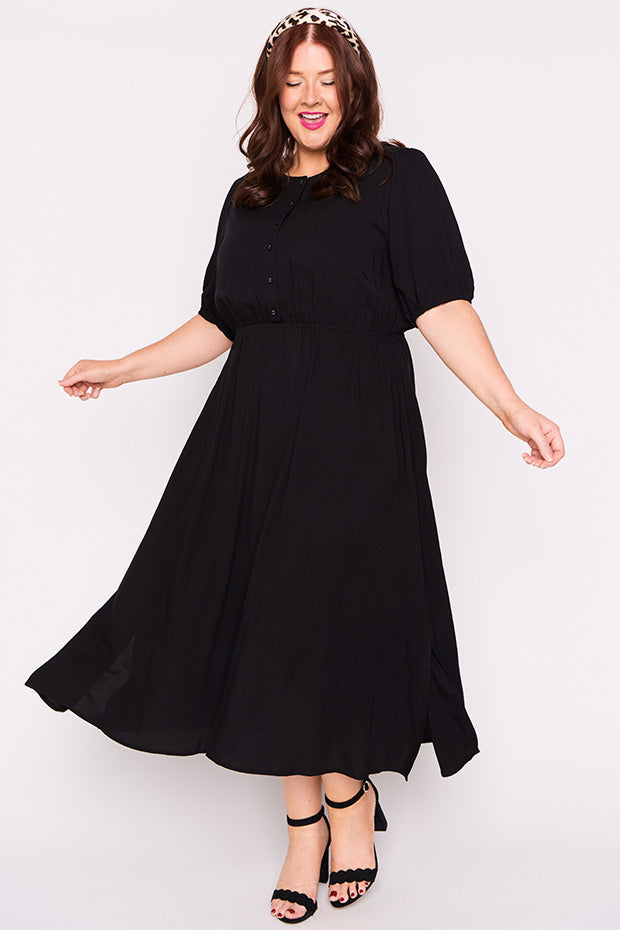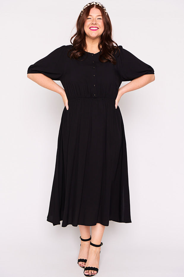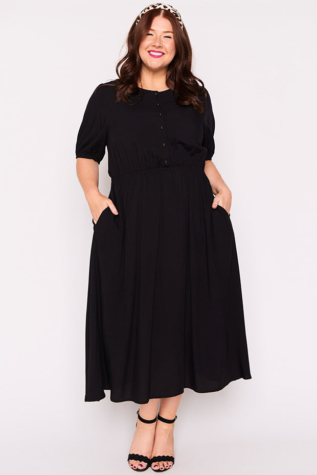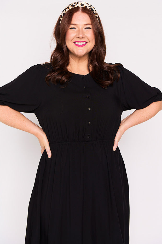 Well made dress in soft breathable rayon. Comfortable in all the right ways. Can dress it up or down. Perfect for work, home or socialising. Fits an ample bust and buttons are nice and secure