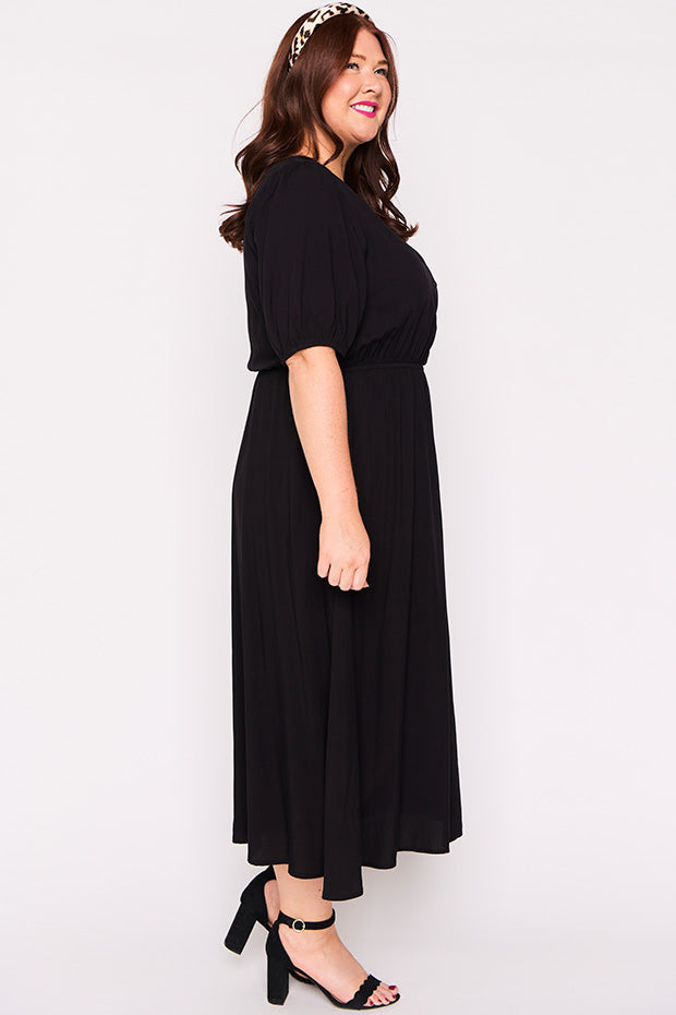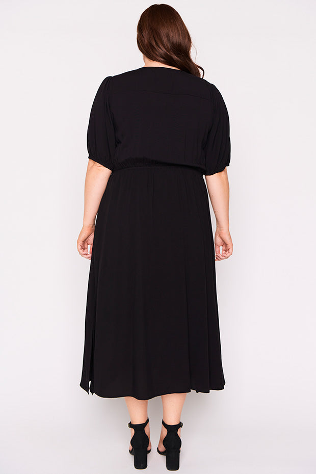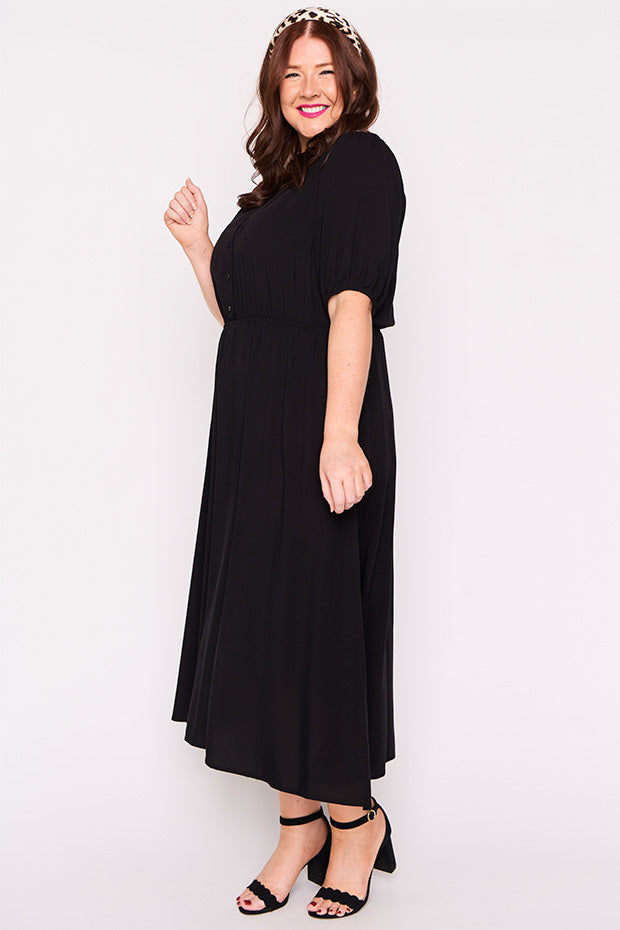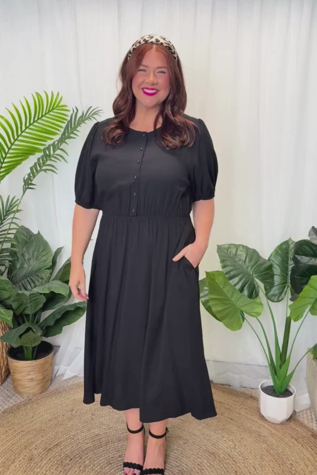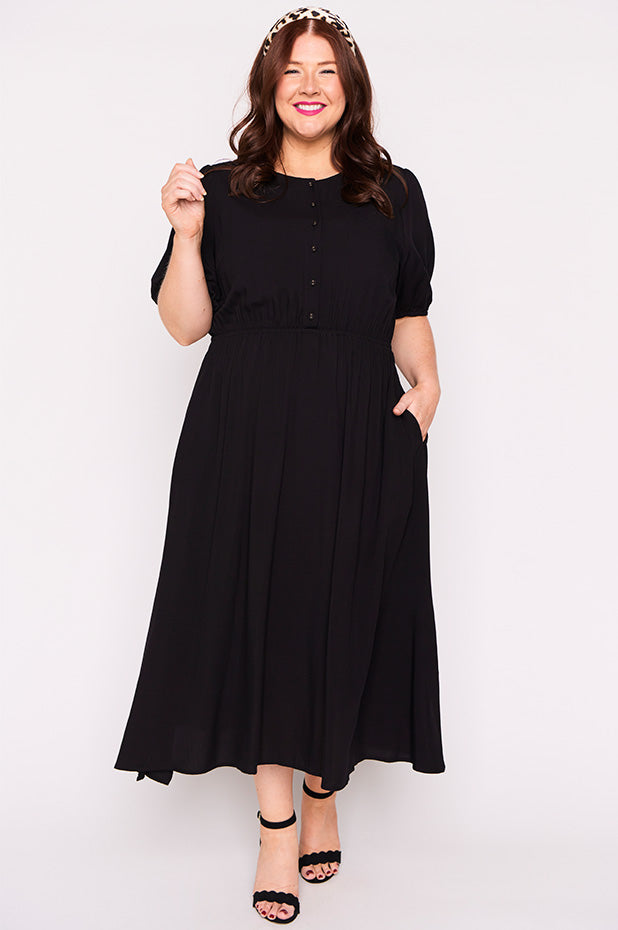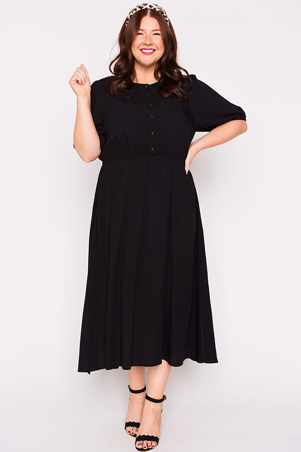 Well made dress in soft breathable rayon. Comfortable in all the right ways. Can dress it up or down. Perfect for work, home or socialising. Fits an ample bust and buttons are nice and secure