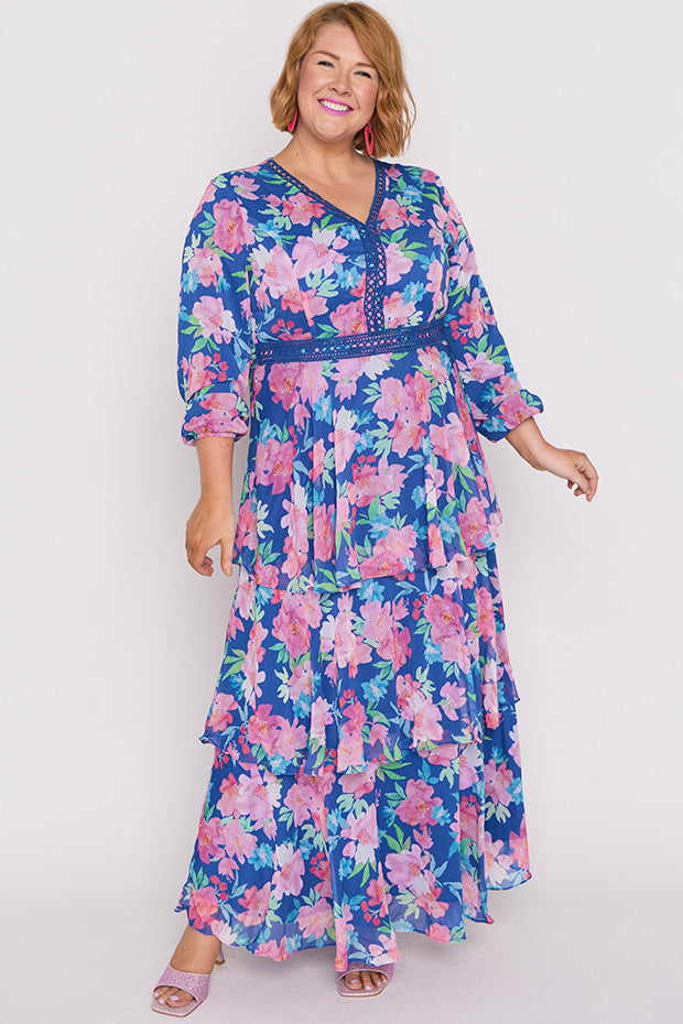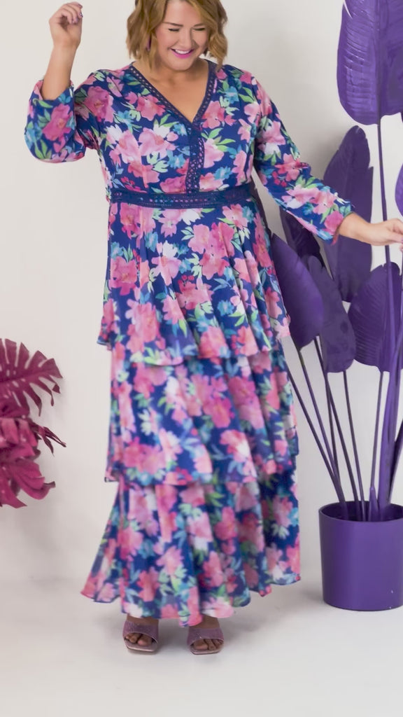 Featuring delicate lace detailing throughout the v-neckline, with loose full length peasant sleeves. It has a relaxed fit up top, with zip up back. With an elastic back waistline and a full flowing 3-tiered fully lined maxi skirt 👗