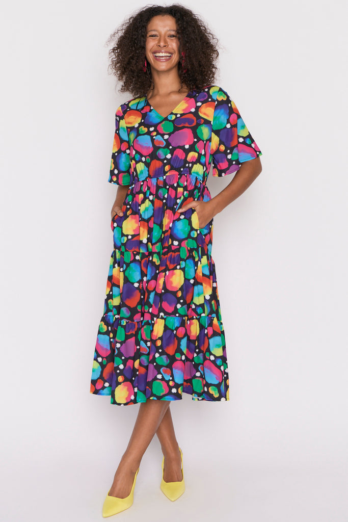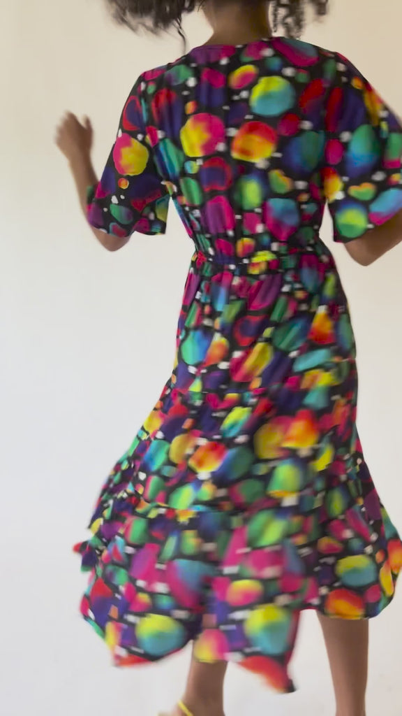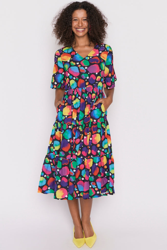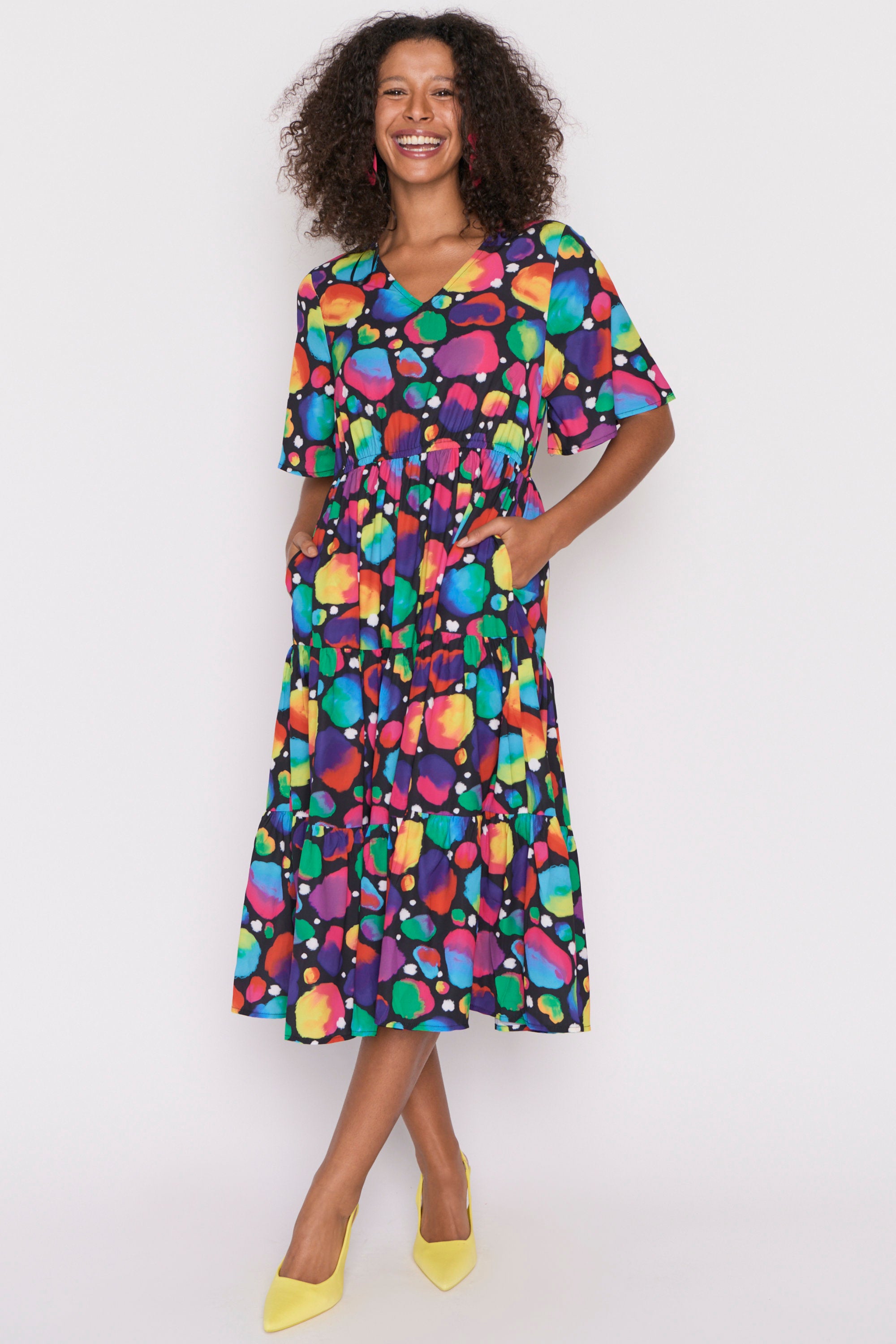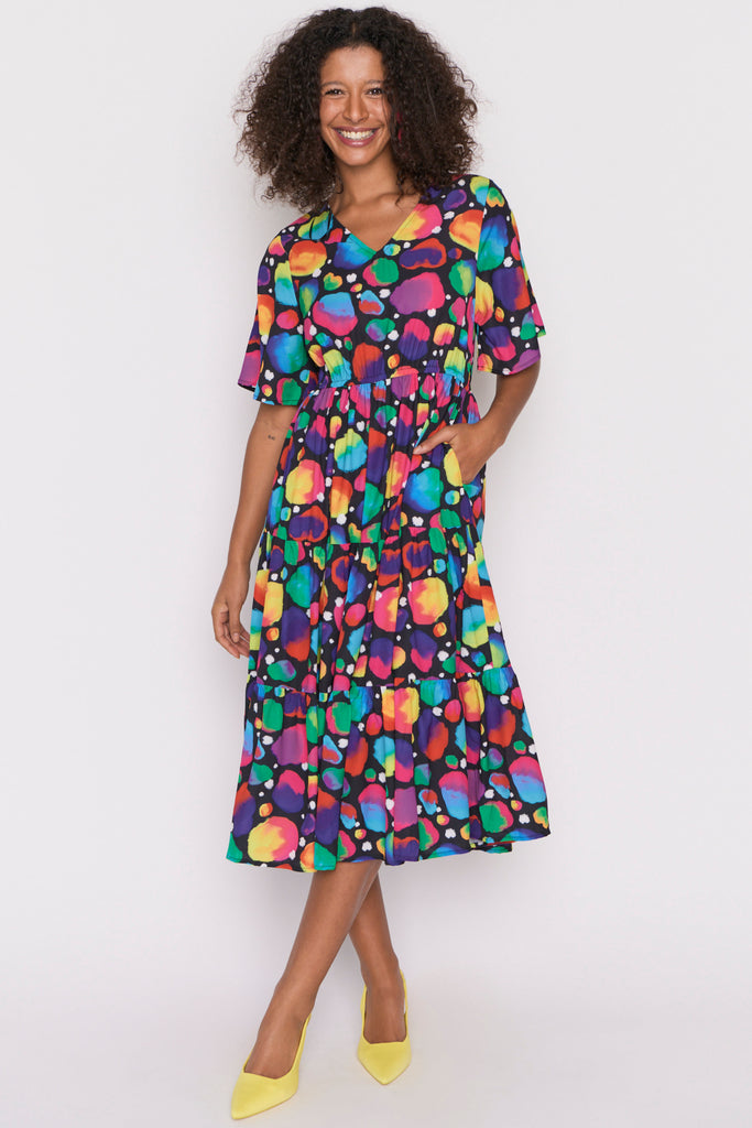Featuring a V neck & loose flared short sleeves. It has an a-line babydoll shape with a cinched elastic waistline. The tiered skirt falls loosely from the bust and adds volume & a gorgeous silhouette. Don't forget about those hidden pockets and light weight poly fabrication 😍