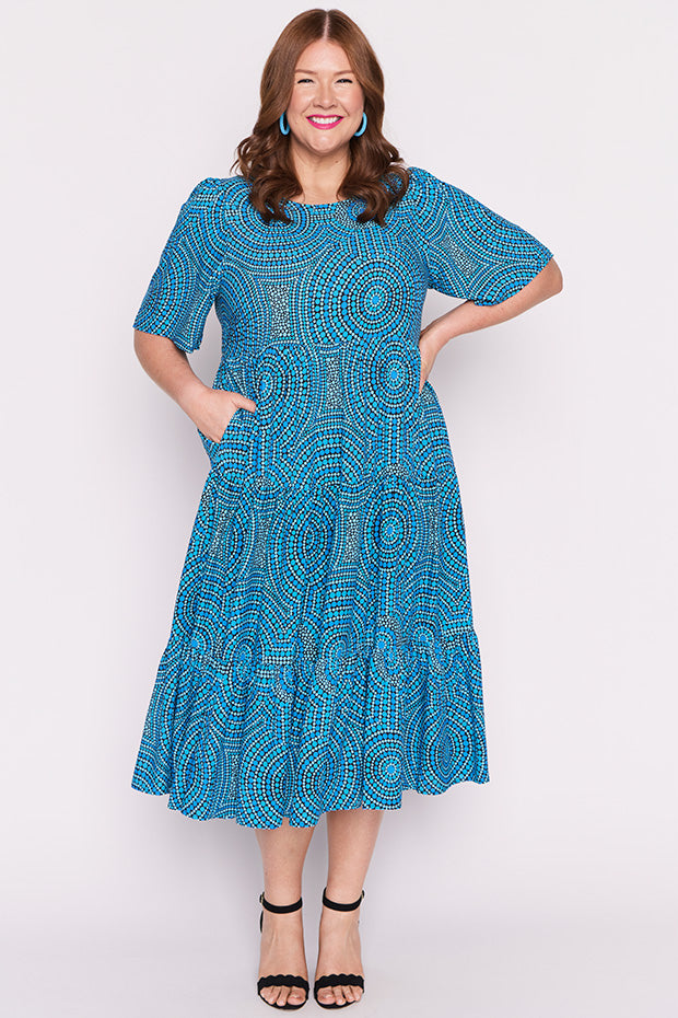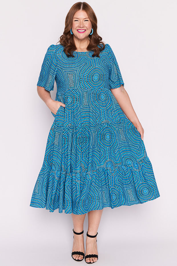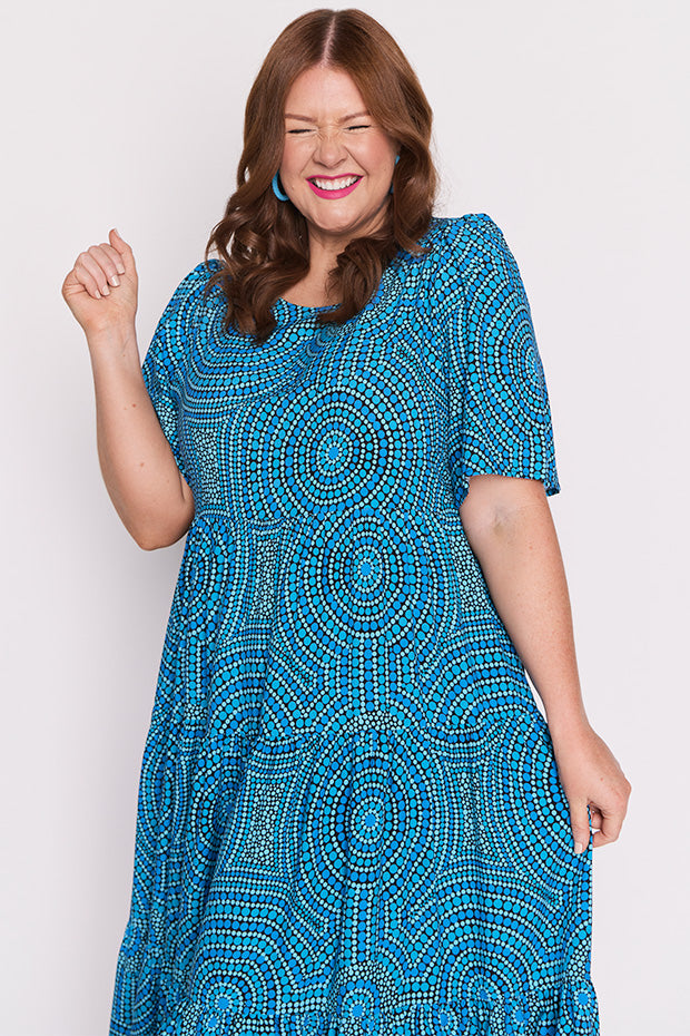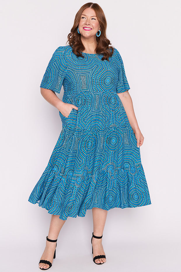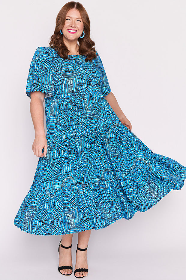 In this vibrant Charli Dress featuring the Plenty of Water print by the ever talented artist Mara May, "Plenty of Water," the flowing currents of the river are depicted as a life-giving force, symbolizing the essential role water plays in our existence. The artwork captures the shimmering blues of the water, reflecting its purity and vitality. Each ripple and wave conveys a sense of movement, reminding us of water’s dynamic nature and its ability to rejuvenate.