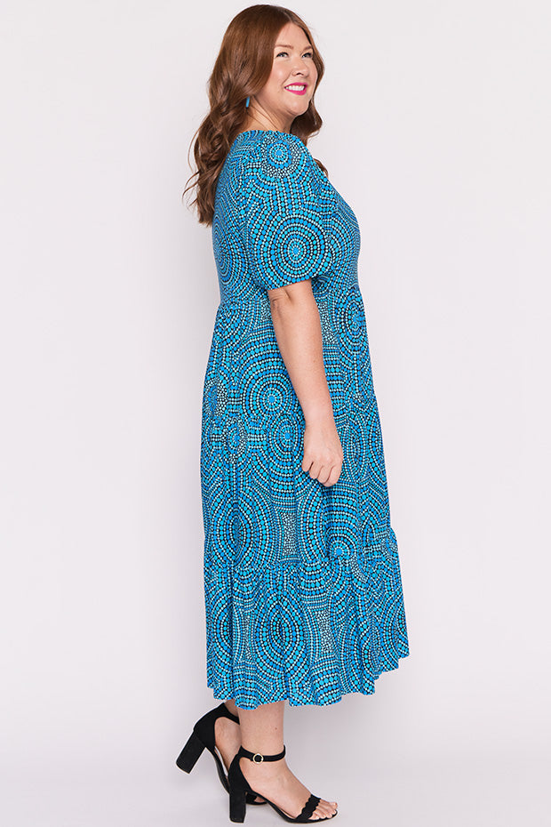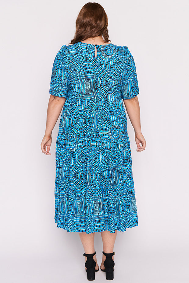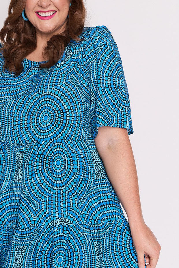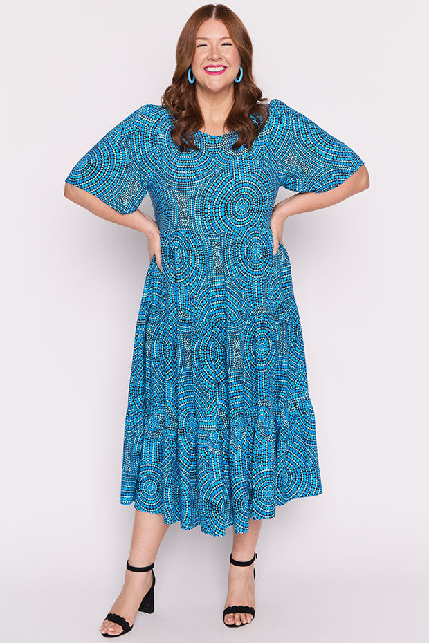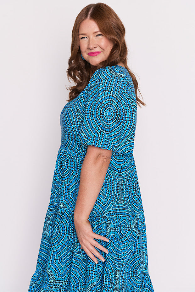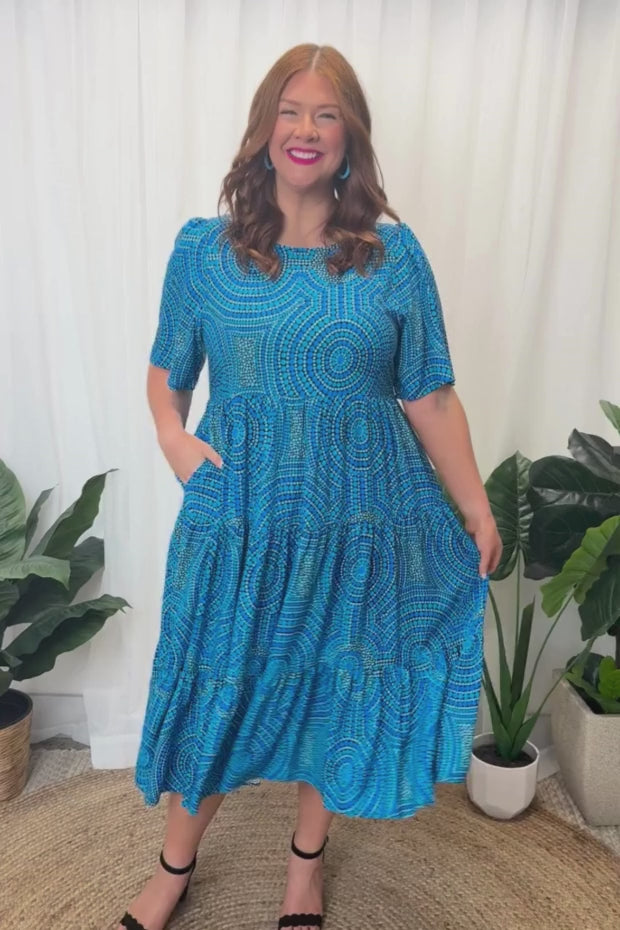 In this vibrant Charli Dress featuring the Plenty of Water print by the ever talented artist Mara May, "Plenty of Water," the flowing currents of the river are depicted as a life-giving force, symbolizing the essential role water plays in our existence. The artwork captures the shimmering blues of the water, reflecting its purity and vitality. Each ripple and wave conveys a sense of movement, reminding us of water’s dynamic nature and its ability to rejuvenate.