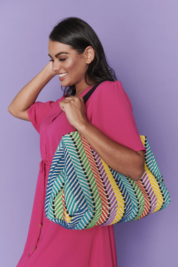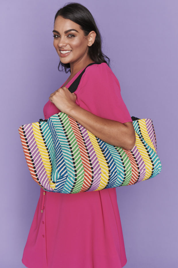 Refresh your wardrobe with our Circus Stripe Rainbow Carry All! This boho sheak inspired piece can be dressed up with wedges, or dressed down with white sneakers for some fun in the sun! ☀️