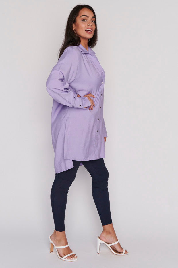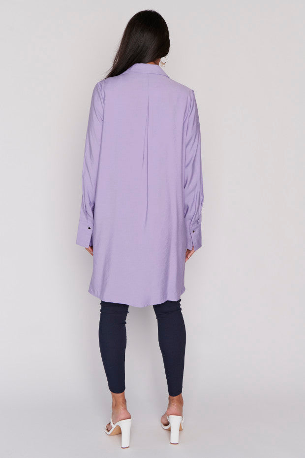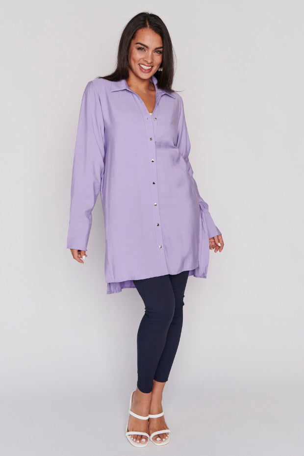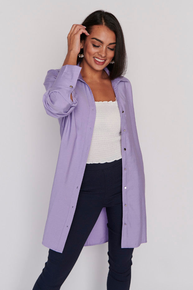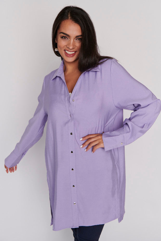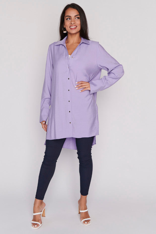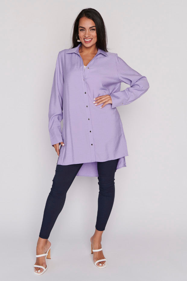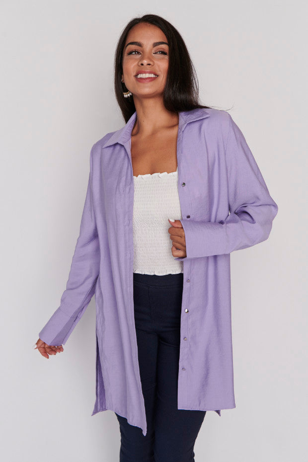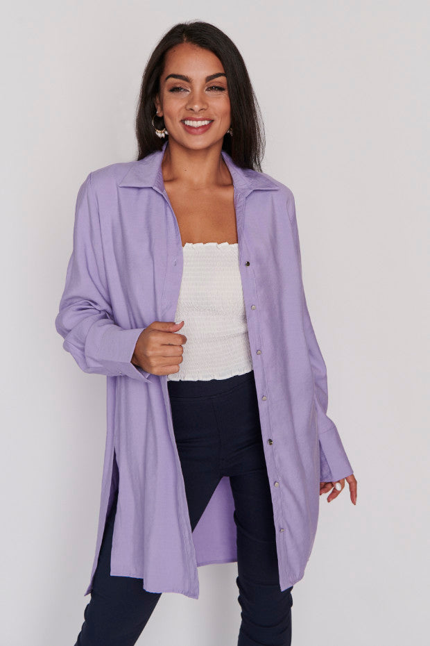 This bamboo viscose, nylon blend beauty features a full button up front with gorgeous silver buttons, shirt collar & long sleeves that can easily be rolled up for total comfort. The high-low, side split hem allows for unlimited styling options! It is a relaxed fit with a straight shift shape.