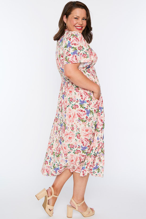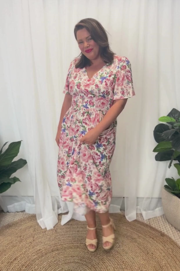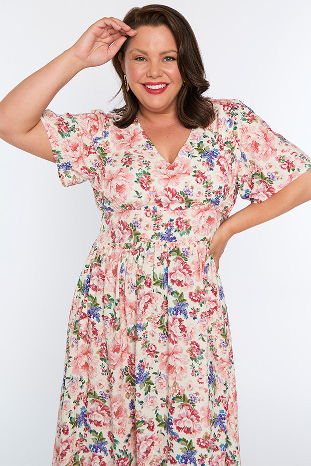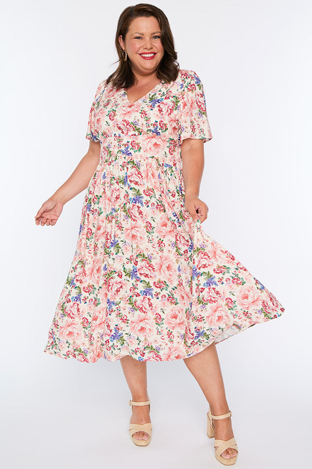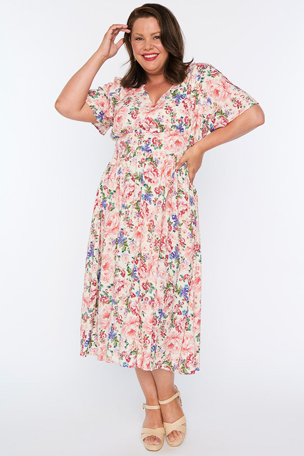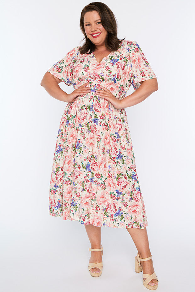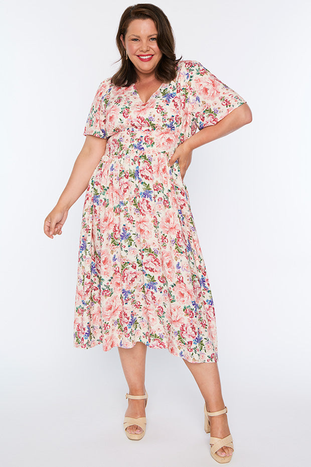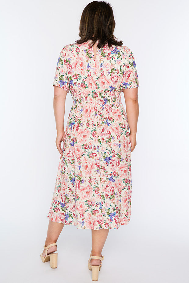 Flattering dress. Soft flowing fabric. Launders well. I get many lively comments when I wear this dress
