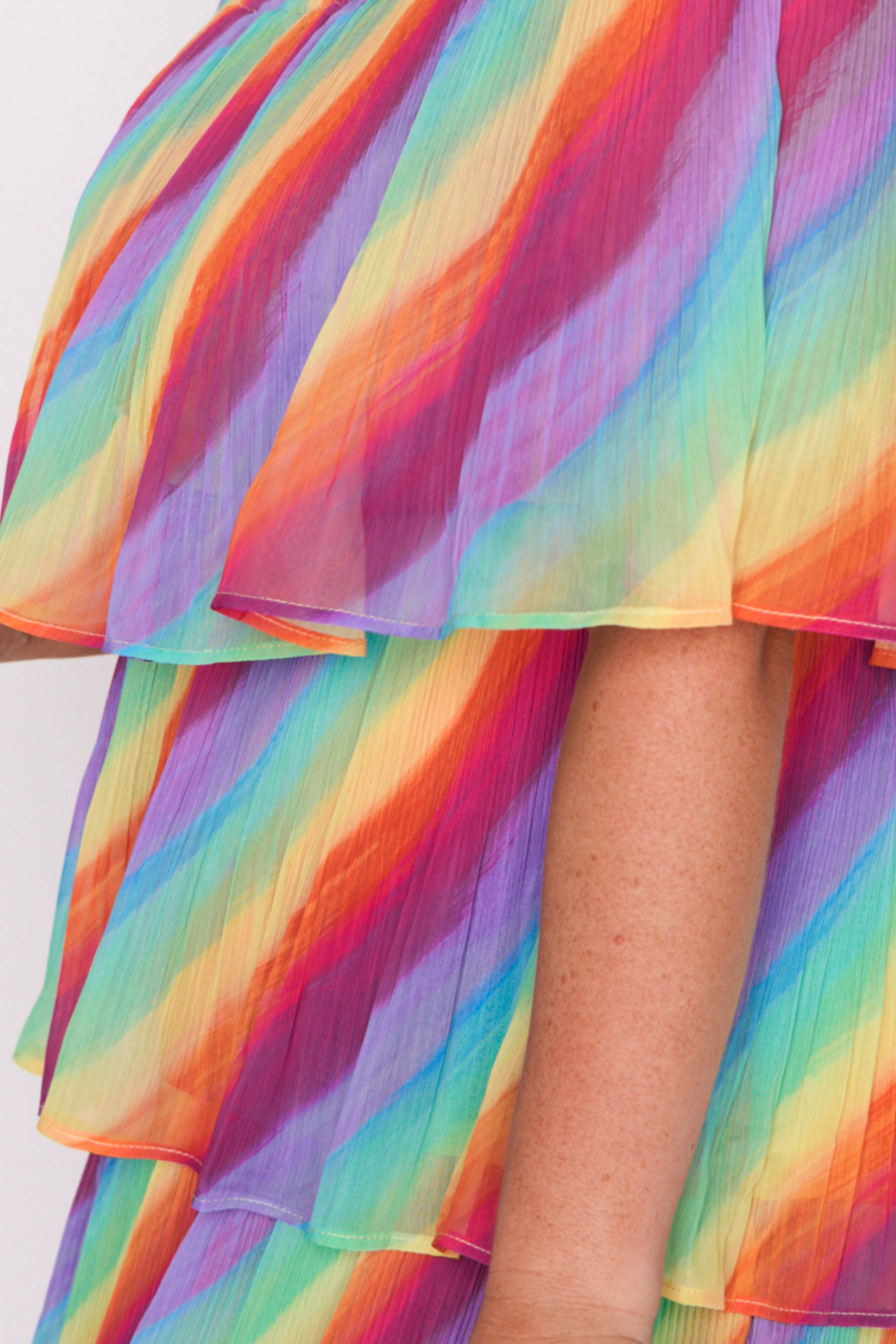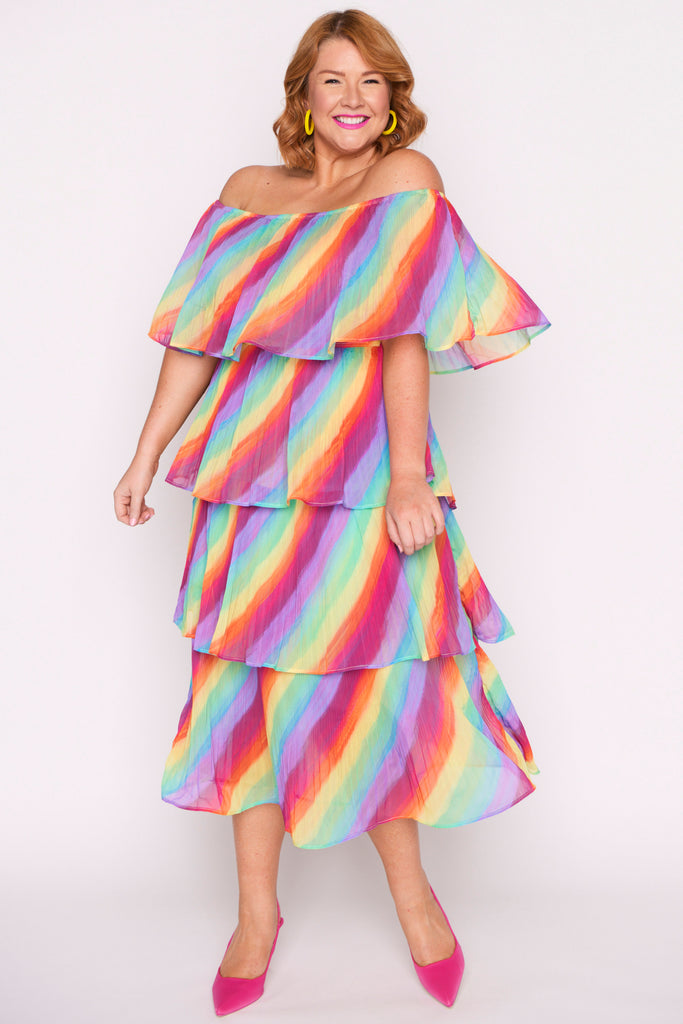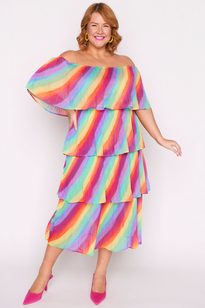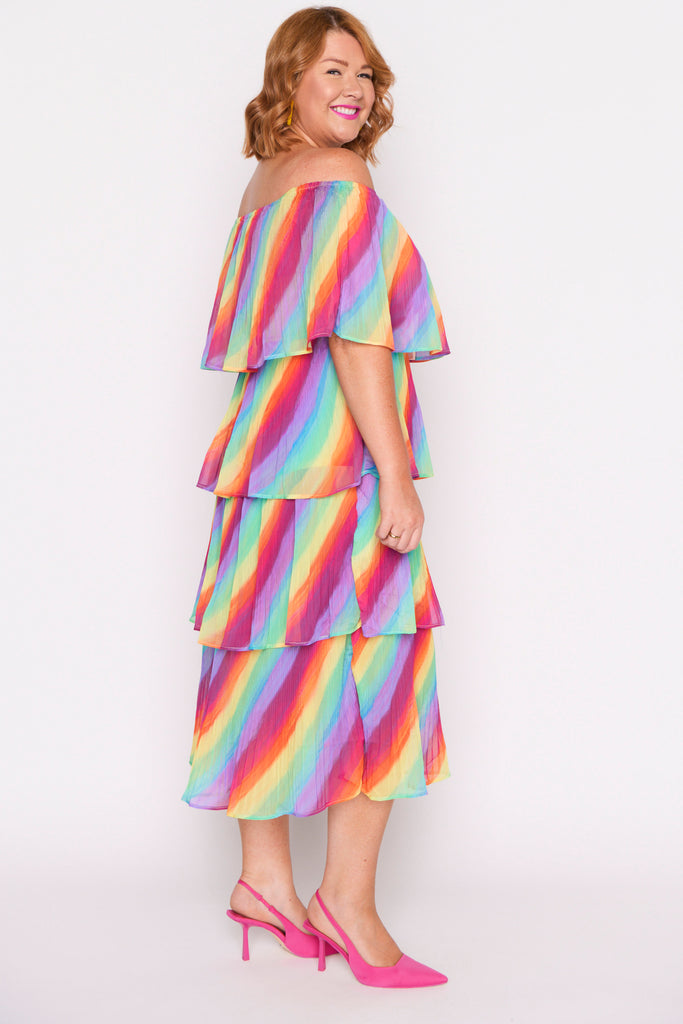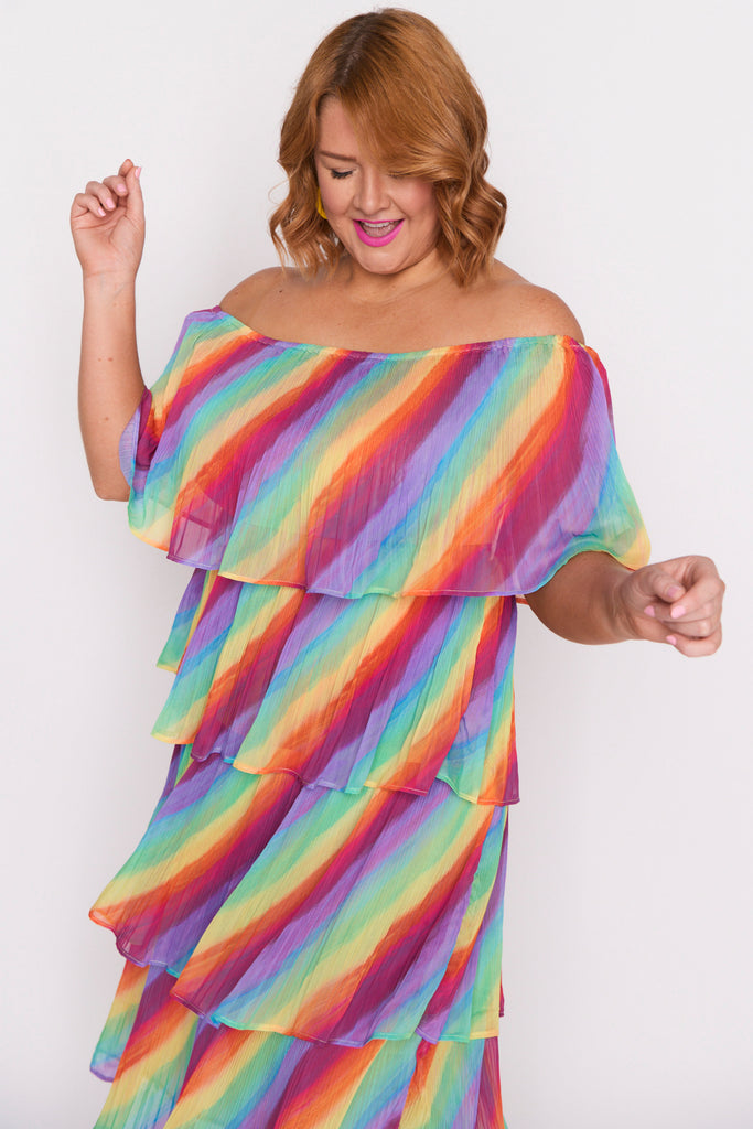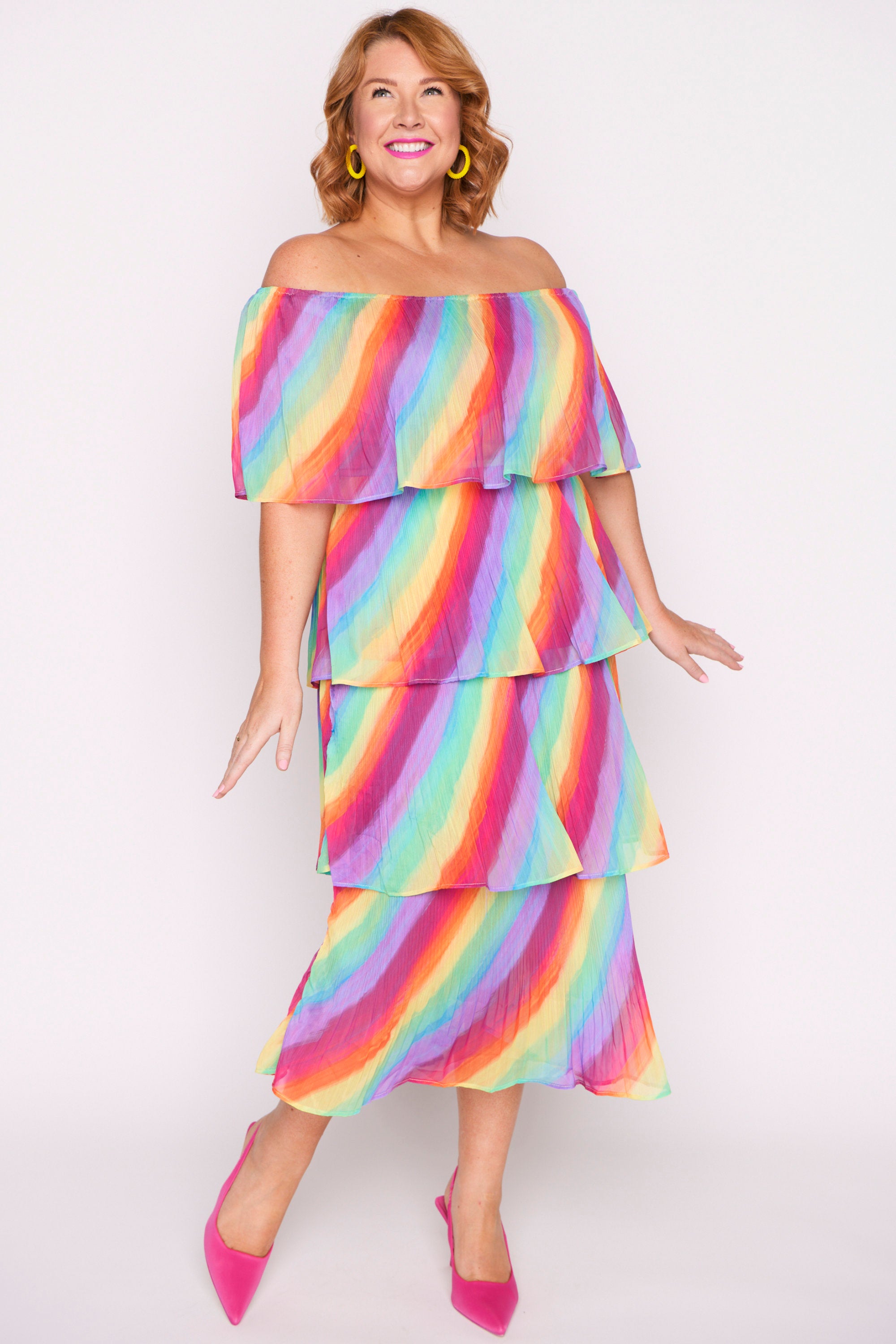 Featuring a pleated off the shoulder neck line with a fully lined 3 tiered pleated skirt, perfect for spins and twirls 😍