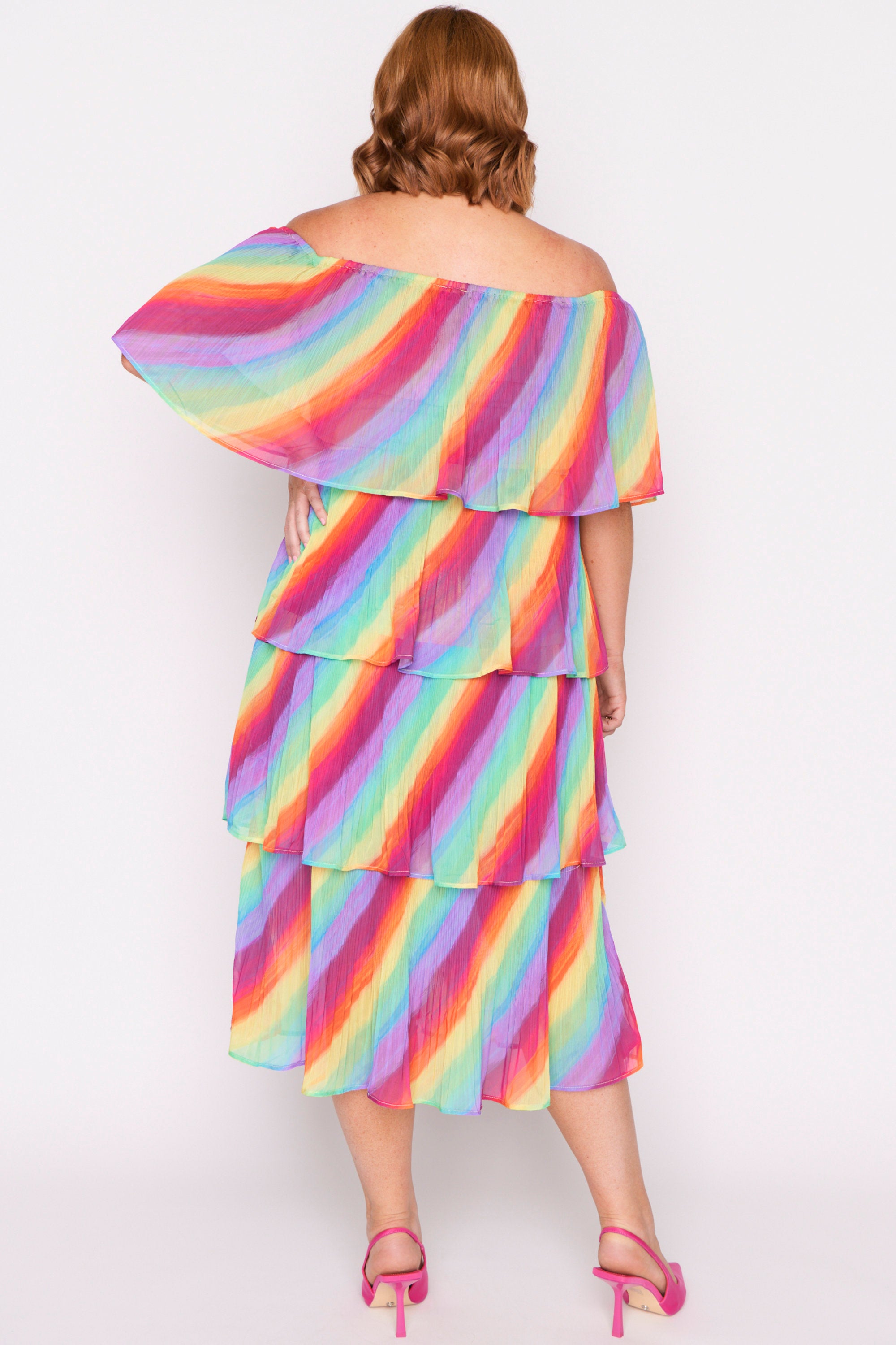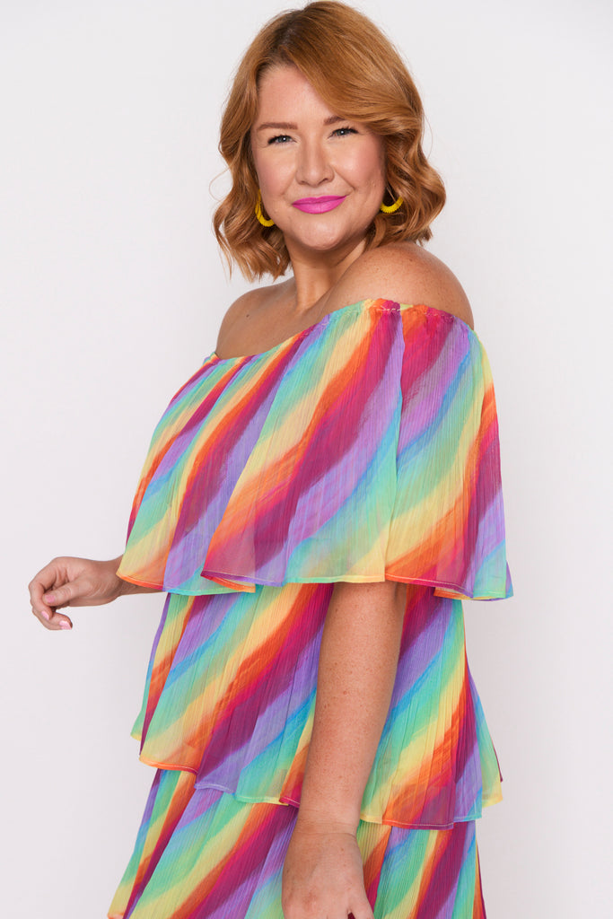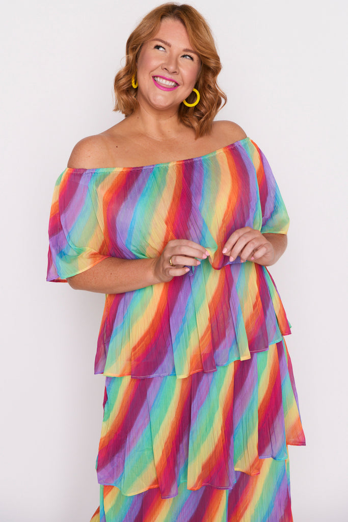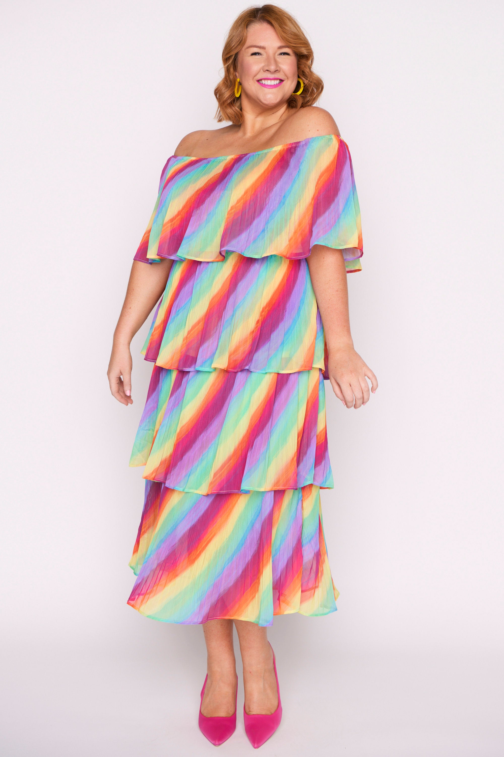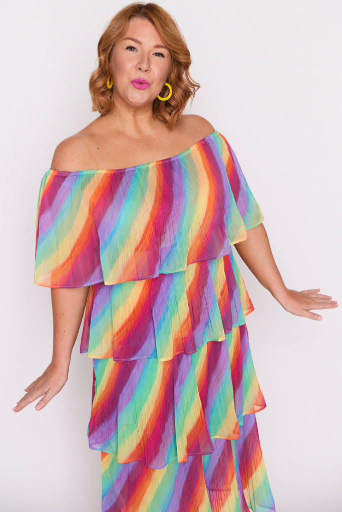 Featuring a pleated off the shoulder neck line with a fully lined 3 tiered pleated skirt, perfect for spins and twirls 😍