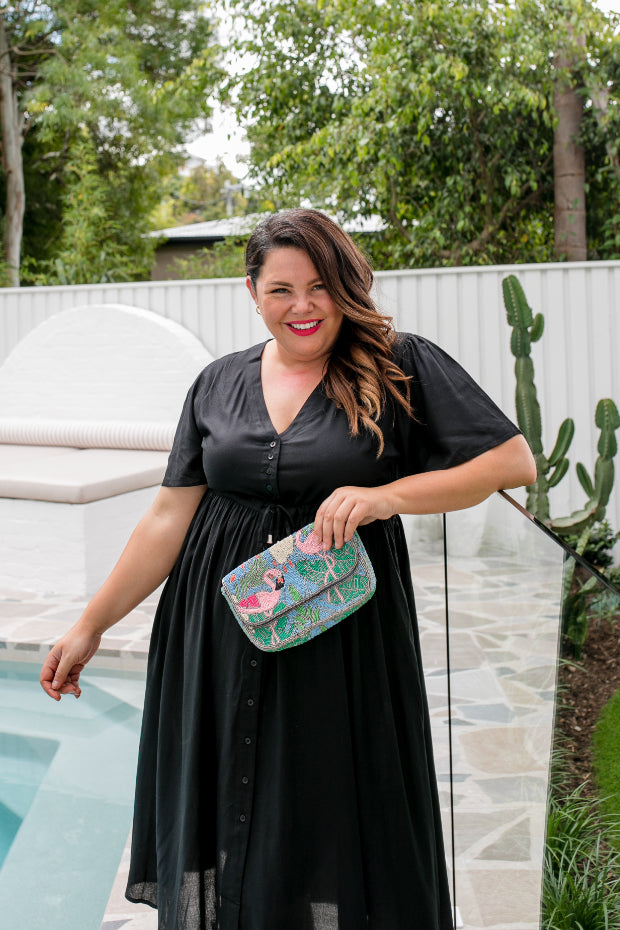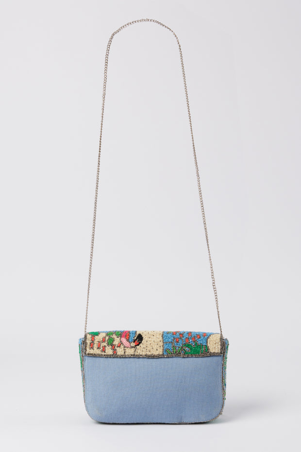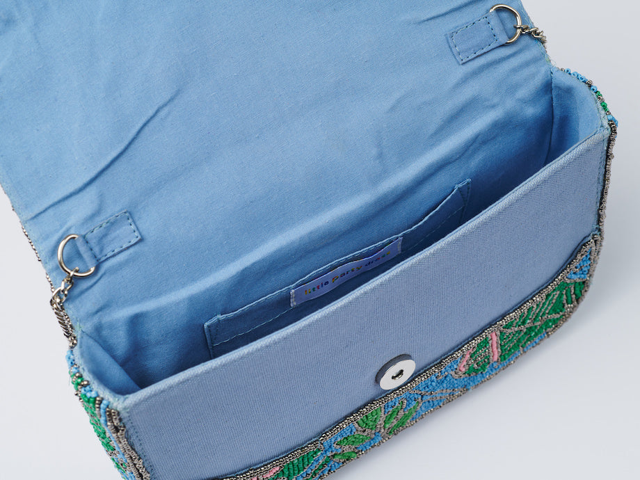 Featuring an intricately handsewn sequined frontage with velvet back. The fully lined, single interior compartment has an inner pocket set into the lining. Finished with a magnetised closure 👝