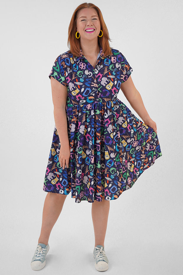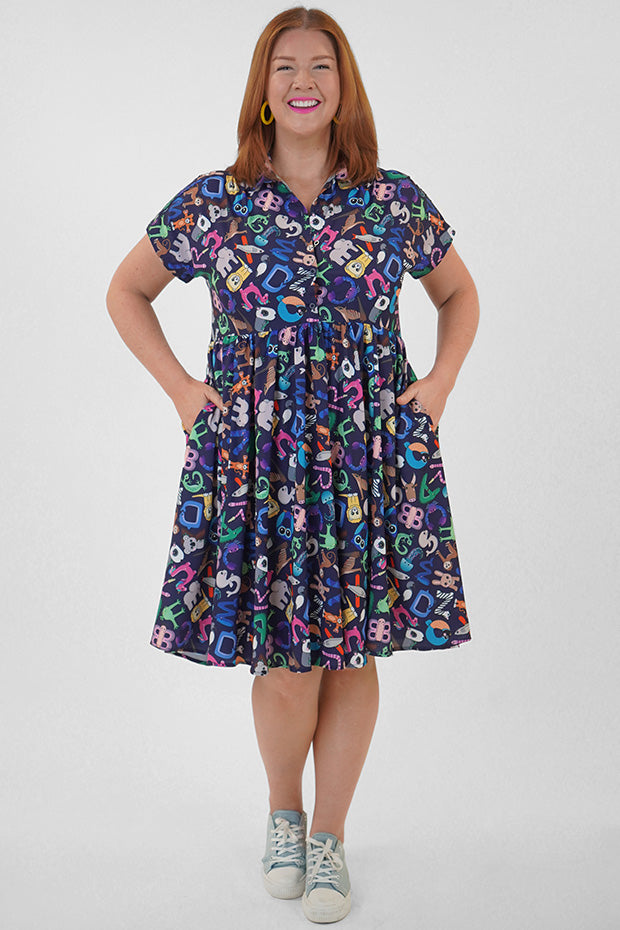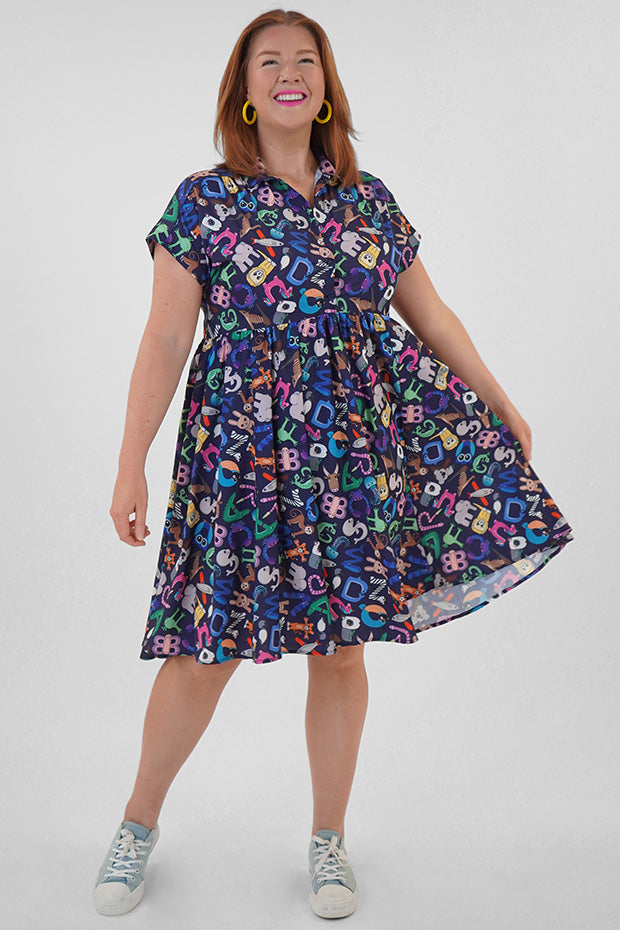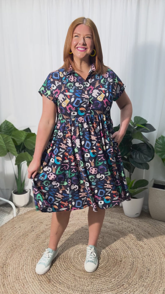 It featuresĀ aĀ collared button-up shirt neckline, with shortĀ wideĀ sleeves. ItĀ is an A-line shape, more fitted up top, then flares out into a full loose skirtĀ with the waistline dipping at the back. And to top it all off, it has POCKETSĀ too!