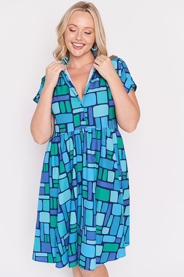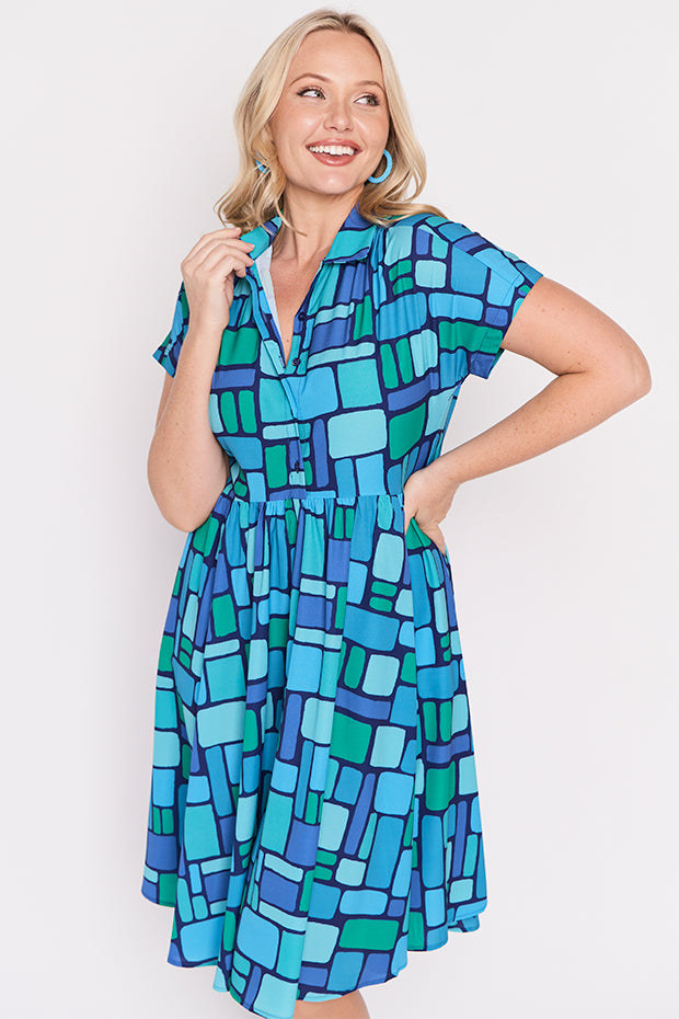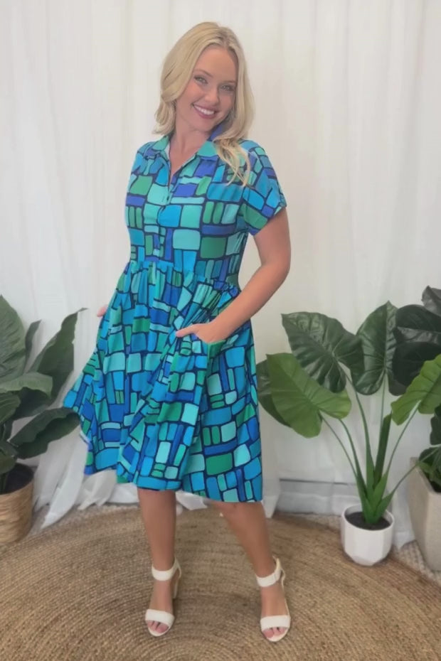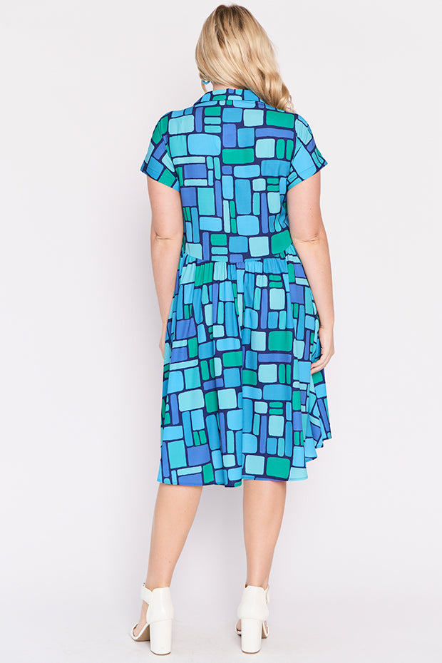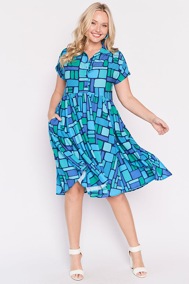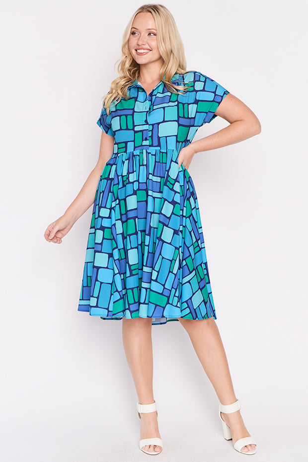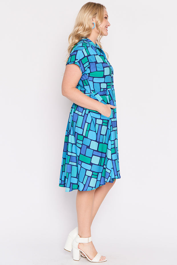 Love wearing this dress. I usually go for the flower patterns but got his to wear to more 'serious meetings. Love that I don't have to iron it and I wear it with silver shoes.