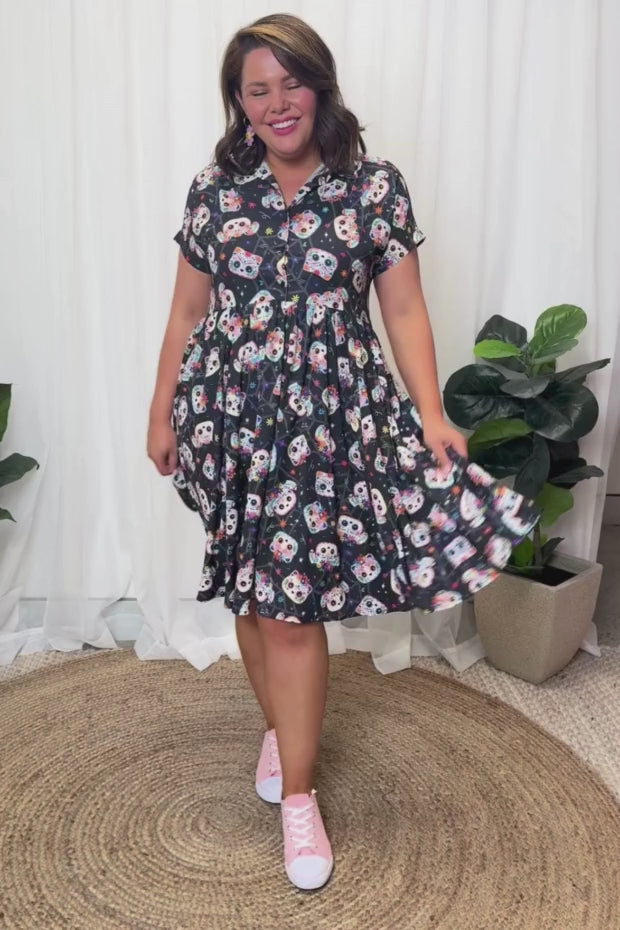 It features a collared button-up shirt neckline, with short wide sleeves. It is an A-line shape, more fitted up top, then flares out into a full loose skirt with the waistline dipping at the back. And to top it all off, it has POCKETS too!
