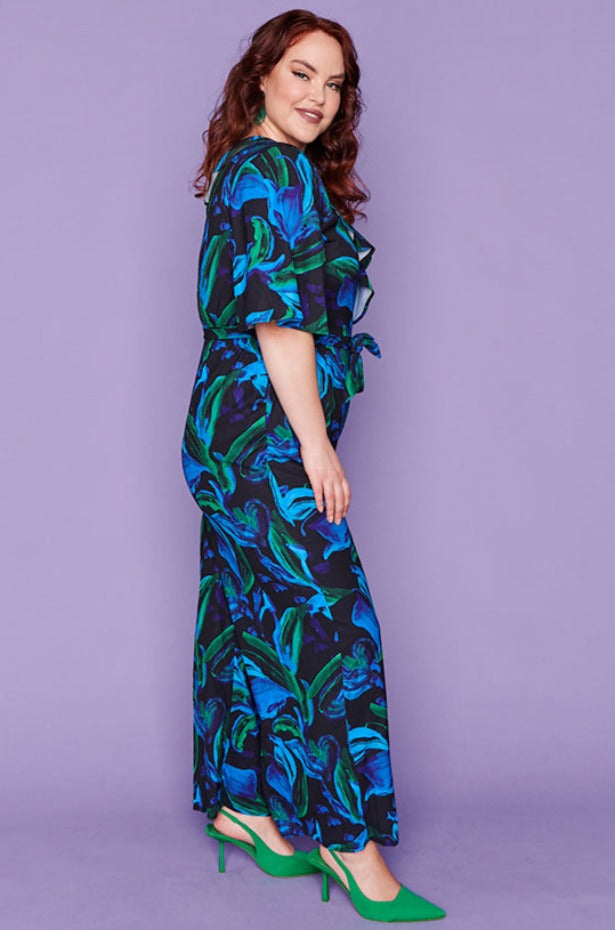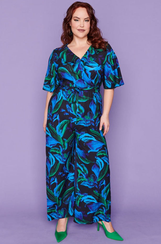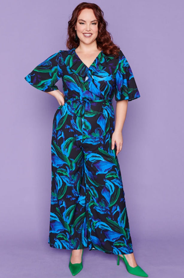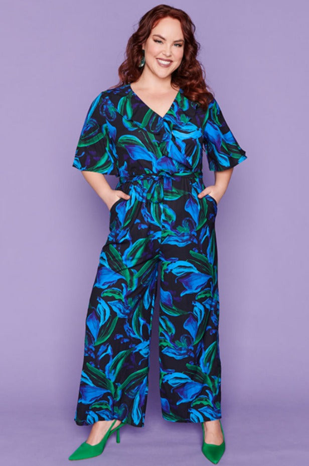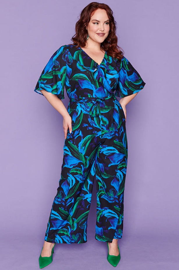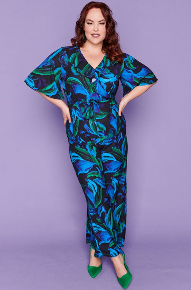 Featuring gorgeous cross-over V neck with an added frill at the bust with loose elbow length flared sleeves. The body is a relaxed fit, elastic back with a side zipper & tie-up belt to create a flattering shape. The pants have a straight wide-leg silhouette, creating that effortless holiday glamour! ☀️