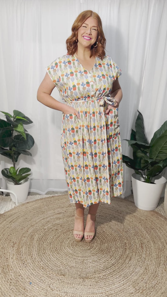 Constructed in a lightweight cottonĀ this dress features a loose fit throughout, with a button up v-neckĀ & wide sleeves. It hasĀ a very stretchy elastic waist with tie-up belt, and aĀ looseĀ midi skirt with big pockets on the front!Ā