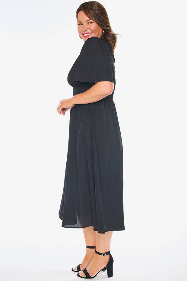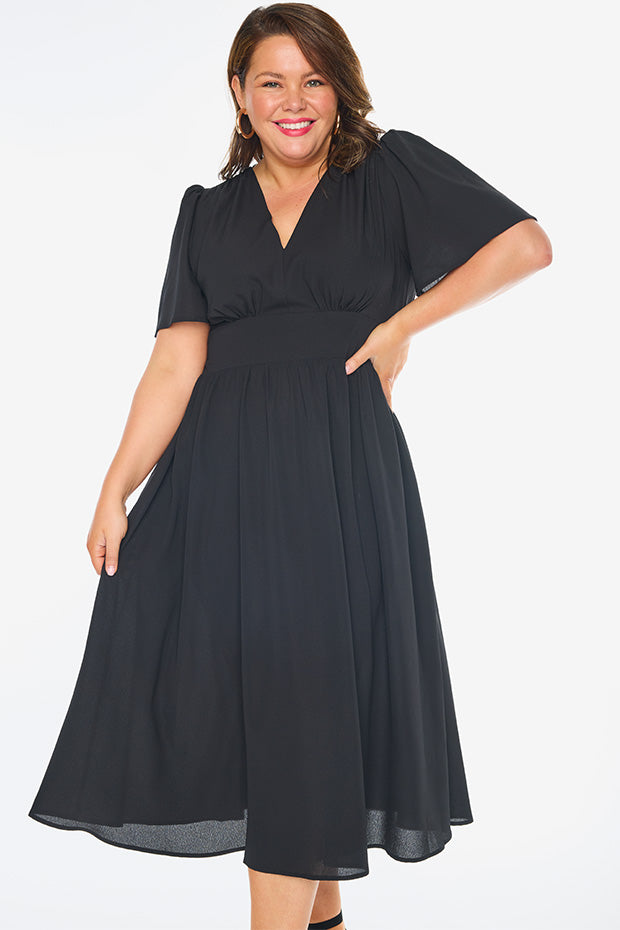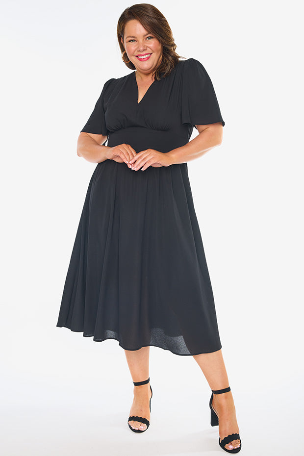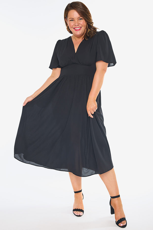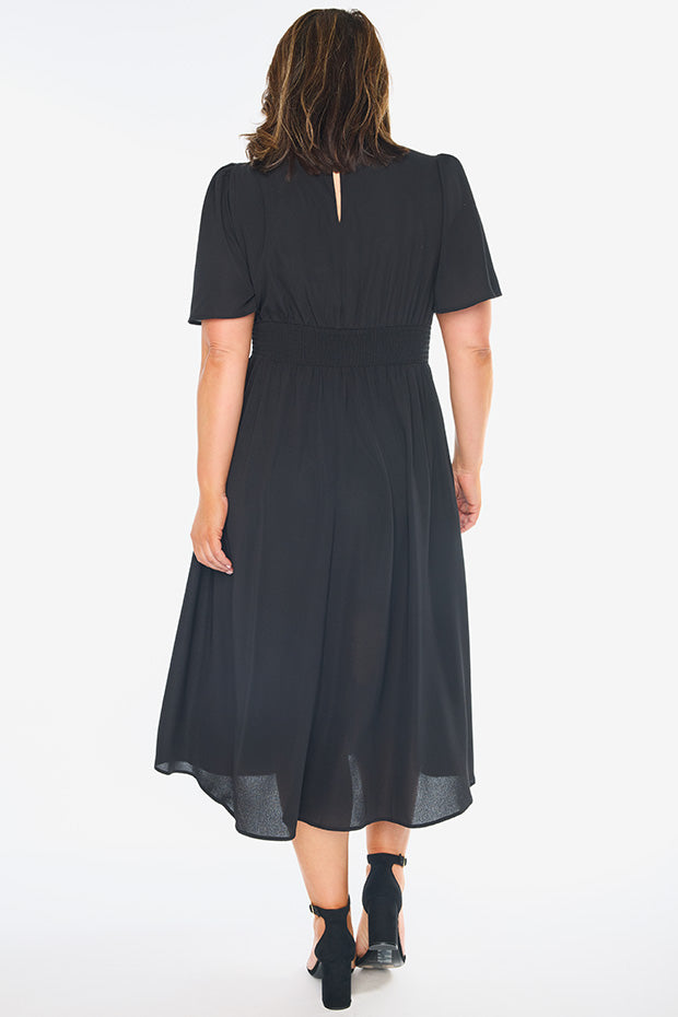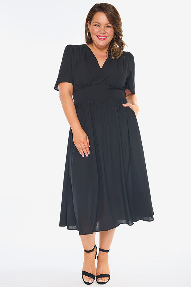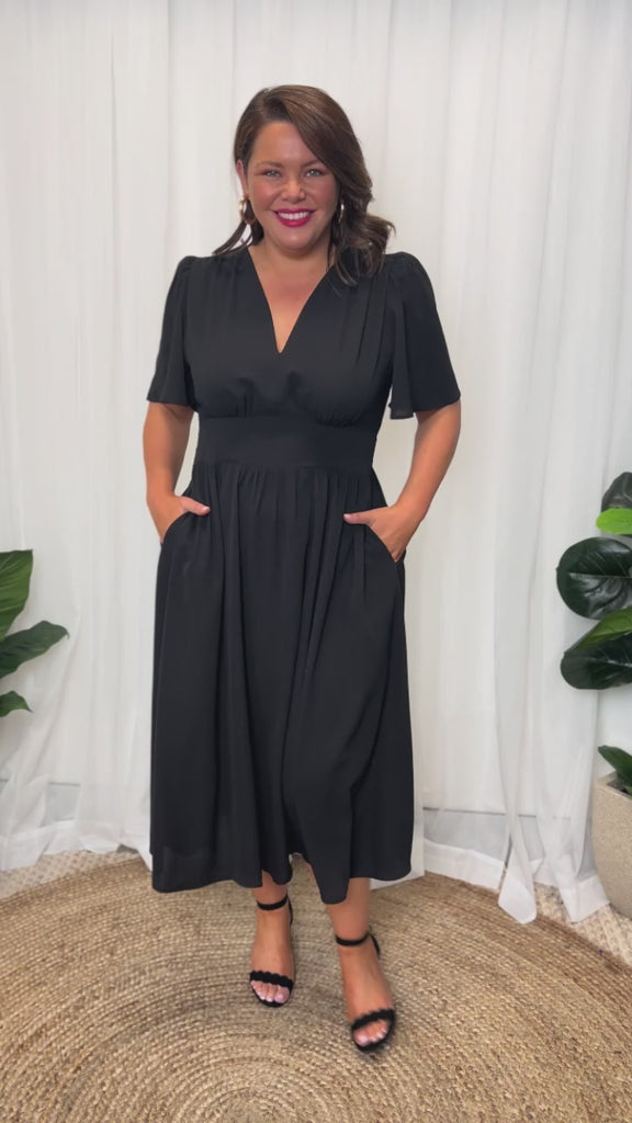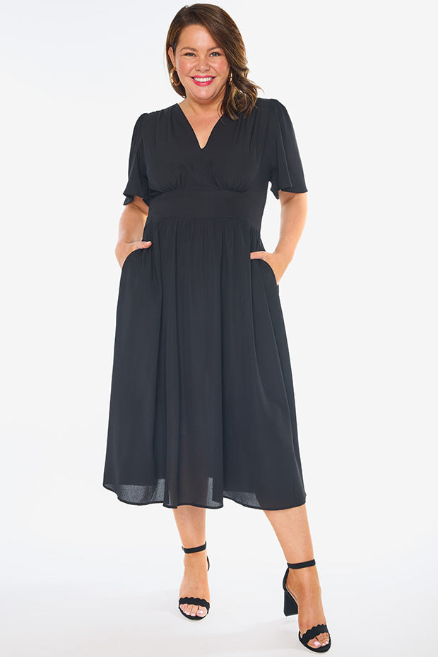 This light weight polyester dress features aĀ fitted v neckĀ frontĀ with aĀ top back closureĀ andĀ short flutter sleeves. The bodice has aĀ fitted front waist, whilst the stretchyĀ shirred elastic back provides the ultimate comfort.Ā We love theĀ mid length skirt,Ā and of course.. the pockets!