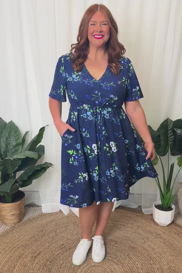 Step into timeless elegance with this Jaz Dress, featuring our delicate Blue Blossom print. Soft and feminine, soft petals and leafy accents that bloom all over! Making it perfect for both casual days and special occasions.
