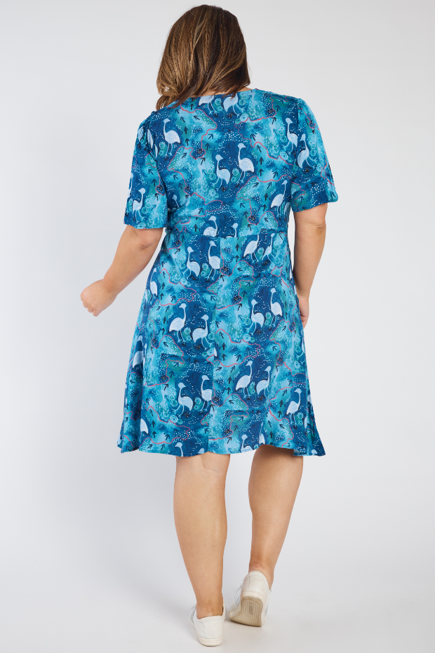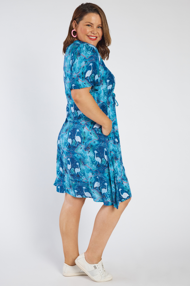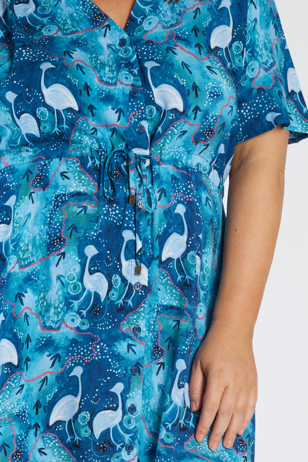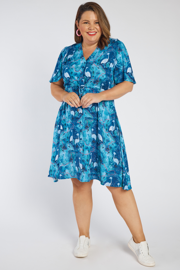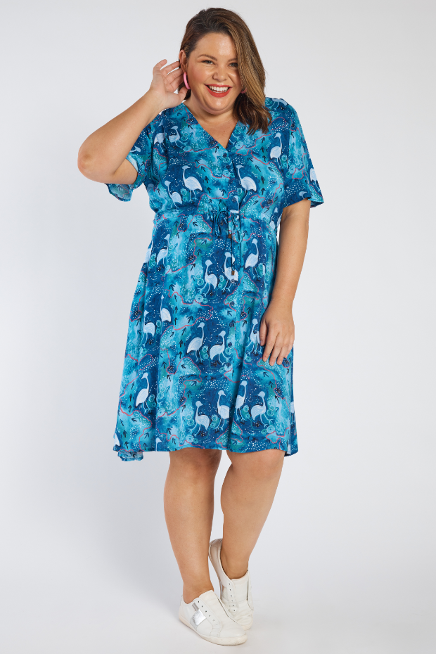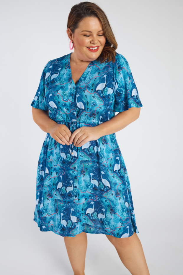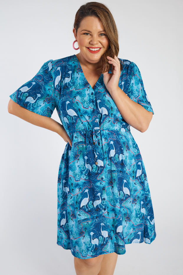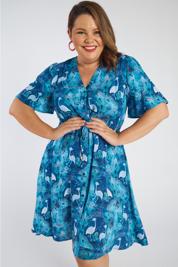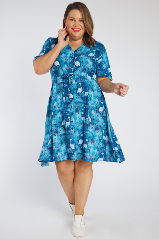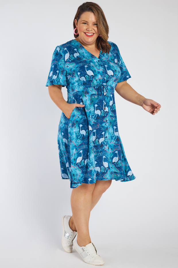 The Jaz Night Sky Dress features a loose bodice, with short wide sleeves & a structured button up placket V-neckline. We love the comfy drawstring waist, with a loose flowing skirt that is ready for a twirl! Finished off with hidden pockets, this versatile dress is the wardrobe life saver you’ve been looking for!