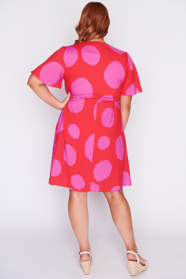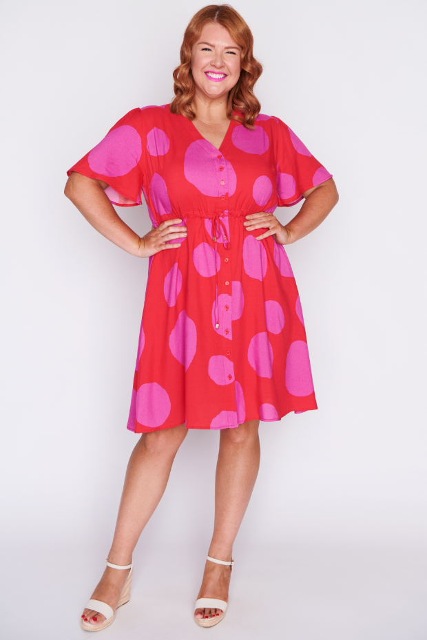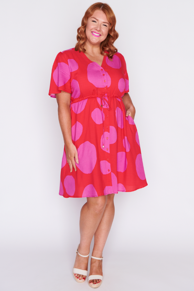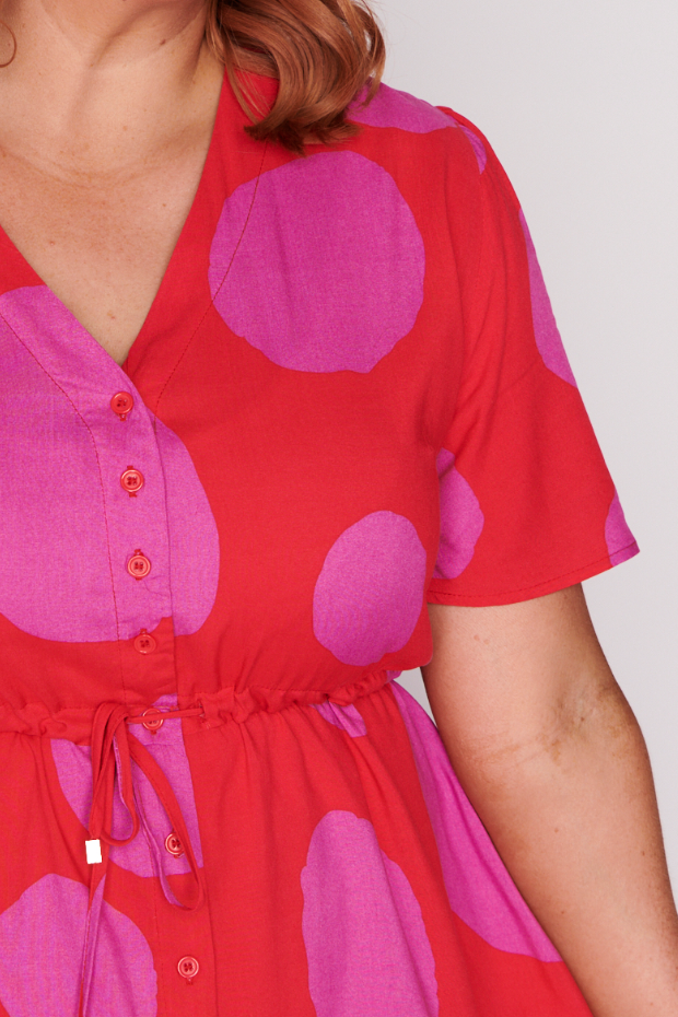This light weight rayon dress features a loose bodice, with short wide sleeves & a structured button up placket V-neckline. We love the comfy drawstring waist, with a loose flowing skirt that is ready for a twirl!