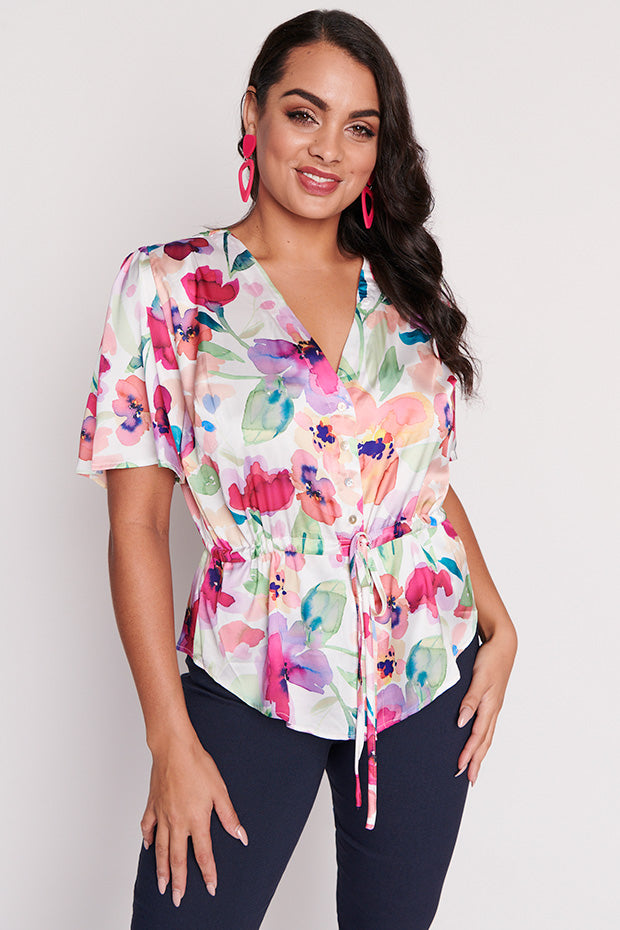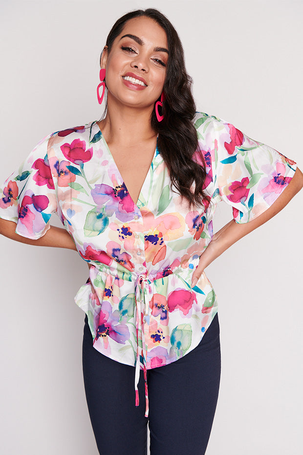 Featuring a loose bodice with short wide sleeves & a button up V-neckline. We love the comfy drawstring waist that allows for a gorgeous, cinched waist moment 🙌