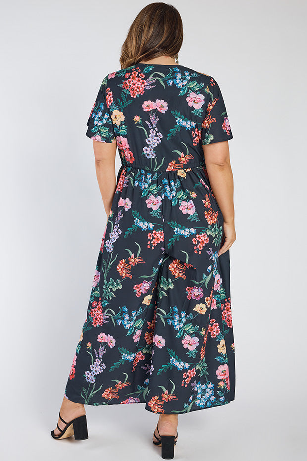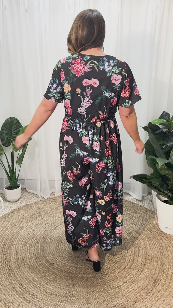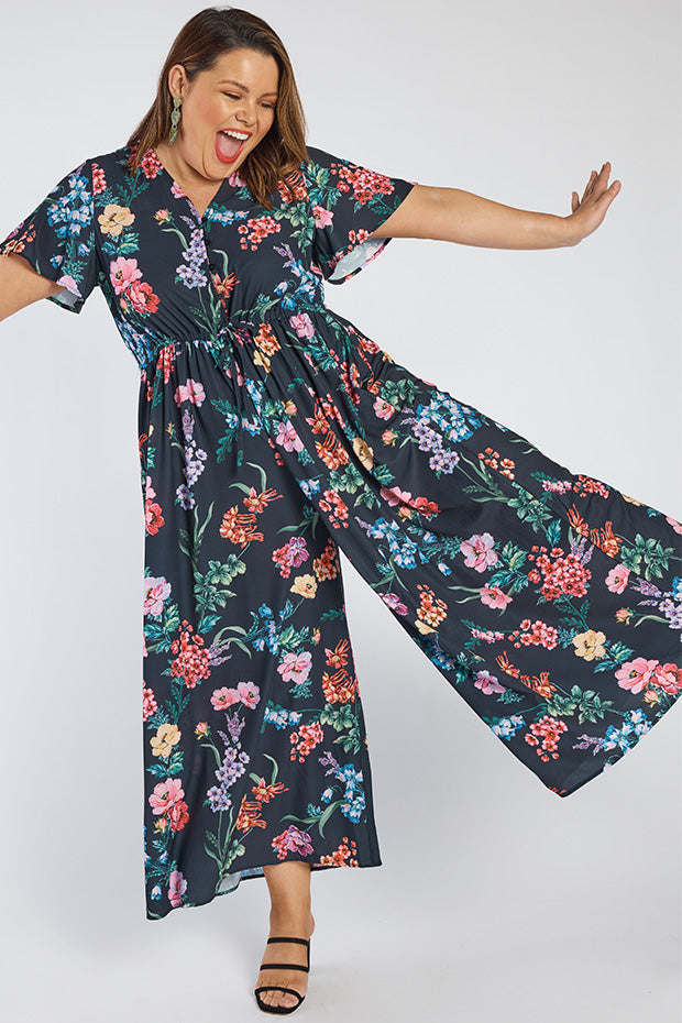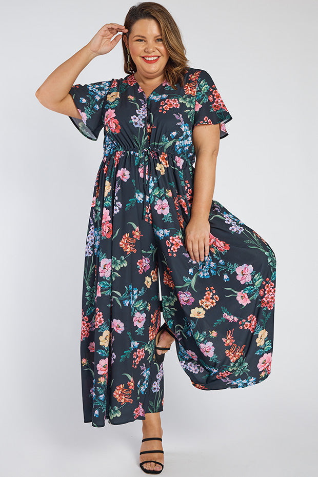 It features a loose bodice, with short wide sleeves & a button up V-neckline. We love the comfy drawstring waist ensuring you get the perfect fit every-timeThe bottom half flares out to on-trend wide leg pants 💕
