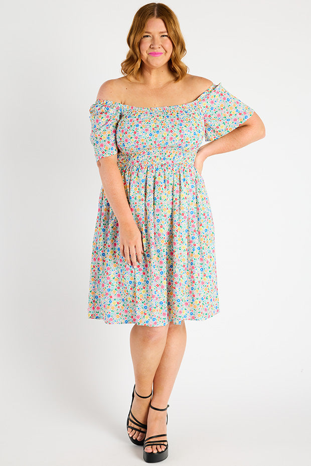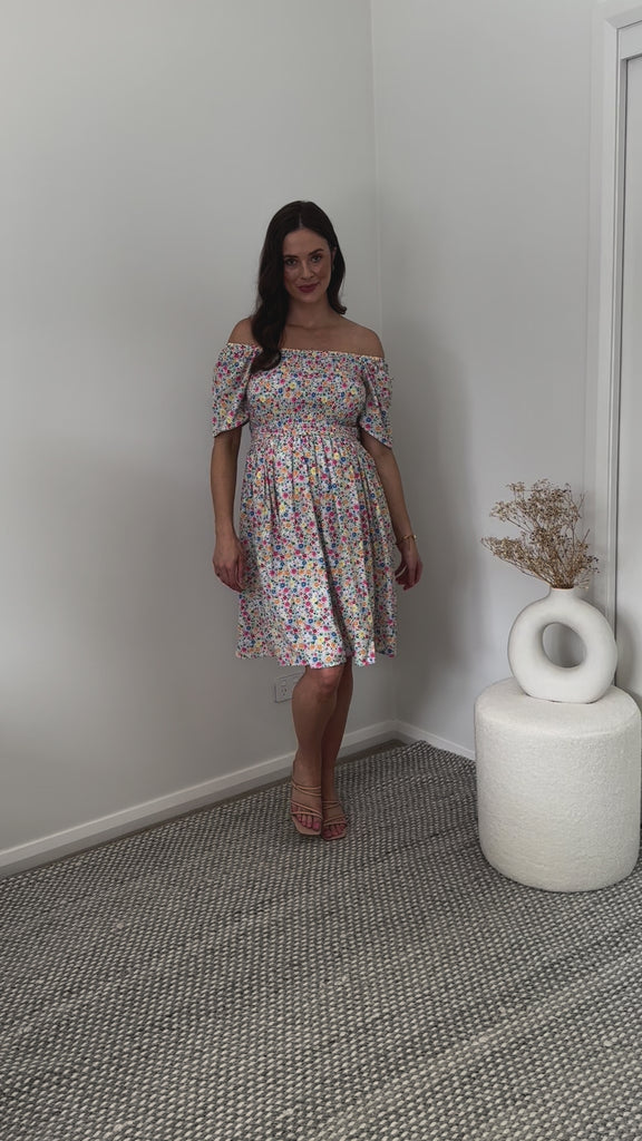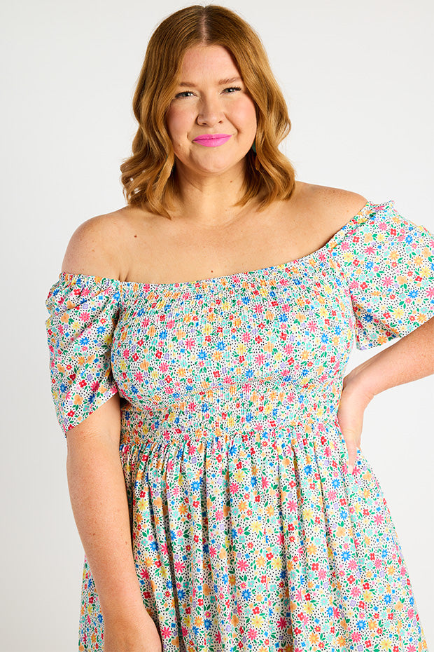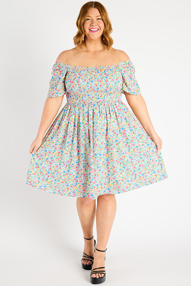 Featuring a fully shirred stretchy bodice, and stretchy short sleeves that you can wear on or off the shoulder 🙌🏼 Below the waist the skirt is very loose and flowy, with hidden pockets to finish it off!