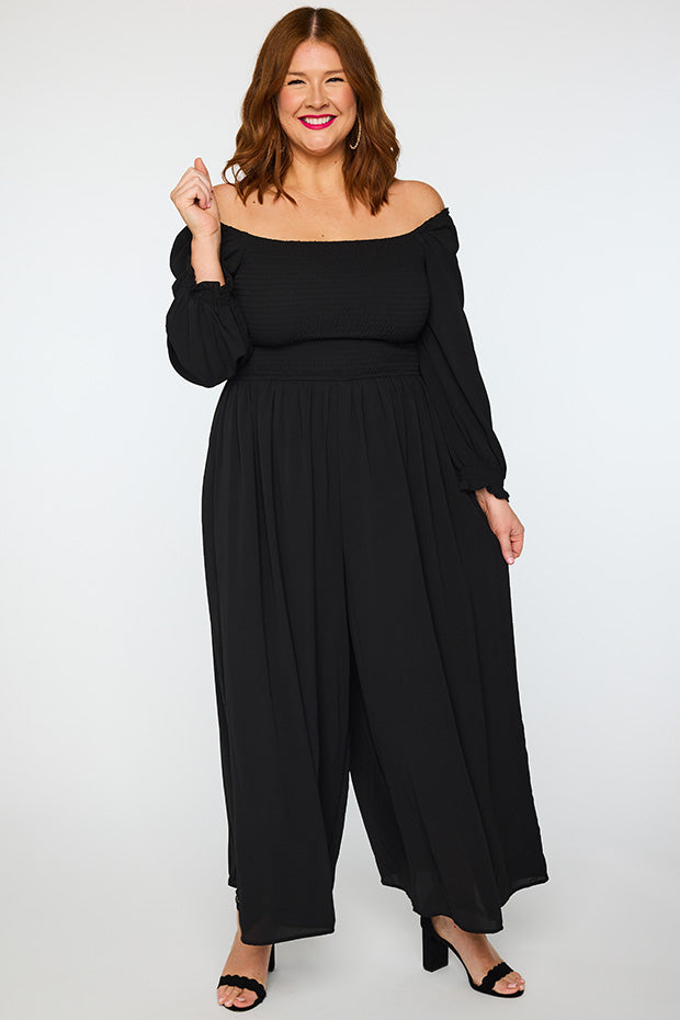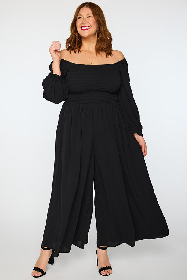 It features a shirred bodice, with long wide sleeves with a shirred cuff & a neckline you can wear ON or OFF the shoulder. The bottomĀ halfĀ flares out to on-trend wide leg pants.