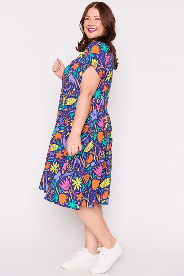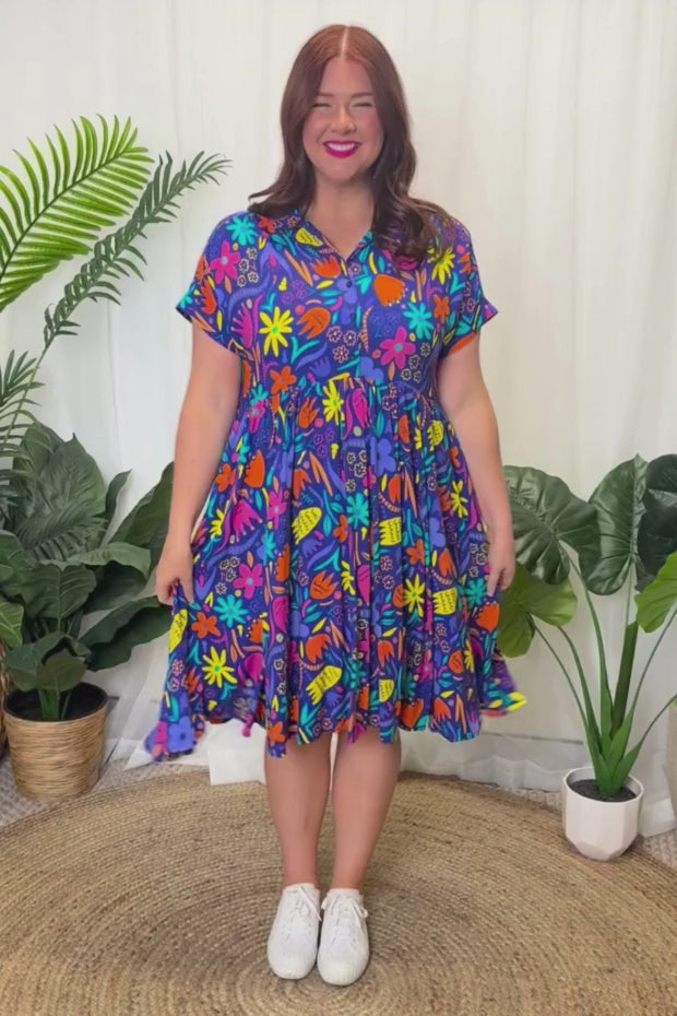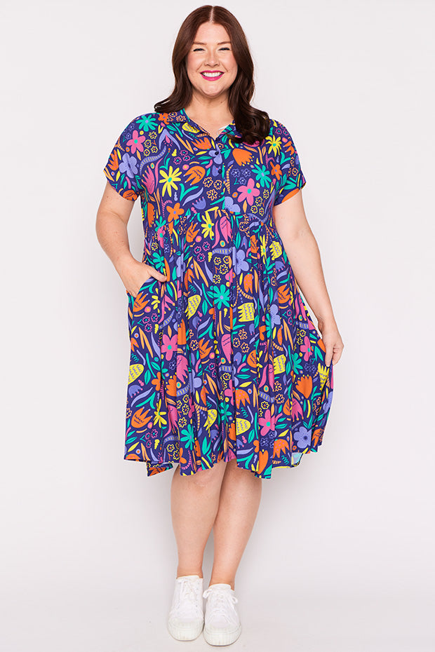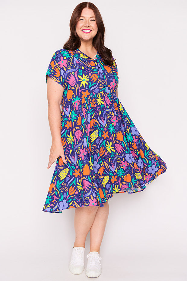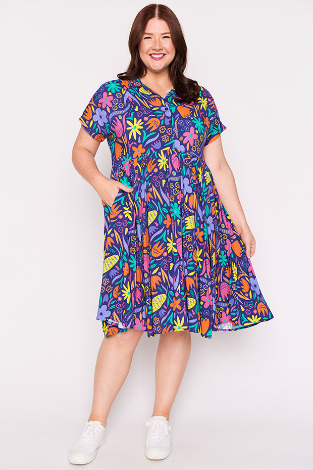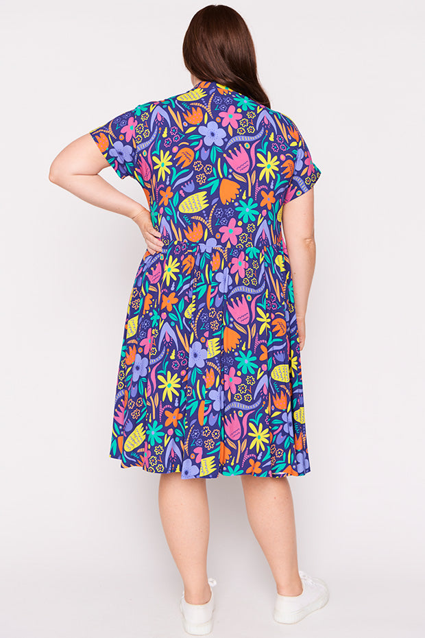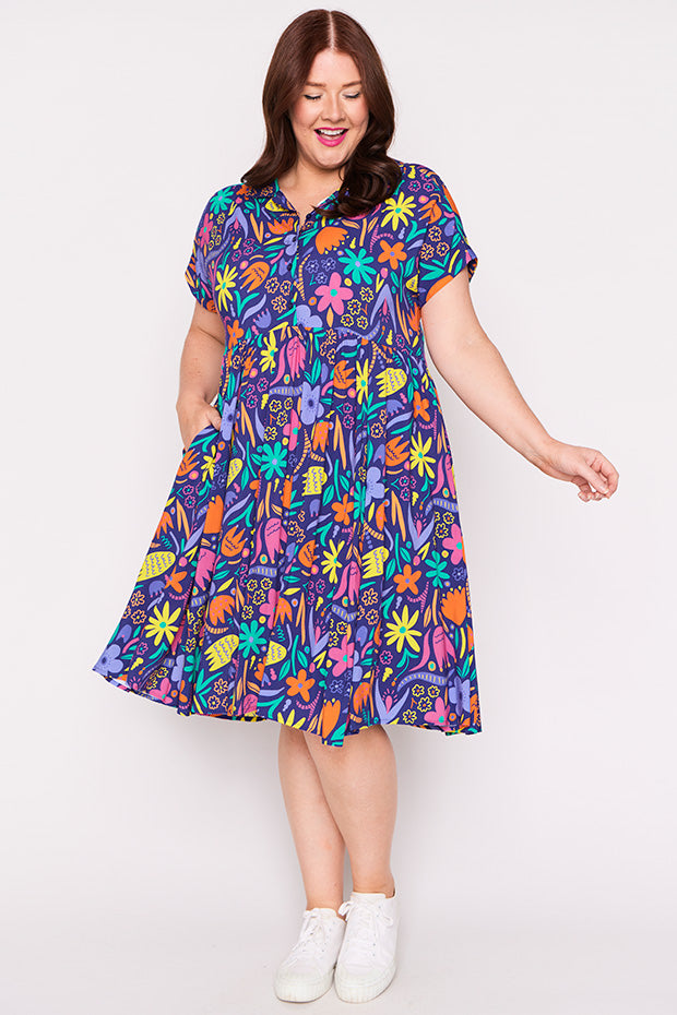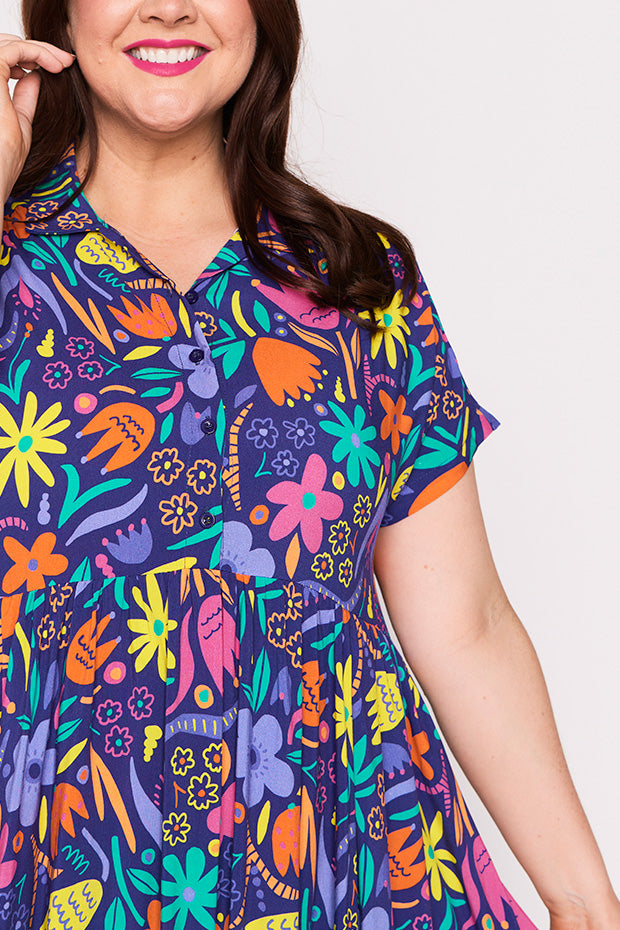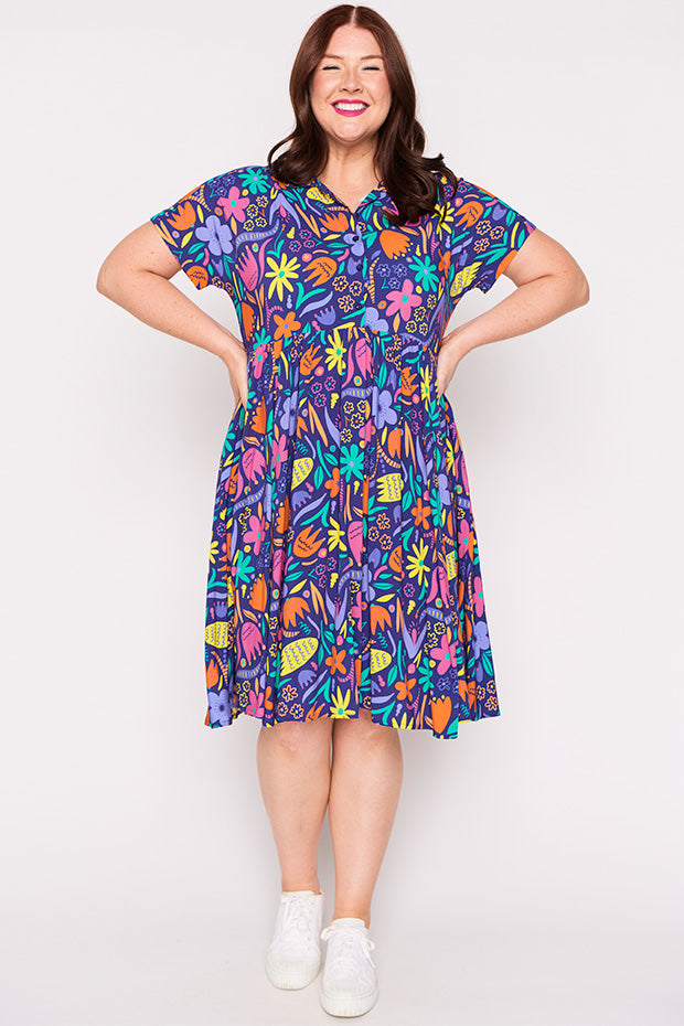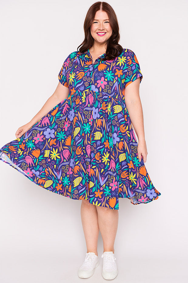 Designed in a lightweight rayon fabric, Kimba features a collared button-up shirt neckline, with short wide sleeves. It is an A-line shape, more fitted up top, then flares out into a full loose skirt with the waistline dipping at the back. And to top it all off, it has POCKETS too!